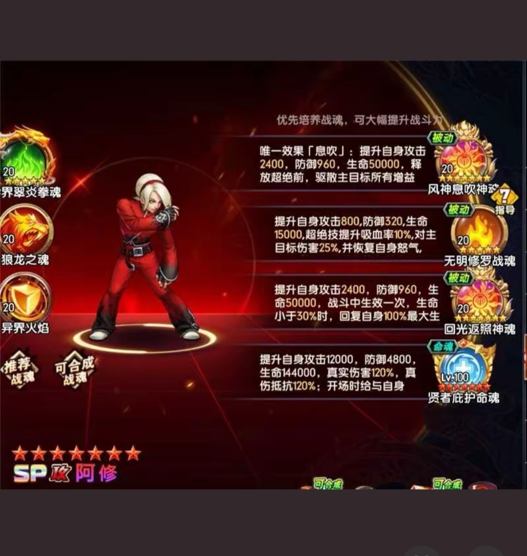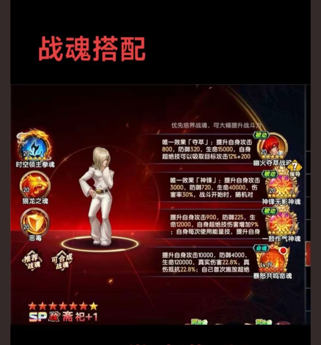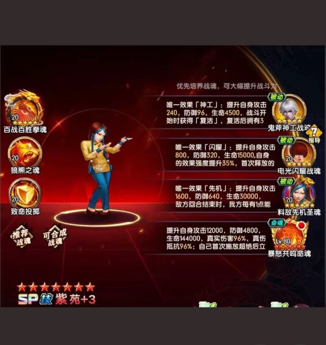 即时战斗,爽快连击,必杀技华丽且可战略打断,区别于传统卡牌回合制。 剧情背景:以三神器家族及大蛇恩怨为背景,侍魂人物穿越,拳皇大赛开启跨时空较量。 养成系统:多样养成线,丰富培养玩法,可自由组建最强战队。 系统融合:SLG玩法与卡牌结合,如抢夺资源、占领城池。