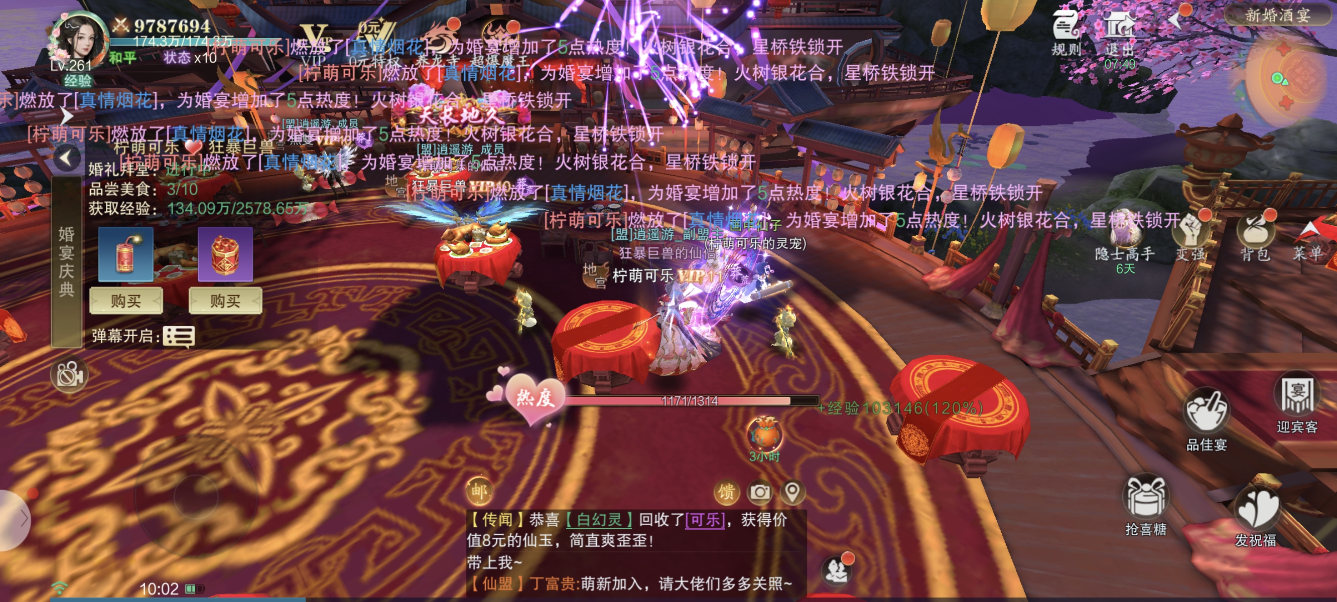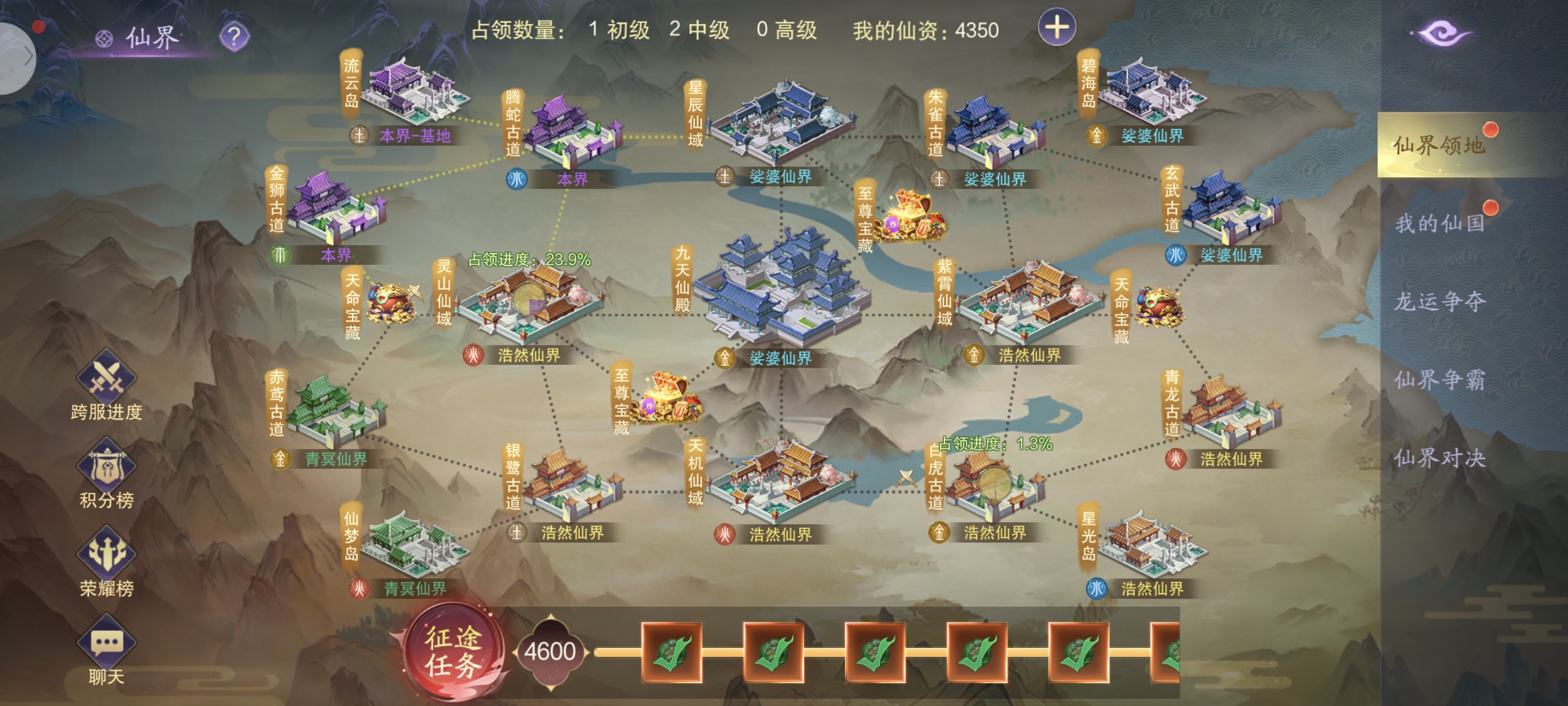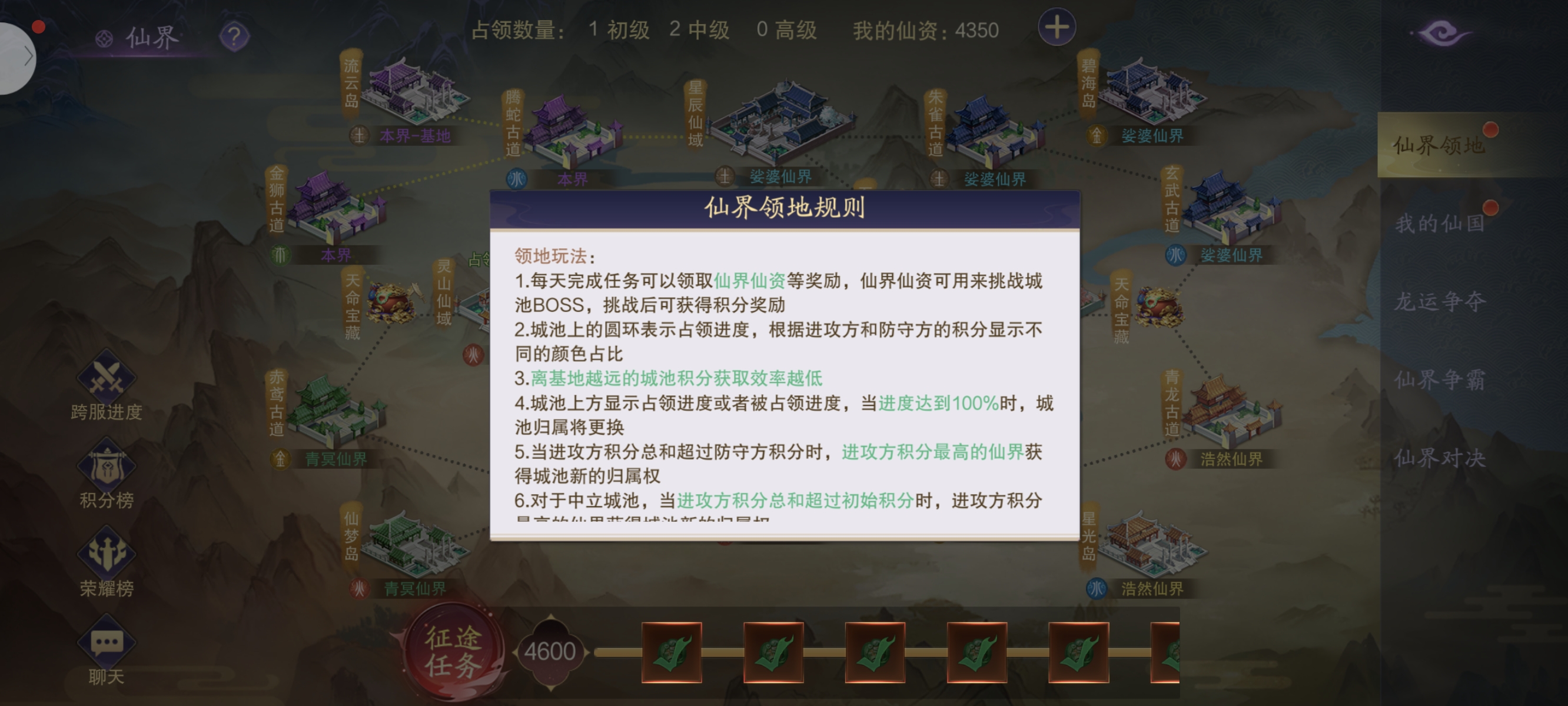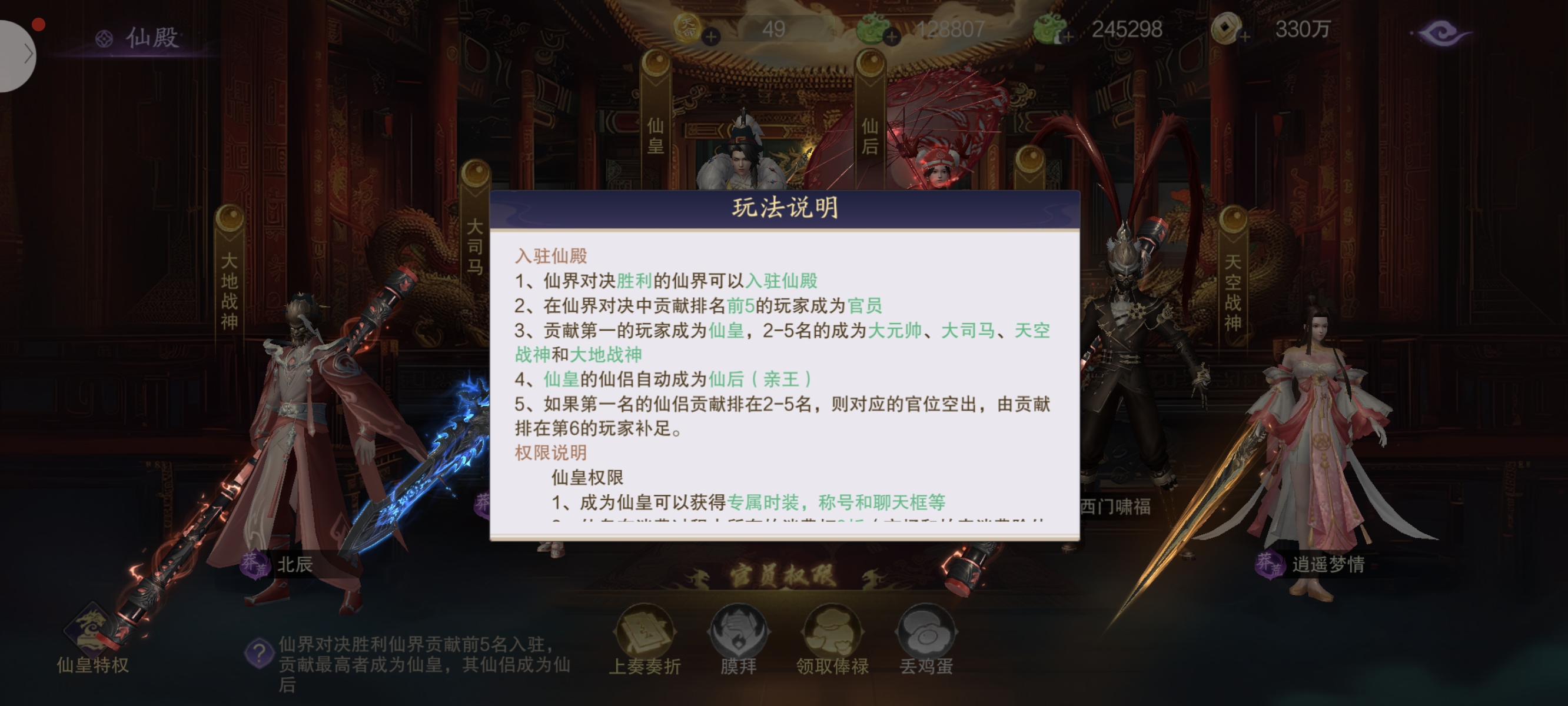 入驻仙殿1、仙界对决胜利的仙界可以入驻仙殿2、在仙界对决中贡献排名前5的玩家成为官员3、贡献第一的玩家成为仙皇,2-5名的成为大元帅、大司马、天空战神和大地战神4、仙皇的仙侣自动成为仙后(亲王)5、如果第一名的仙侣贡献排在2-5名,则对应的官位空出,由贡献排在第6的玩家补足。权限说明仙皇权限1、成为仙皇可以获得专属时装,称号和聊天框等 2、仙皇在消费过程中所有的消费打9折(市场和拍卖消费除外3、仙皇每日可以向全体玩家发一次仙界红包4、仙皇每日都享有专属俸禄5、本界成员消费后上奏给仙皇,仙皇可对其的消费进行打折(+最高9折)6、仙皇帮其他玩家刷新宝箱,必定刷出红色宝箱官员和民众权限1、官员可以领取每日俸禄2、本界成员可获得专属称号和时装奖励3、官员或者平民对仙皇膜拜或者丢鸡蛋可以获得一份奖励