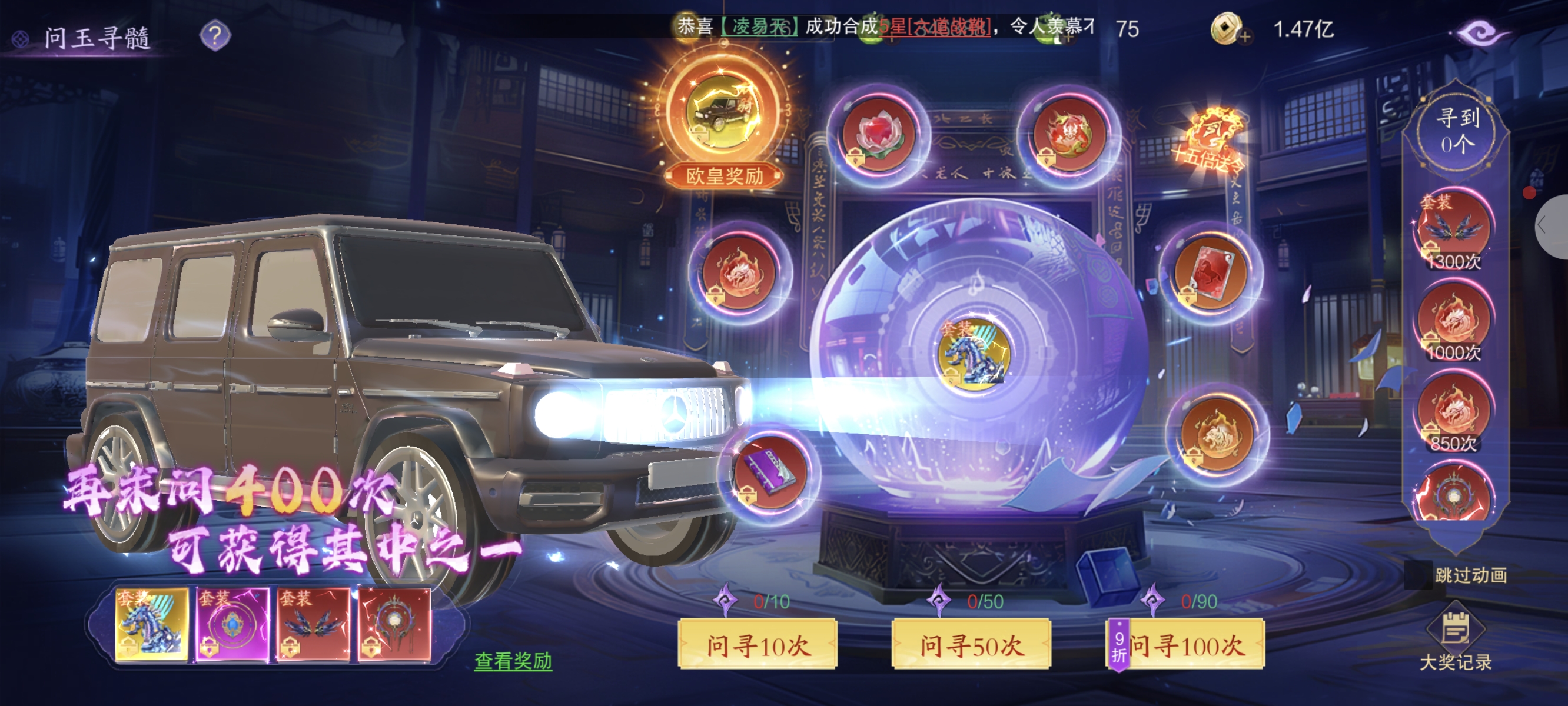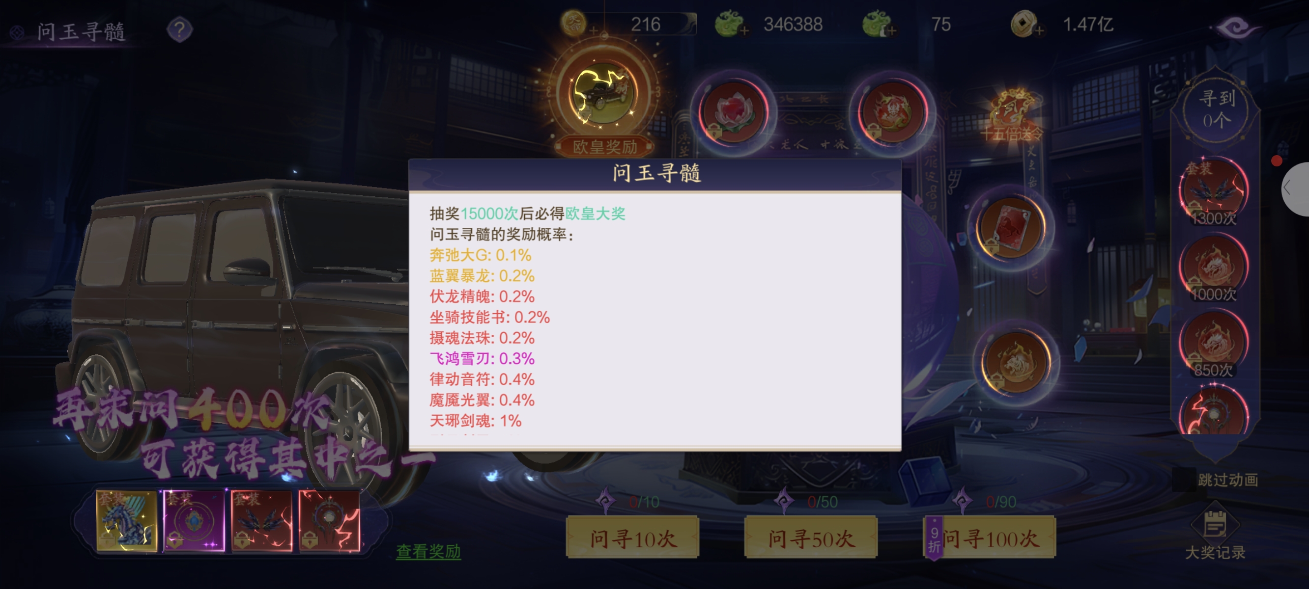 问玉寻髓玩法太有料了,奖池里居然藏着奔弛大G这种稀有奖励!玩法核心是通过问寻抽卡解锁福利,界面有问寻10次、50次和9折的100次快捷操作,再求问400次还能从指定大奖里任选其一。 +重点看爆率:奔弛大G仅0.1%,是最稀有的奖励;蓝翼暴龙、伏龙精魄、坐骑技能书、摄魂法珠都是0.2%;飞鸿雪刃0.3%,律动音符和魔魇光翼0.4%,天琊剑魂1%相对容易出。官方还保底,累计抽奖15000次必得欧皇大奖,非酋也不用怕陪跑。 +奖池里的坐骑技能书、精魄都是养成硬通货,冲奔弛大G的同时还能薅养成资源,赶紧试试手气,说不定就是下一个欧皇!