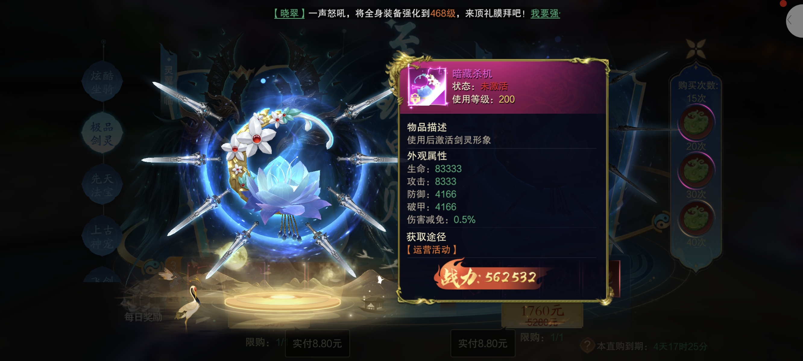 “百炼玄机”银金核心嵌着翠绿宝石,数十把流光飞剑环绕周身,幽绿光效随动作流转,战斗时剑群舒展如孔雀开屏,宛如御剑仙人踏云而来,不管是主城站街还是副本竞速,都是全场最飘逸的存在。 激活即解锁1400718战力,它提供了25万生命、2.5万攻击、1.25万防御与破甲,以及1.6%的伤害减免,高额生命与防御筑牢生存底线,攻击与破甲兼顾输出爆发,再加1.6%伤害减免,不管是前排抗伤还是后排输出,都能大幅提升实战容错率,突破瓶颈的核心选择。 使用等级需达200级,是游戏后期关键养成部件,专为打造的战力提升利器,能助力冲刺更高副本难度与PVP段位,是登顶战力榜的必备选择!
