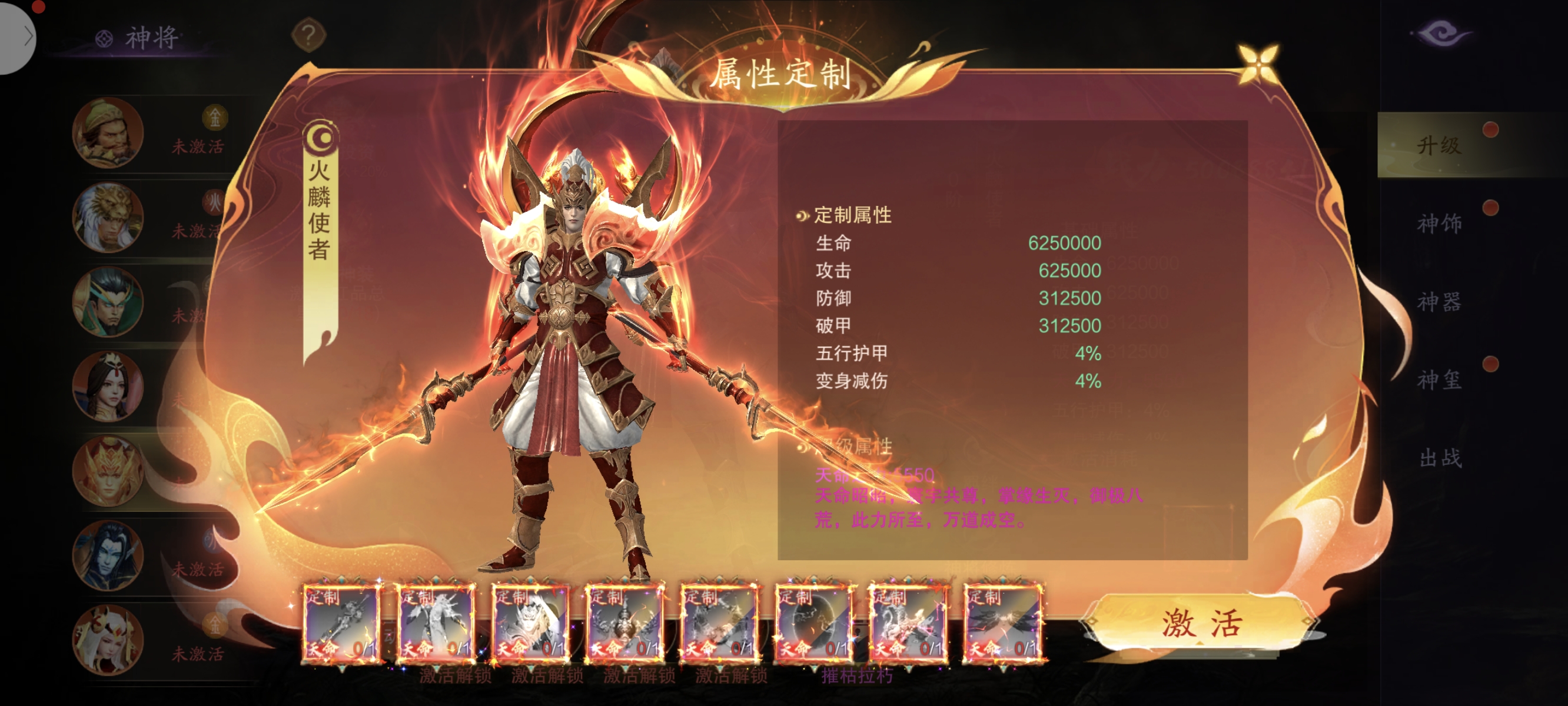 神将“火麟使者”带着属性定制功能炸场了!身披赤金战甲,周身火焰翻涌,手持双枪的造型帅到窒息,仿佛从炼狱走出的战神! +定制属性面板直接拉满:生命625W+、攻击62.5W+,防御和破甲也双双突破31.25W,再搭配4%五行护甲+4%变身减伤,攻防一体直接封神!超级属性「天命之力」同样自带霸气词条,“天命昭昭,寰宇共尊”,这排面直接拉满! +最香的是,这是游戏里首个支持属性定制的神将!你可以根据自己的战斗风格,自由调整属性偏向,无论是极限输出还是肉盾站场,都能一键适配。多余的道具还能用于升星,养成空间直接拉满!20级即可解锁。