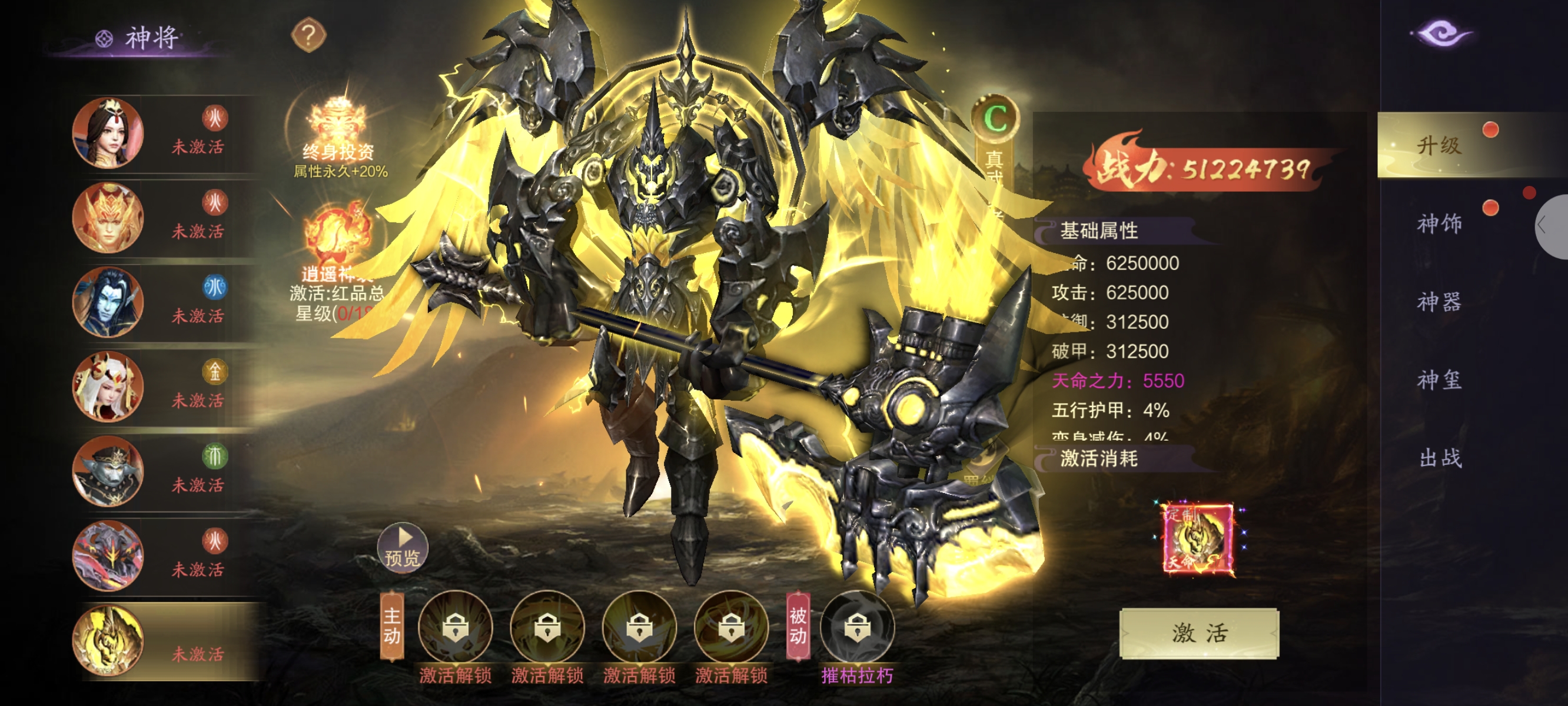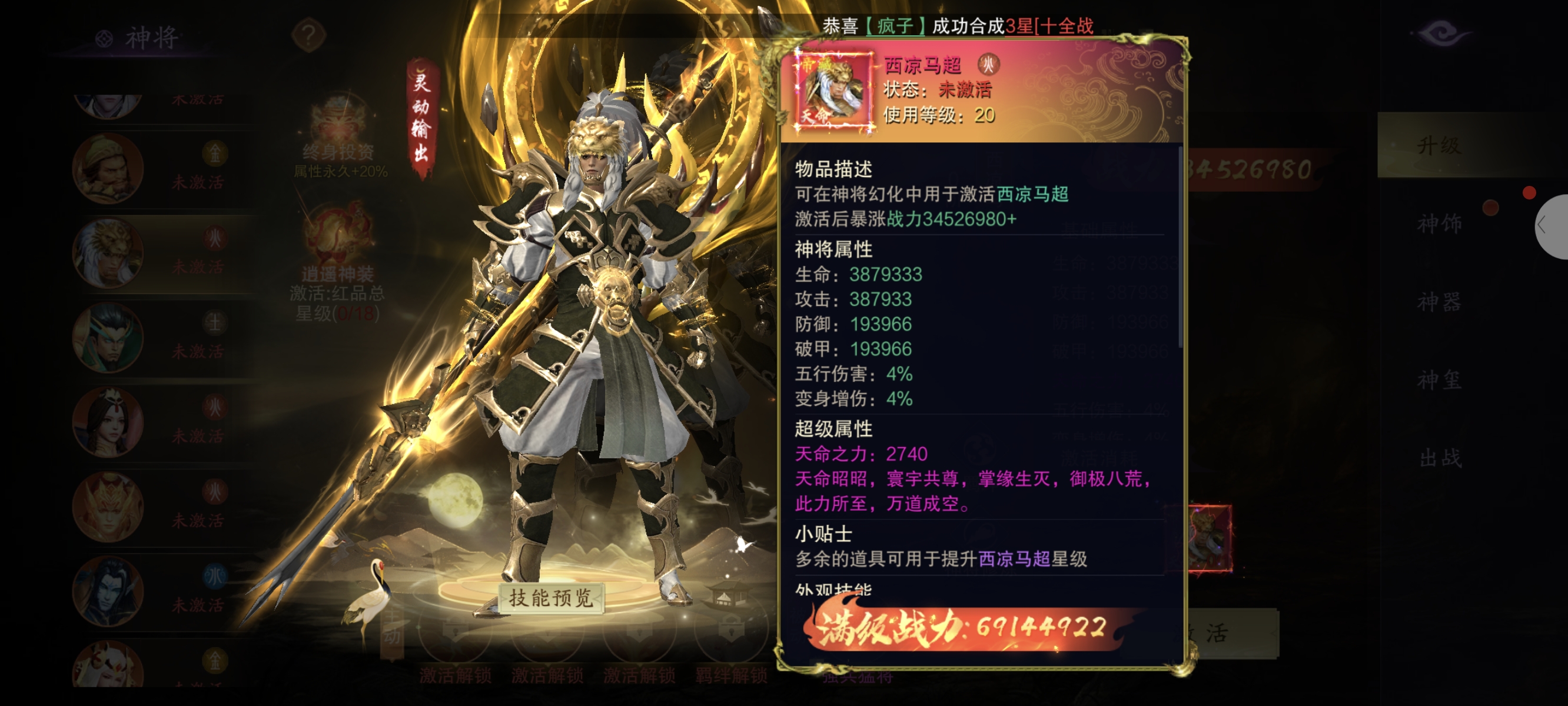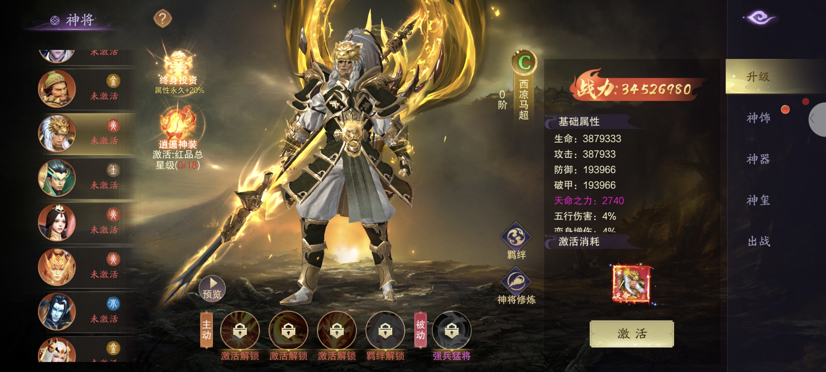 “西凉马超”定位为“灵动输出”,激活立涨3452万+战力,满级更能冲击6914万+战力天花板,让你在排行榜上一路狂飙! +输出炸裂:387万攻击+193万破甲,配合4%五行伤害,瞬间撕碎敌方防线 +身板过硬:387万生命+193万防御,叠加4%变身增伤,输出同时从容抗伤 天命加持:2740点天命之力,解锁超强增益,让你的战斗体验直接起飞 超身披金色狮首战甲,手持长枪,造型威猛,符合“西凉锦马超”之名。其技能描述“天命昭昭,寰宇共尊,掌缘生灭,御极八荒”进一步强化了其神格地位。对于追求极致输出与视觉冲击的玩家,马超无疑是值得优先培养的神将。 +多余道具还能直接升星,养成零浪费!无论是跨服争霸、副本攻坚还是抢BOSS,马超都能成为你最锋利的矛和最坚固的盾。