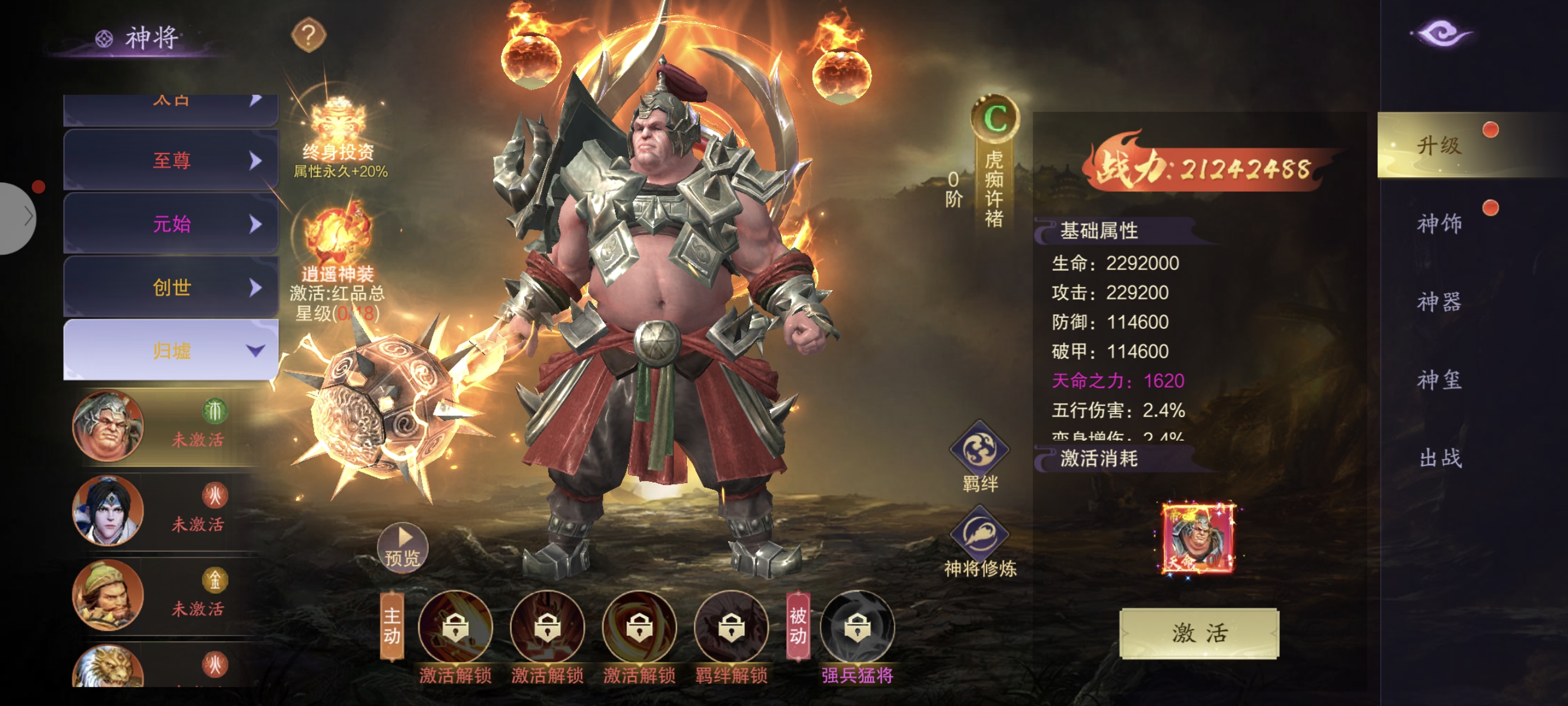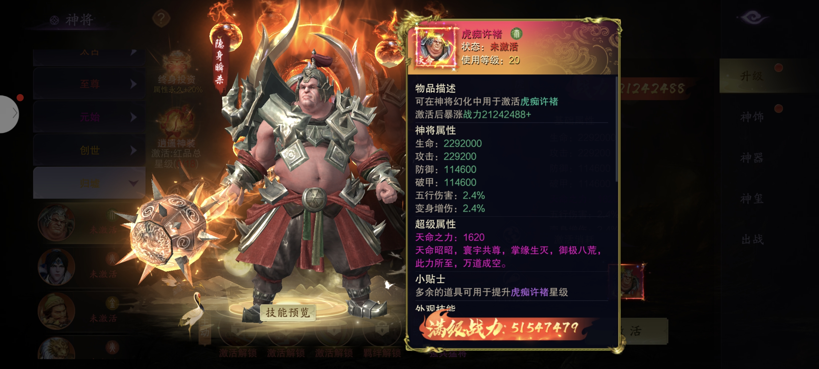 “虎痴许褚”震撼降临,激活即可暴涨2124万+战力,满级直冲5154万,堪称隐身瞬杀流的天花板! 基础面板:生命229.2万、攻击22.92万、防御11.46万、破甲11.46万,攻防均衡,能抗能打。 实用加成:五行伤害+2.4%、变身增伤+2.4%,配合天命之力1620的超级属性,输出能力直接拉满。 定位亮点:作为“隐身瞬杀”神将,许褚能悄无声息切入敌阵,凭借高爆发伤害瞬间收割,无论是PVP还是PVE都能打出奇效。 20级即可解锁,多余道具可用于升星强化,进一步提升技能伤害与隐身时长。不管是开荒推图还是竞技场冲榜,这位曹魏猛将都能成为你的破局利器!