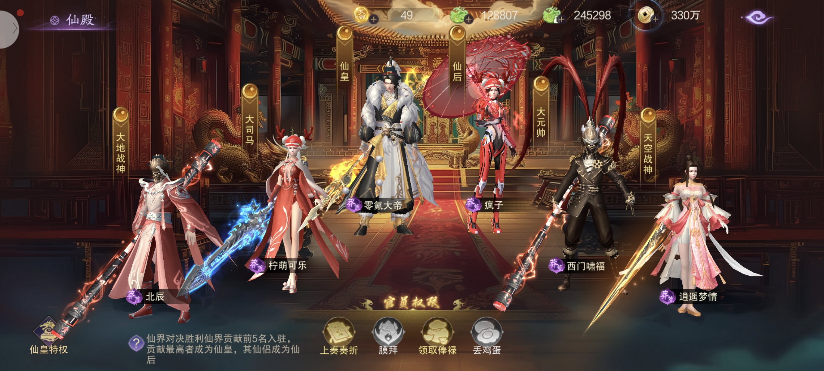 只有在仙界对决中获胜的仙界,才有资格入驻仙殿,开启权柄之争。这是仙界对决胜利后的专属荣耀舞台! 在仙殿体系中,仙界对决贡献排名前5的玩家将直接获得官职:贡献第一的玩家将成为至高无上的仙皇,2-5名则依次成为大元帅、大司马、天空战神与大地战神。仙皇的仙侣还将自动获得仙后(亲王)的尊贵身份。若仙皇仙侣的贡献恰好排在2-5名,对应的官职将由贡献第6的玩家递补,确保仙殿体系完整运转。 +成为仙皇不仅拥有专属时装、限定称号与定制聊天框,更能执掌仙殿核心权限;其他官员也可领取俸禄、接受全服仙友膜拜。全服仙友还能通过“上奏奏折”“丢鸡蛋”等趣味玩法参与互动,共同影响仙殿生态。