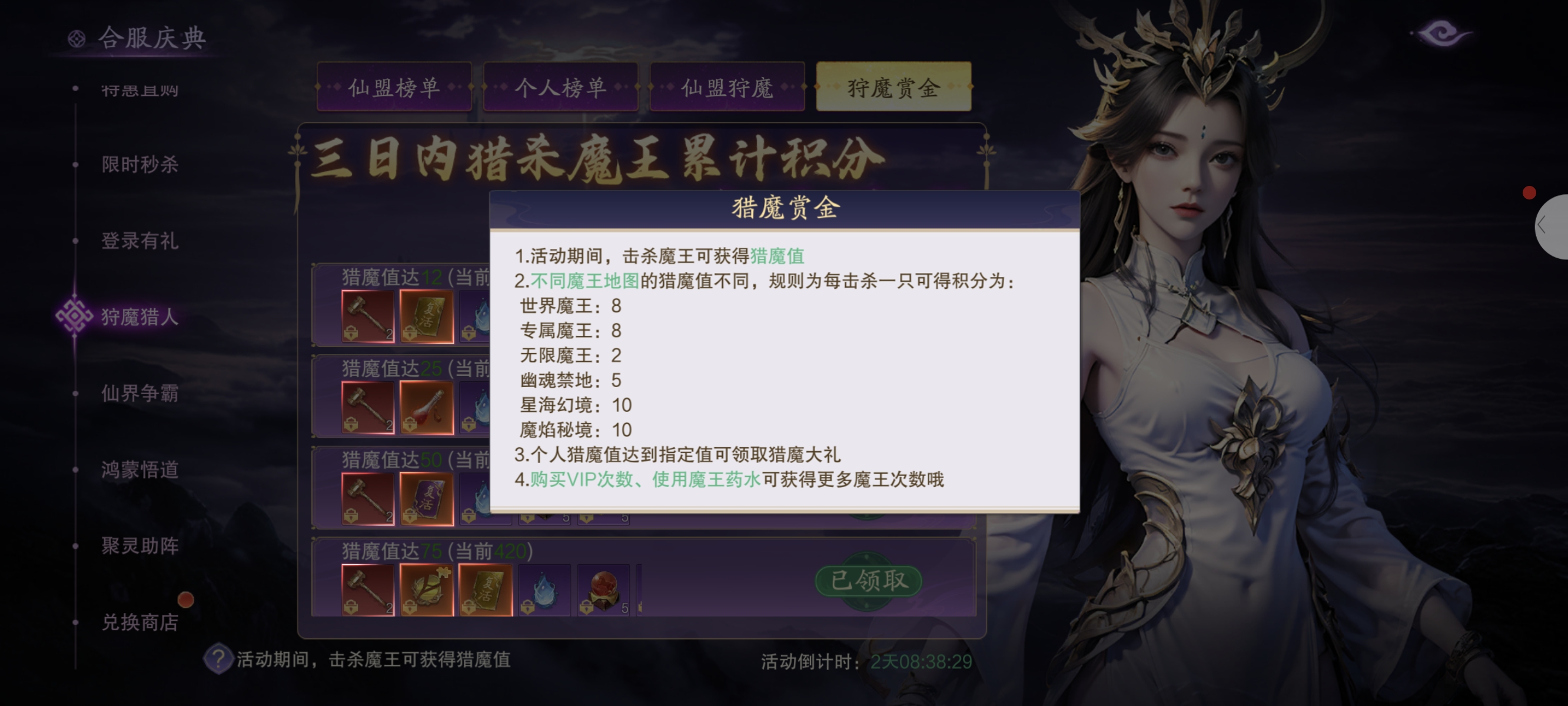 “狩魔猎人”是合服庆典中以猎杀魔王为核心机制的积分制活动。需在3天活动期内,通过击杀不同地图的魔王积累“猎魔值”,达到指定数值即可领取对应档位的奖励。尚未完成目标的需抓紧时间。 从奖励设置来看,活动分为多个猎魔值档位,如12、25、50、75等,每个档位对应不同资源奖励,包括强化锤、复活道具、灵气、宝石及神秘宝箱等。猎魔值越高,奖励越丰厚。 根据玩法说明,不同地图的魔王掉落猎魔值不同:世界魔王和专属魔王每只8点,无限魔王2点,幽魂禁地5点,星海幻境和魔焰秘境则为10点。可通过优先挑战高价值地图,或使用VIP次数、魔王药水等方式增加狩猎频率,快速积累积分。 尚未达成目标的,合理规划每日狩猎路线,优先选择高积分地图,并利用辅助道具提升效率。对于已达成目标的,可将剩余时间用于其他活动,最大化收益。该玩法不仅考验玩家的输出能力,更强调资源规划与时间管理,是合服期间快速获取养成资源的重要途径。