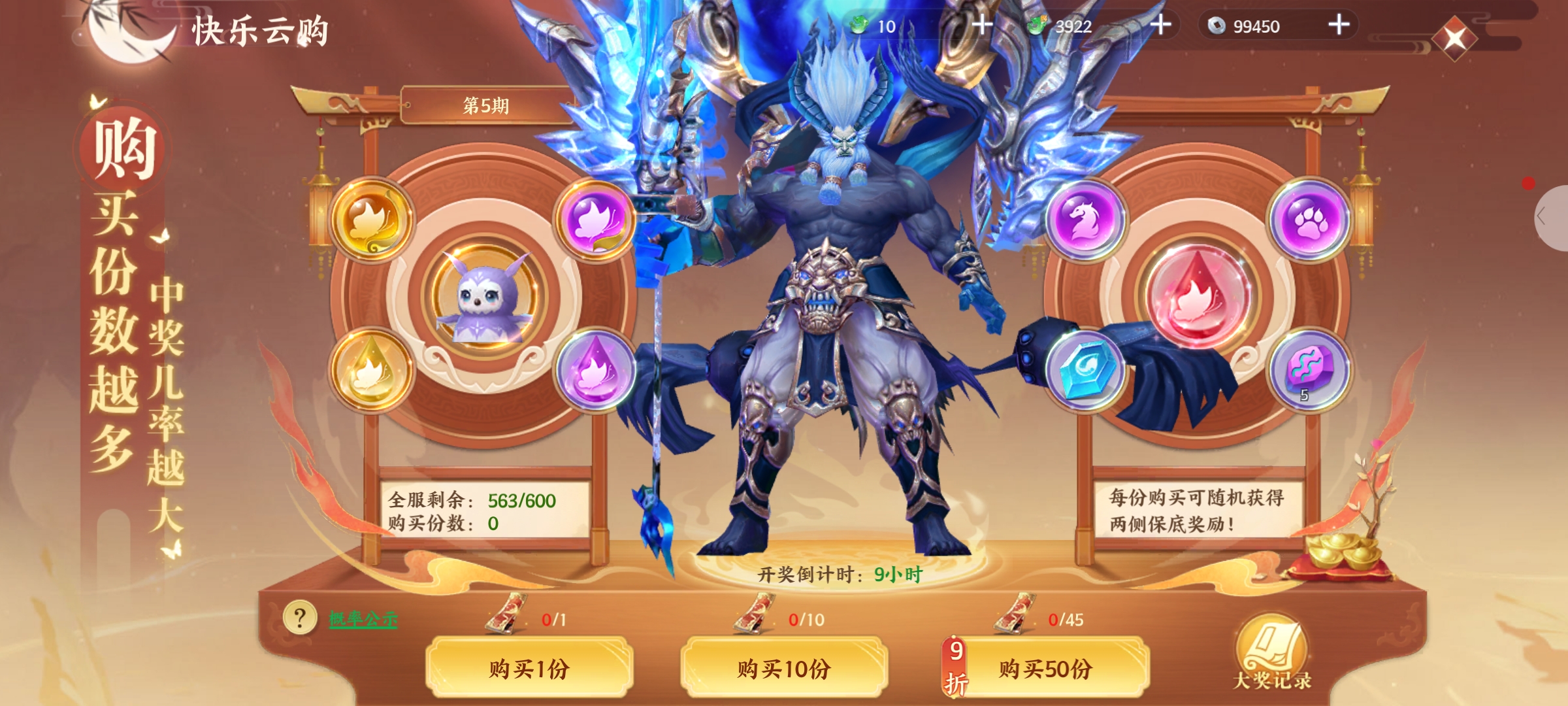 云购份数越多,中奖几率越大,云购每天可开启多轮,一轮开奖后立即开启下一轮,每轮都有一份大奖,盖伦分数被买完时立即开奖,每轮中购买的分数越多,中奖的几率越大,无论是否中最后的大奖,每次购买份数都会随机获得一份保底奖励