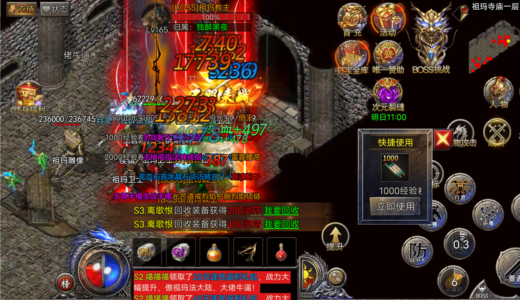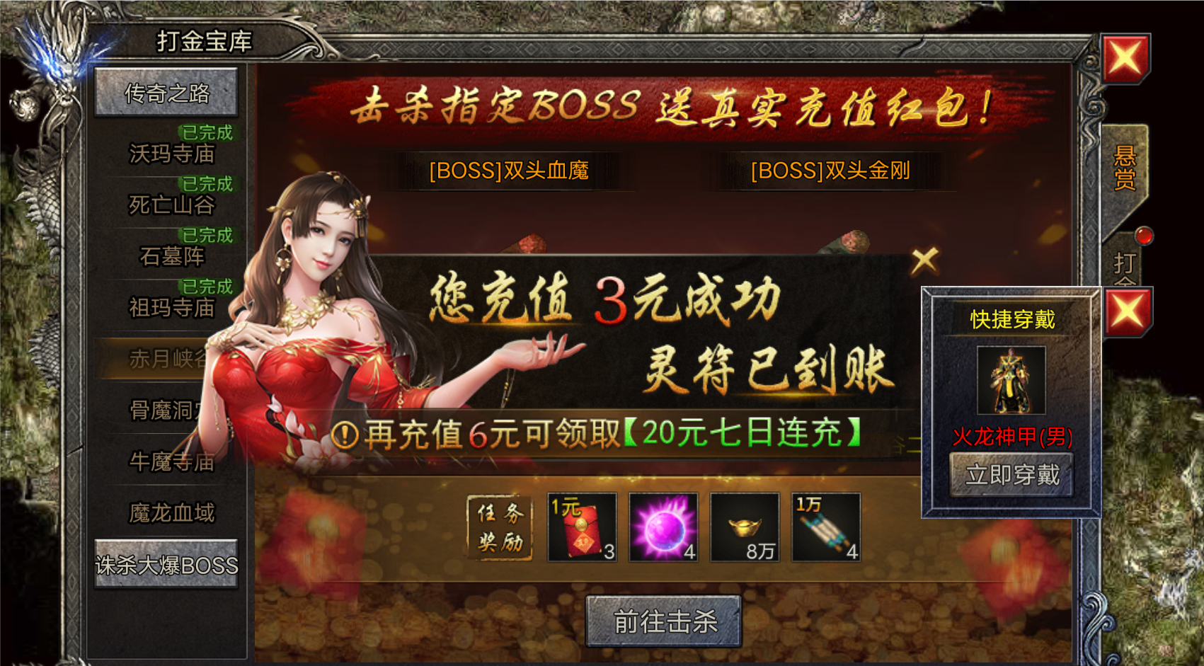一句话总结这个游戏:不停的升级,不停的捡装备。升级丹一直库库往外爆,还能够兑换红包进行充值。离线挂机也有大量的经验,试玩规定的门槛200级很容易就达到了,这是平台白送的福利吧