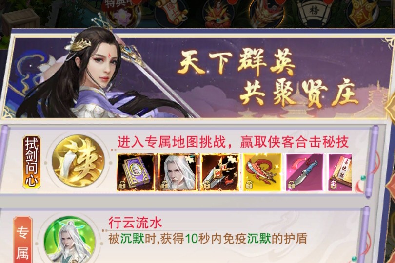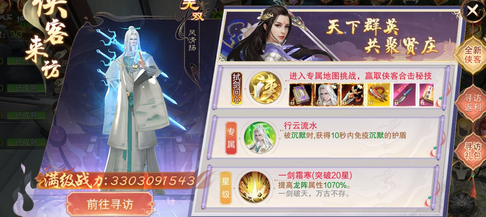 天下群英共聚贤庄,想要风清扬的友友们可以下手了,激活侠客后通过侠拭剑问心可以进入专属地图进行挑战,赢取侠客合击秘技,专属技能行云流水被沉默时获得10秒内免疫沉默的护盾,通过星级提升到了20星也就满级了激活一剑霜寒提高龙阵属性1070%一剑破天万古不存。。