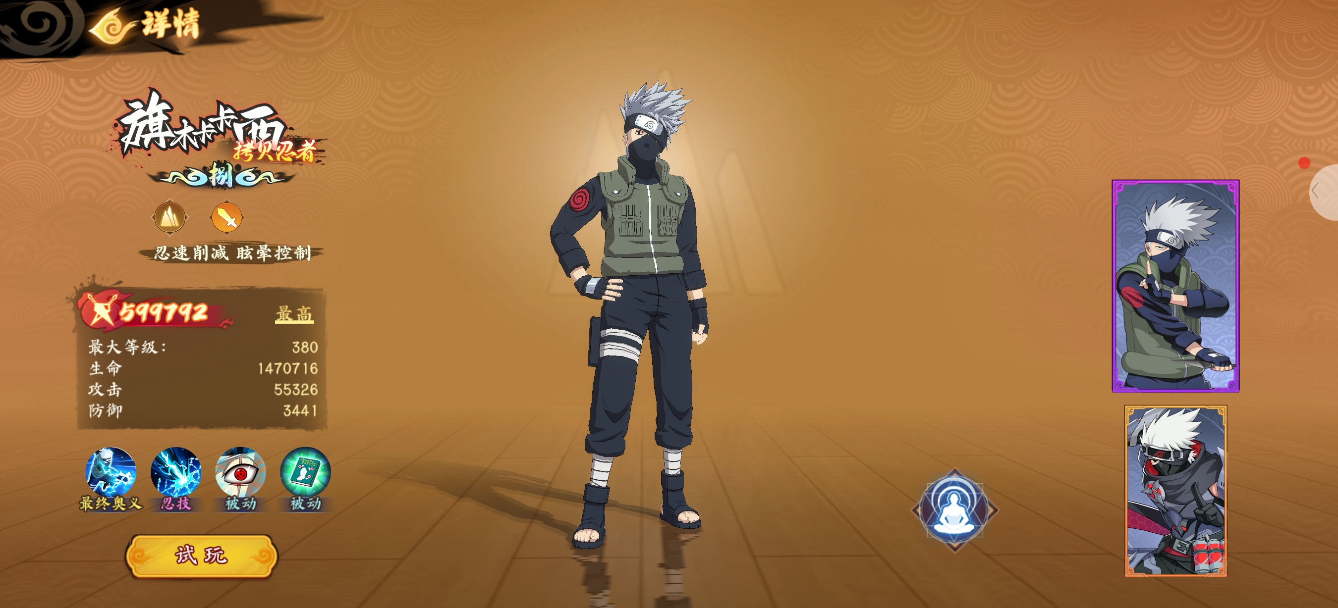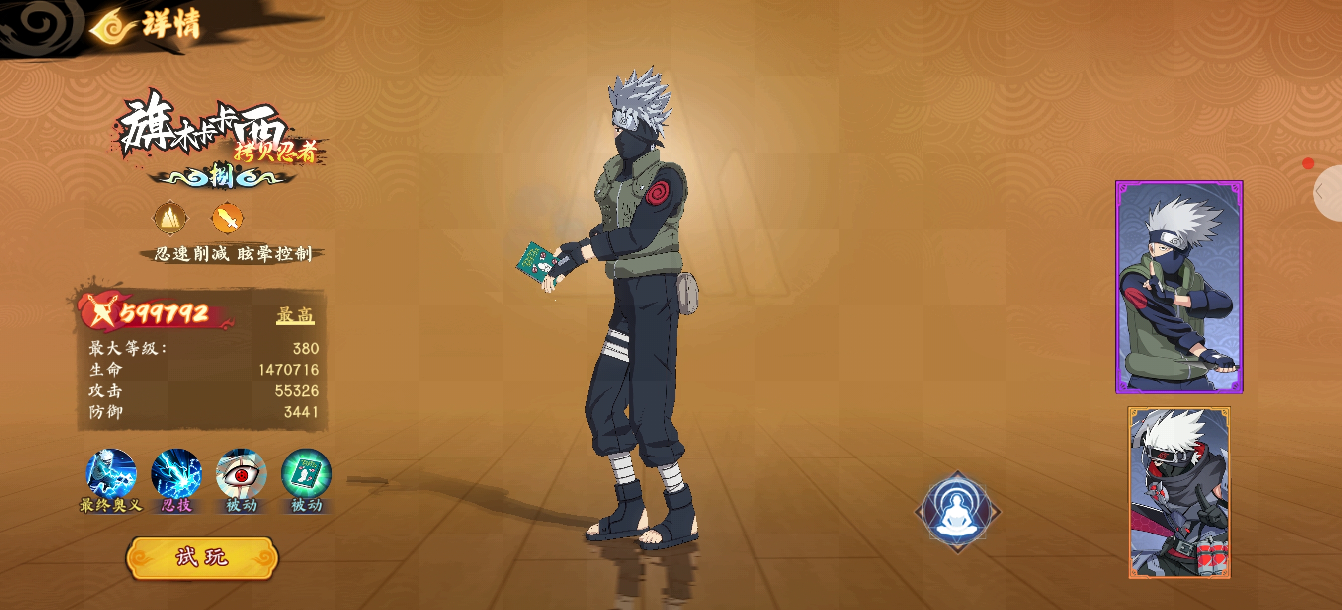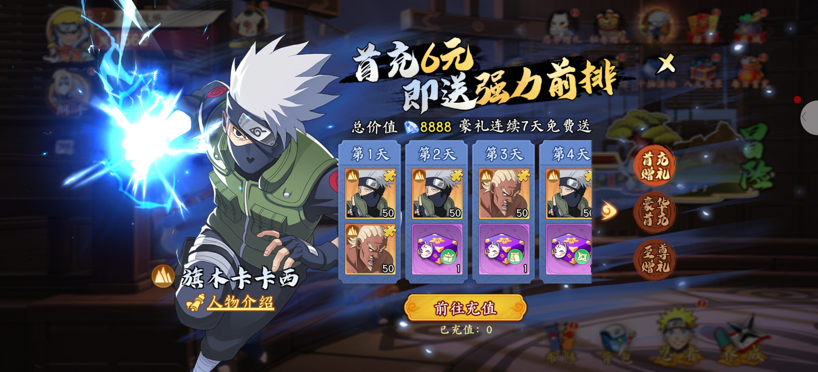 忍界豪礼重磅登场!首充6元即可解锁强力前排忍者旗木卡卡西,这位银发暗部精英将为你冲锋陷阵!更有总价值8888的豪礼连续7天免费派送,每日登录就能领取丰厚奖励,助你在忍界战场一路高歌!最大等级380级的旗木卡卡西,以599792的高额战力傲立忍界!147万+生命、5.5万+攻击,搭配忍速削减、眩晕控制的强力机制,无论是单体突袭还是团队控场,都是不可忽视的战力!