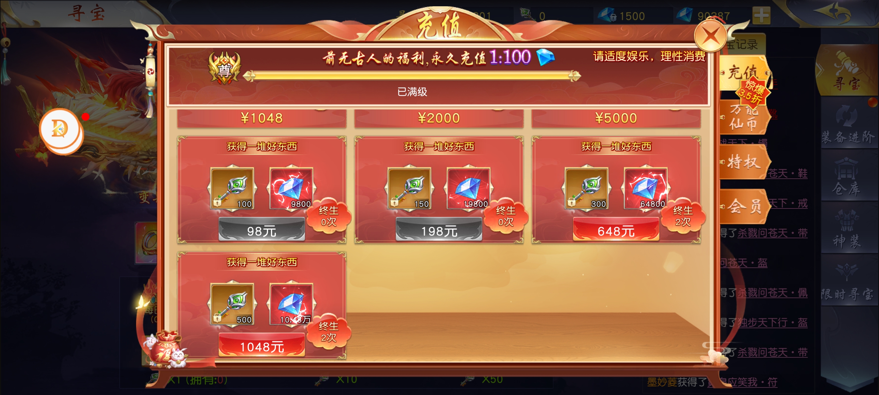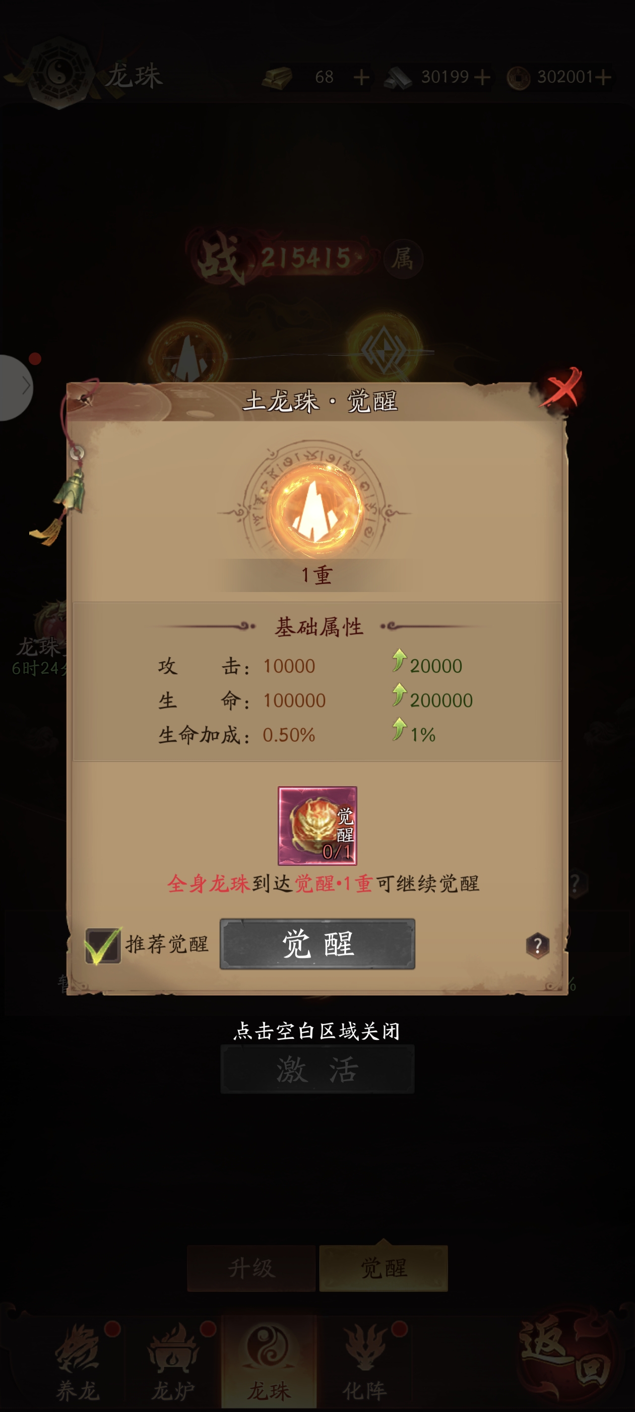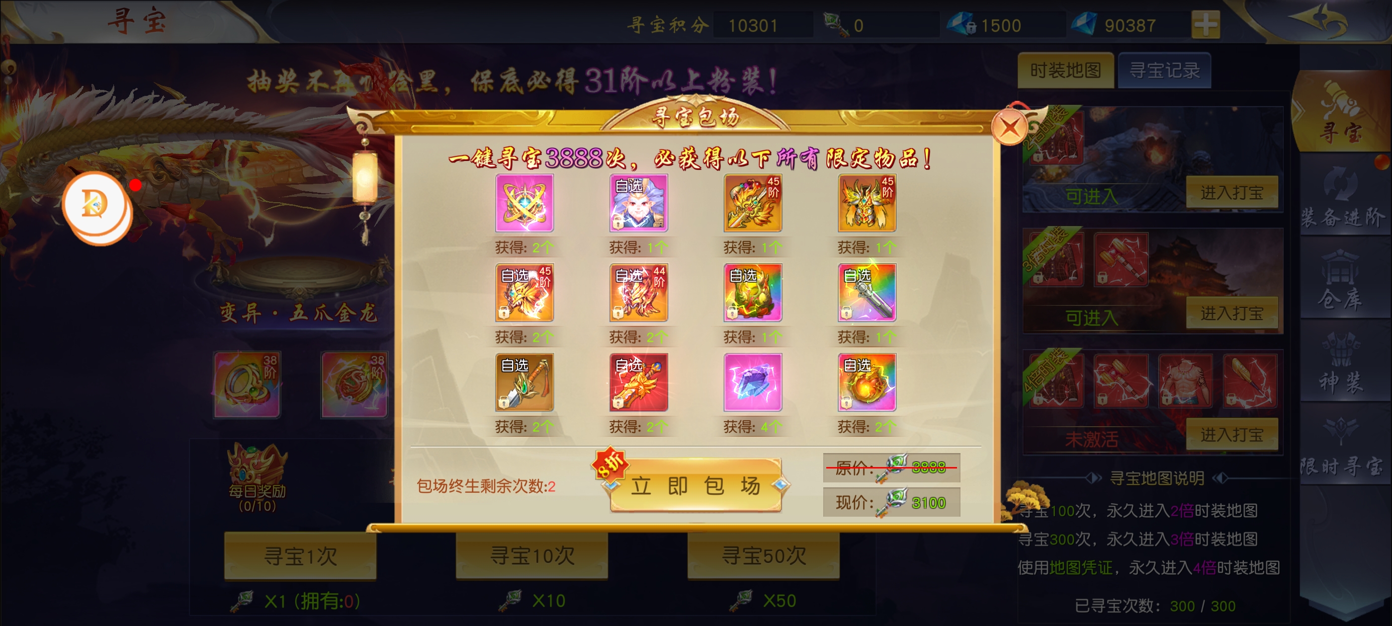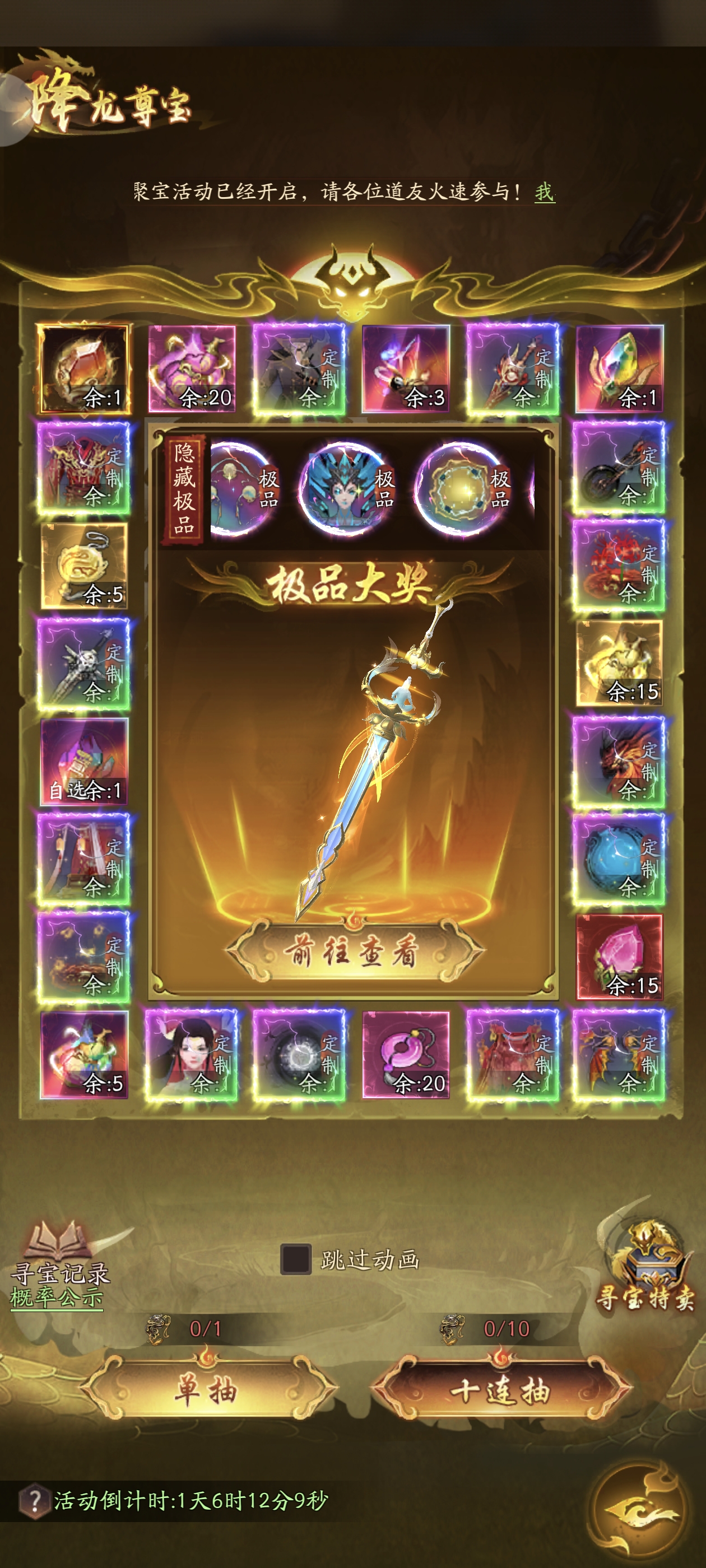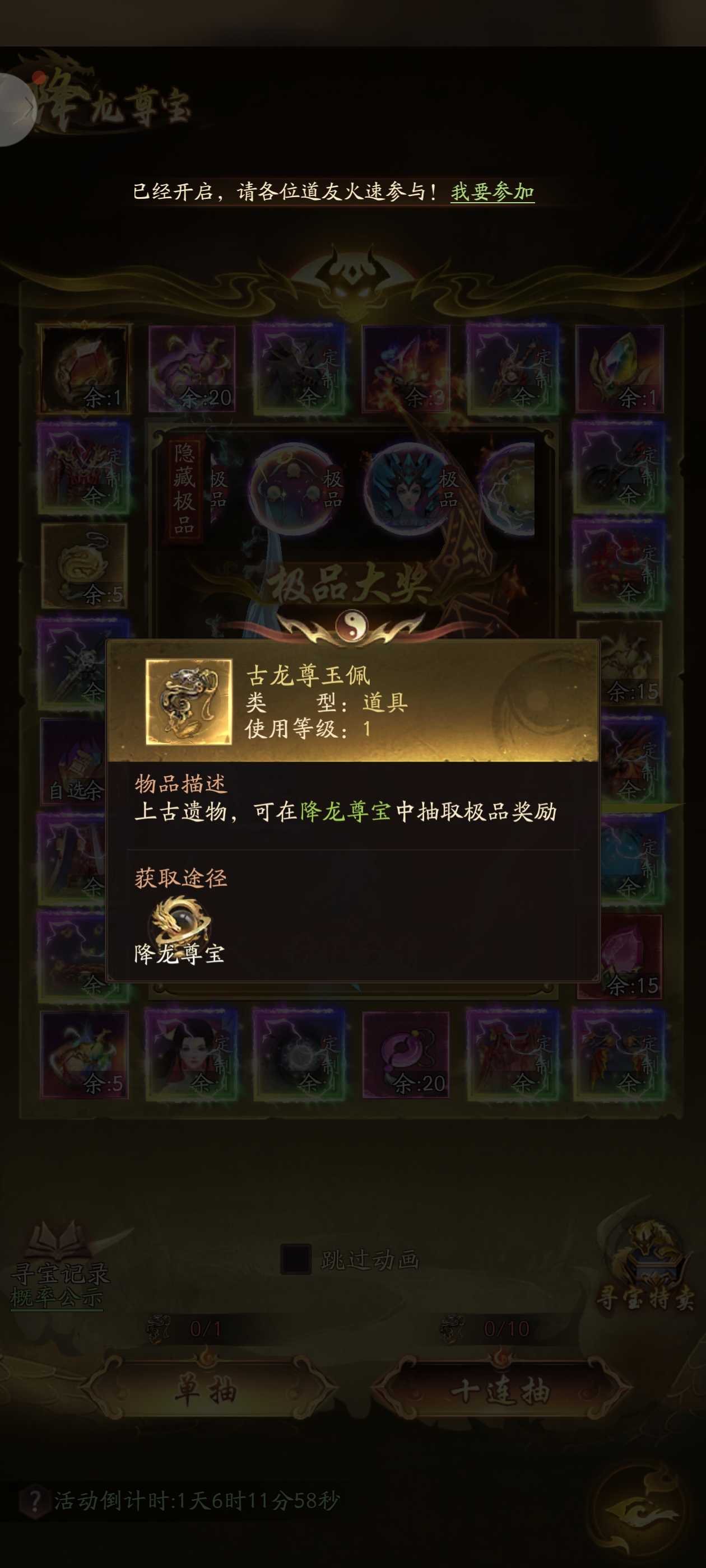 活动期间消耗古龙尊玉佩进行奖励抽取,道具由寻宝特卖获取,道具永久有效。 +奖池数量:界面奖励的数量为本轮奖池的总奖励数量,奖励采取不放回机制,每抽取1次则从奖池中减少1个奖励物品。 +奖池重置:本轮奖池内化形道具全部抽空后(不含隐藏款),奖池所有奖励会进行刷新重置,可继续进行下轮抽取。 +隐藏大奖:每抽均有概率额外获取本期隐藏极品套装奖励!隐藏极品奖励不占用道具抽数,为额外掉落! +奖励概率详见[概率公示]具体界面说明。 +寻宝特卖:每个特卖档位设有限购次数,限购次数为0该档位不可继续购买,特卖活动仅跟随降龙尊宝活动开启。