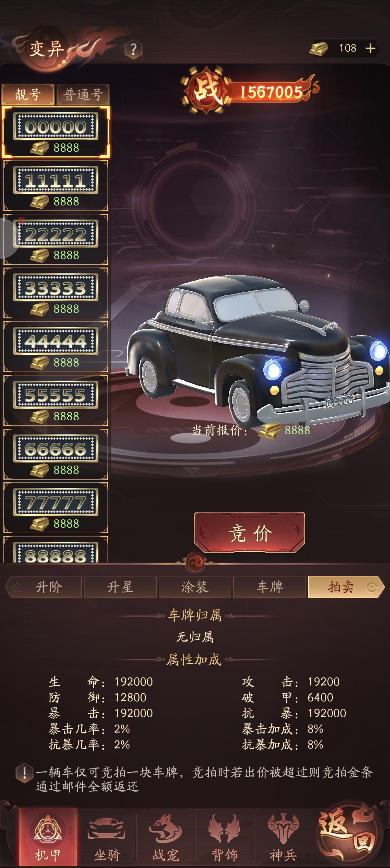 车牌拍卖为跨域拍卖,出价高者获得车牌的使用权 +只有激活了双人坐骑才能参与车牌拍卖,激活了多少个双人坐骑就可参与多少个车牌的竞价 +出价最高的人立即获得车牌的使用权,如果出价被其他人超过立即失去该车牌的使用权,参与拍卖的金条通过邮件返还。 +拍卖获得常用车牌之后,如果想获得靓号车牌可以使用已获得的常用车牌额外补充部分金条参与靓号车牌拍卖。 +不同车牌的属性不同,车牌号越好增加的属性越高 +一个车牌只能一个人拥有,合服或者是大跨服调整导致多个人拥有同一个车牌,出价最高的人获得车牌使用权,其他人参与拍卖的金条通过邮件返还