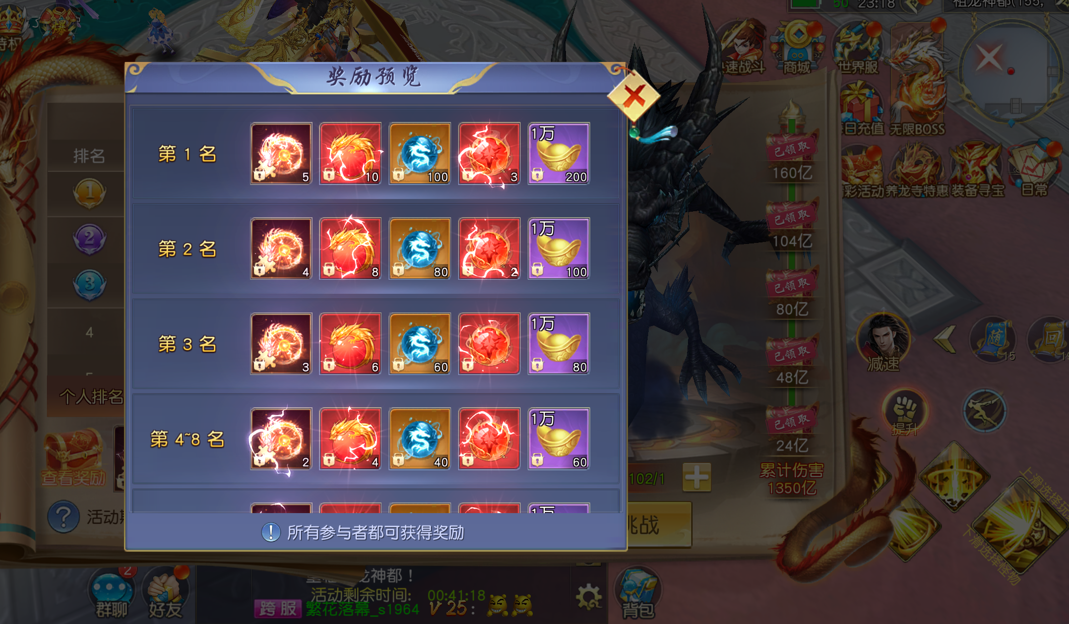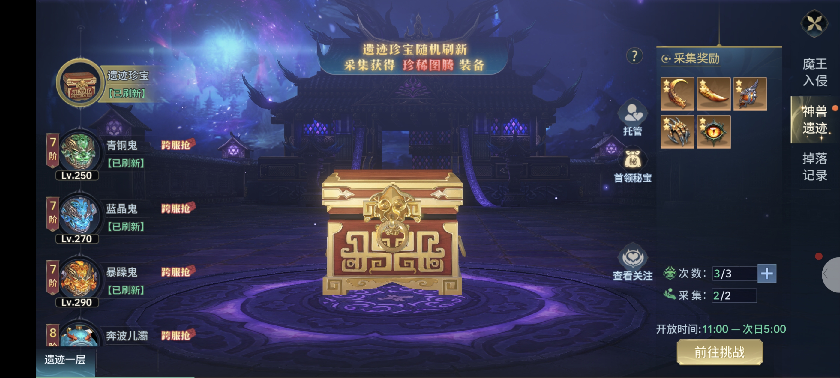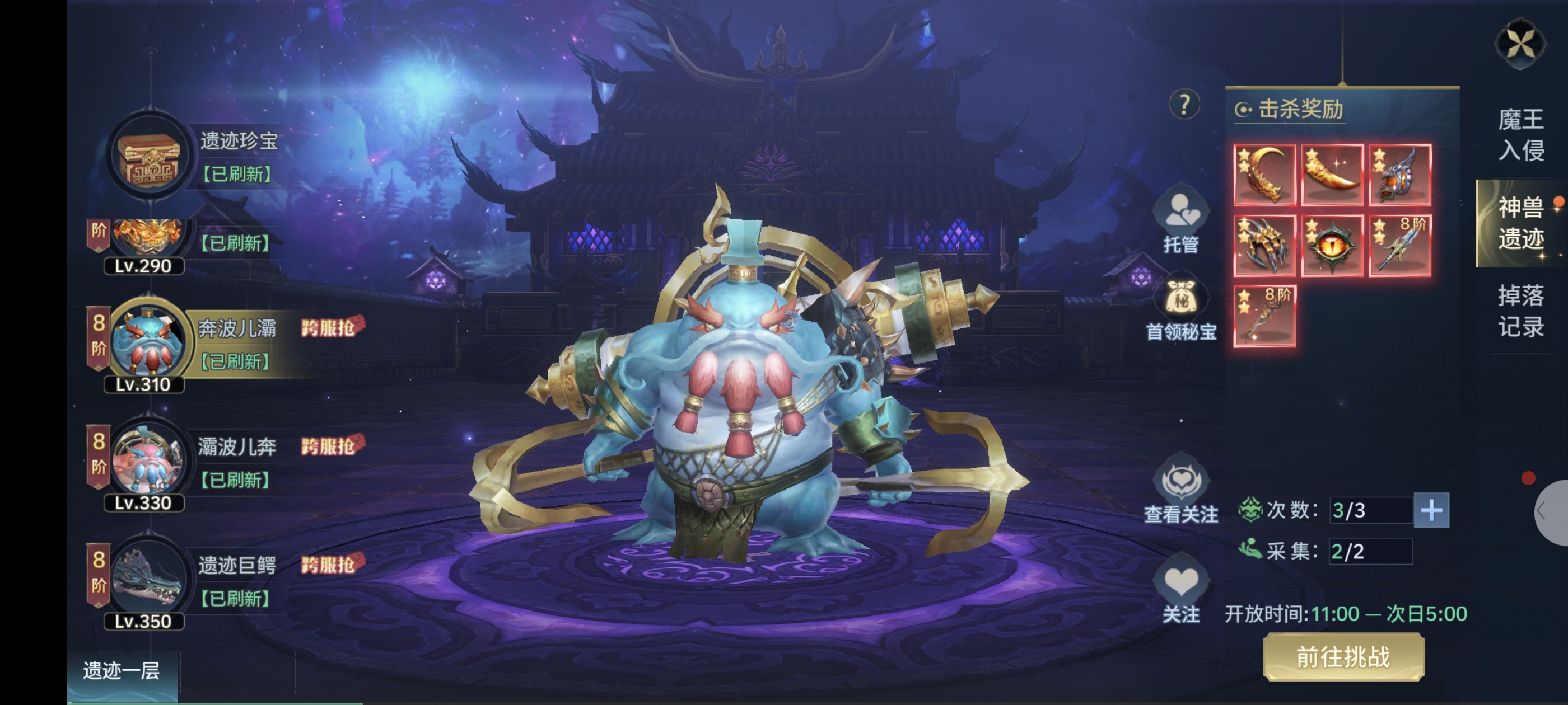 每期开启前30分钟,每期结束前的20分钟均为休赛期,玩家无法进入挑战。 +活动开启后,根据各个服的具体情况划分为若干跨区,每个跨区内所有玩家的怪物与属性都相同。 +每期同时开启3个首领,每个首领有5个难度[简单][普通][困难][噩梦][地狱],前置难度首通后方可解锁下一难度。 +挑战首领可获得积分,结算期根据积分排名,按照排名先后发放奖励。伤害越高,积分越多。 +排名积分为所有首领的所有难度历史最高积分总和。+玩家每日有5次挑战次数,每日00:00重置。 +每次挑战结算时,玩家可选择是否保存本次战斗结果,保存扣除本次挑战次数,积分只录入历史最高积分。 +活动每期排名奖励在活动结束后次日00:00点通过邮件发送。 +当天未使用挑战次数累计到第二天,挑战次数最多累计10次。
