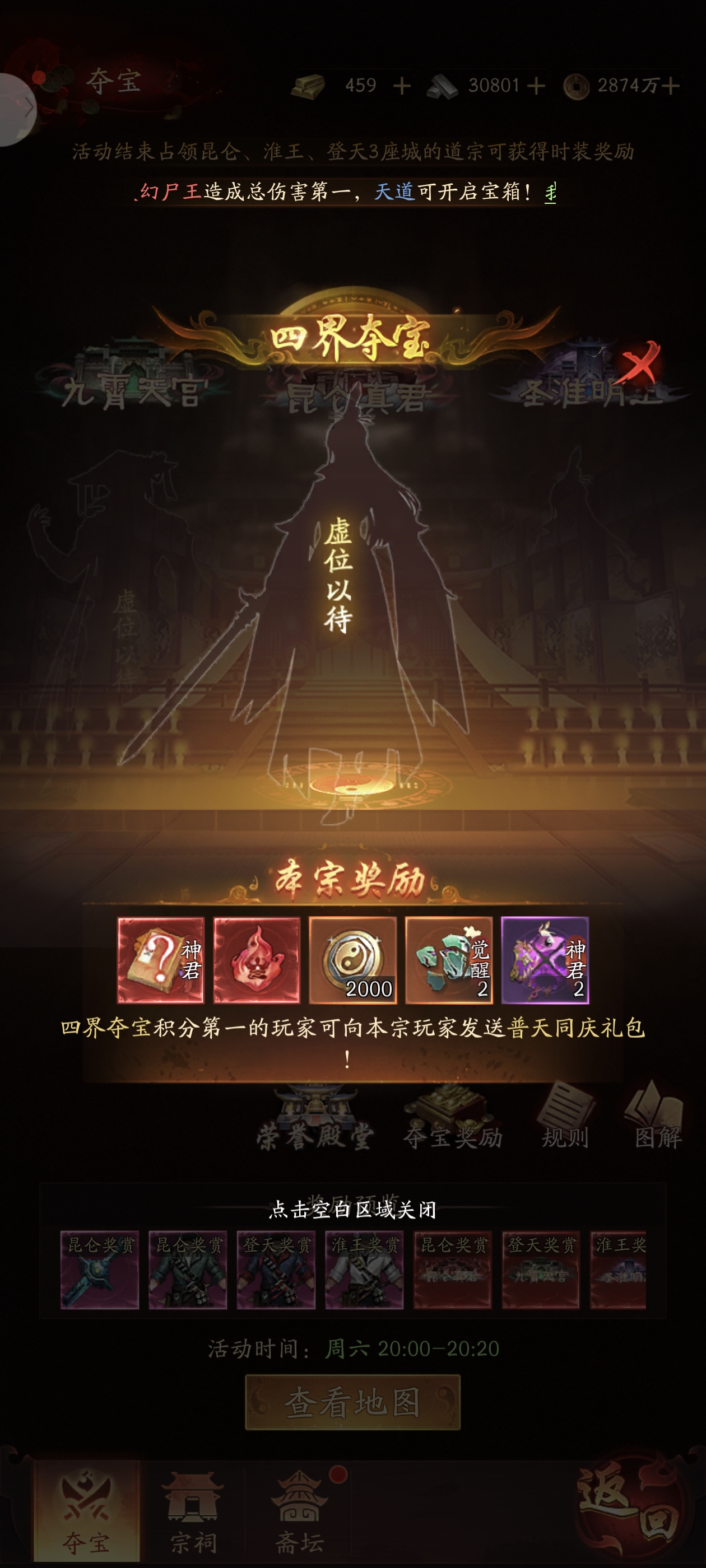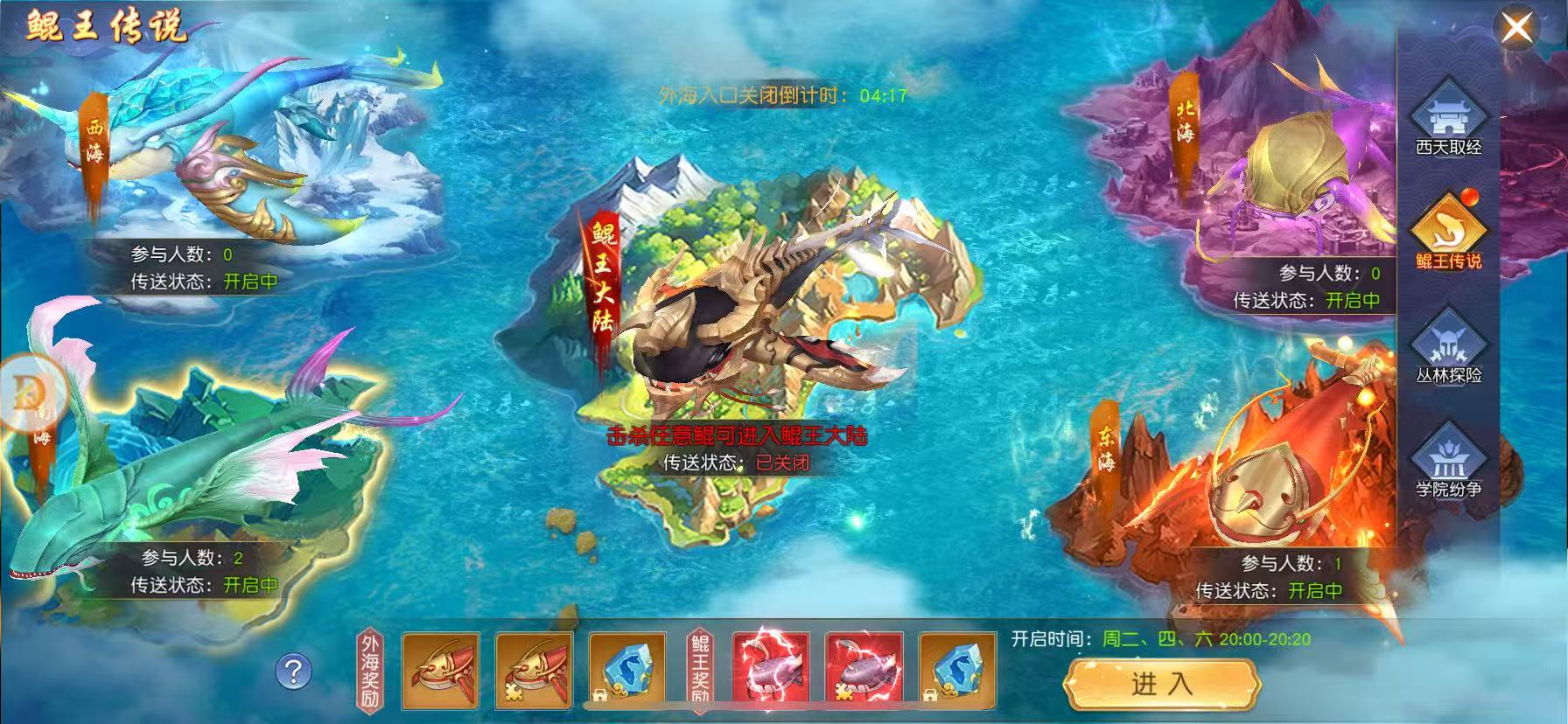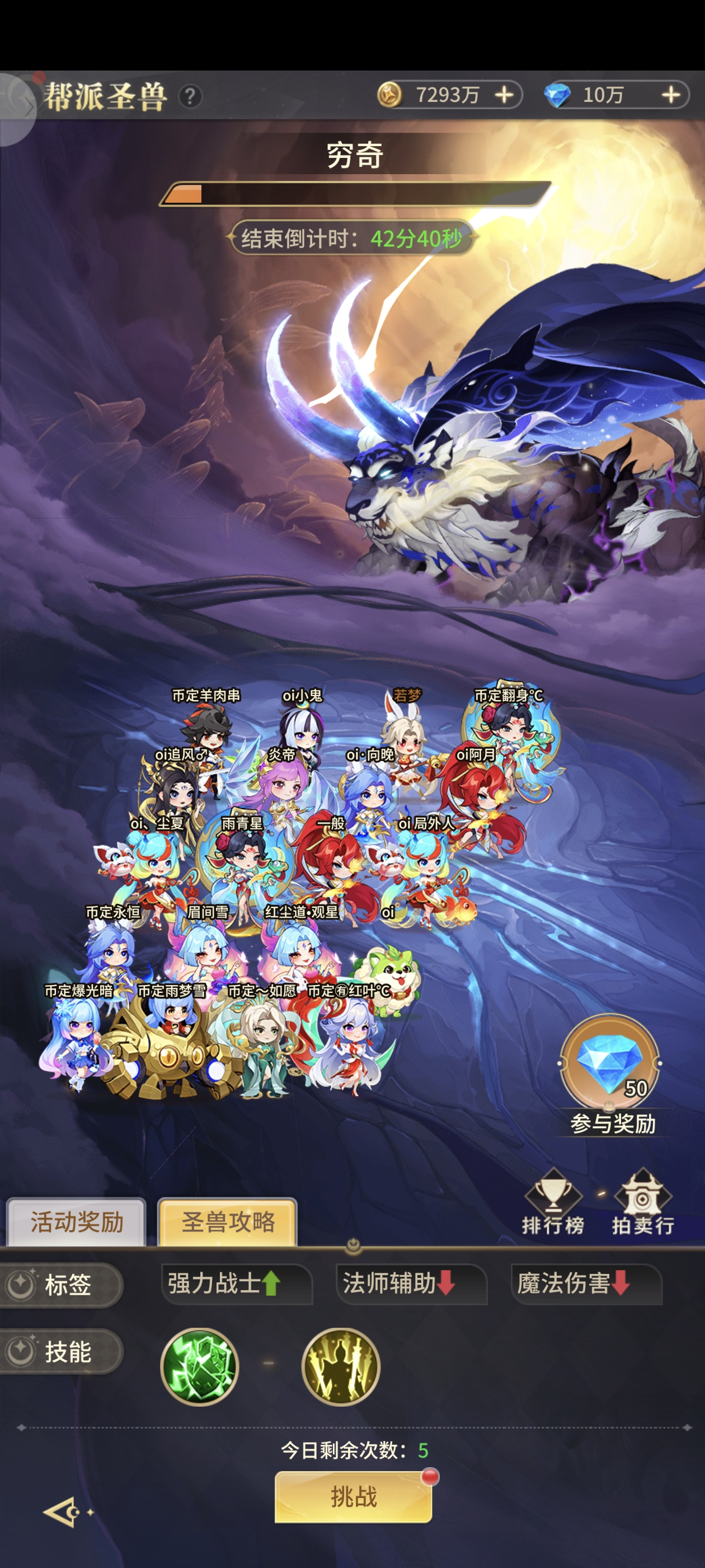 每期开启前30分钟,每期结束前的20分钟均为休赛期,玩家无法进入挑战。 +活动开启后,根据各个服的具体情况划分为若干跨区,每个跨区内所有玩家的怪物与属性都相同。 +每期同时开启3个首领,每个首领有5个难度[简单][普通][困难][噩梦][地狱],前置难度首通后方可解锁下一难度。 +挑战首领可获得积分,结算期根据积分排名,按照排名先后发放奖励。伤害越高,积分越多。 +排名积分为所有首领的所有难度历史最高积分总和。+玩家每日有5次挑战次数,每日00:00重置。 +每次挑战结算时,玩家可选择是否保存本次战斗结果,保存扣除本次挑战次数,积分只录入历史最高积分。 +活动每期排名奖励在活动结束后次日00:00点通过邮件发送。 +当天未使用挑战次数累计到第二天,挑战次数最多累计10次。