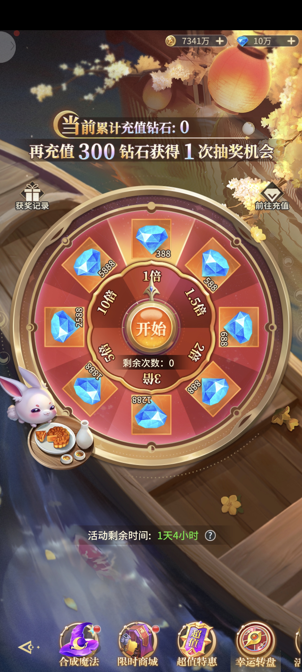 超喜欢幸运转盘活动~充值同样的情况下可以转更多的钻~幸运转盘活动期间,累计充值钻石达到指定数额后可获得抽奖机会。具体累充钻石数量与获得抽奖机会次数关系如下:累计充值300钻石,获得1次抽奖机会;累计充值600钻石,获得1次抽奖机会;累计充值1280钻石,获得1次抽奖机会;累计充值1980钻石,获得1次抽奖机会;累计充值3680钻石,获得2次抽奖机会;累计充值6480钻石,获得3次抽奖机会;累计充值10000钻石,获得3次抽奖机会;累计充值16480钻石,获得4次抽奖机会;累计充值22960钻石,获得4次抽奖机会。 +每次抽奖可随机获得不同倍率的钻石返利。