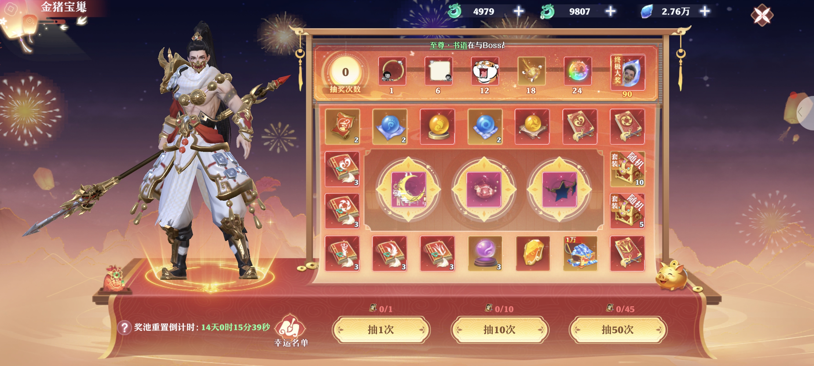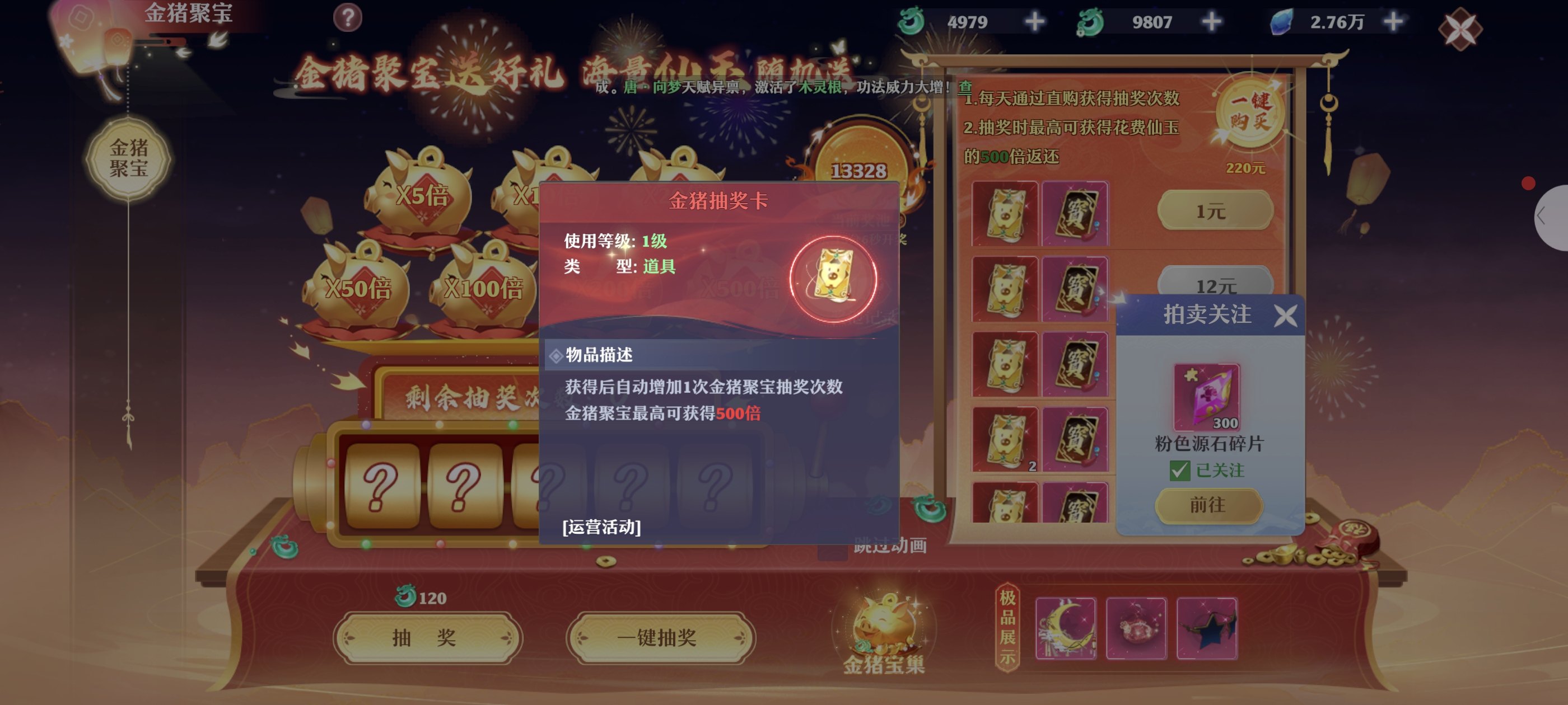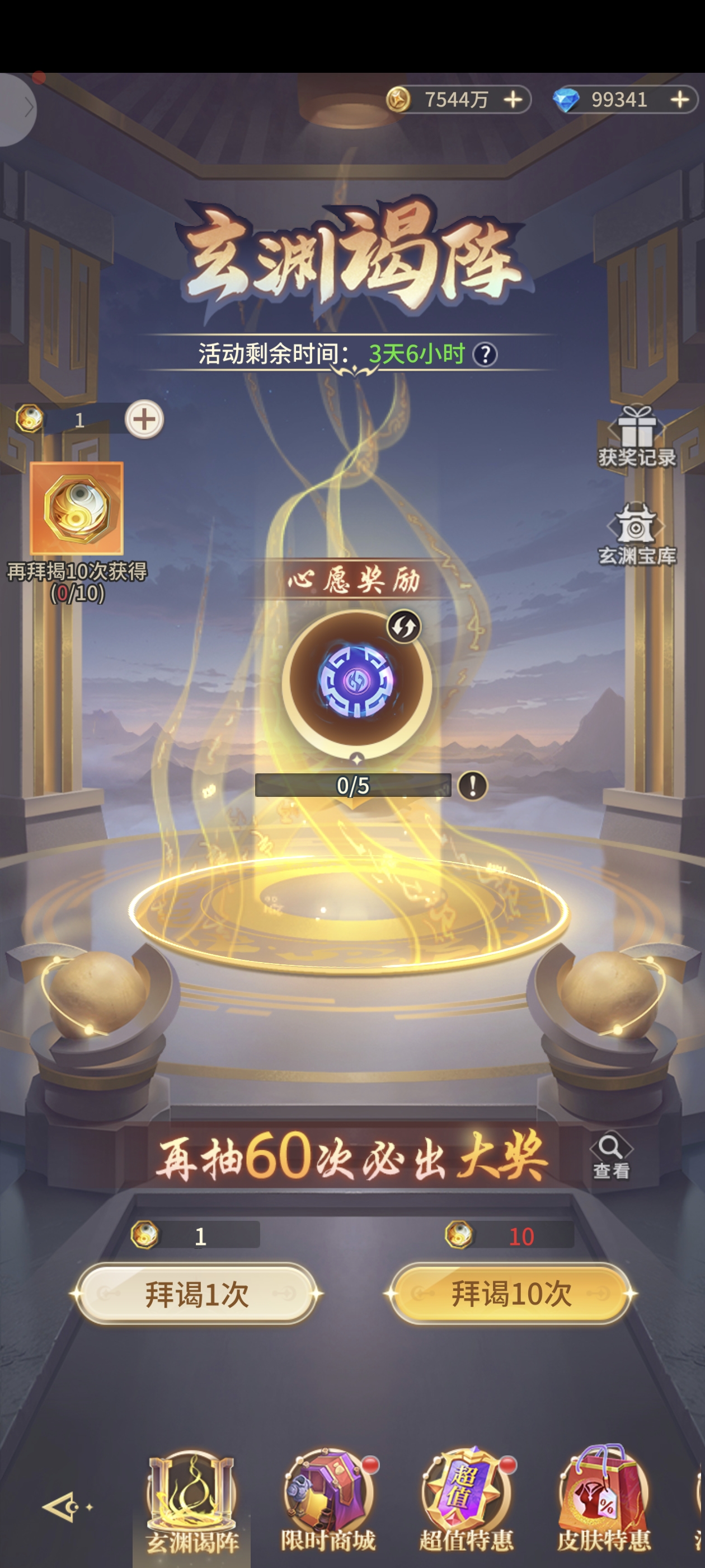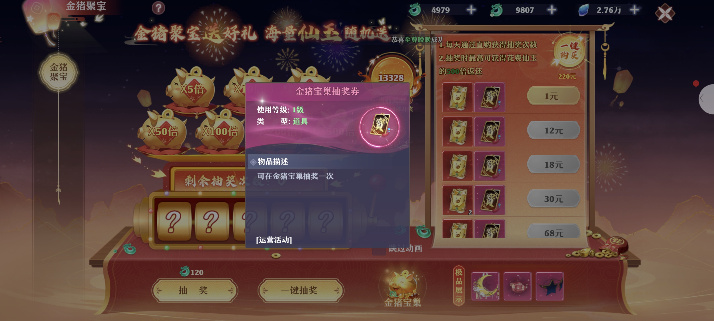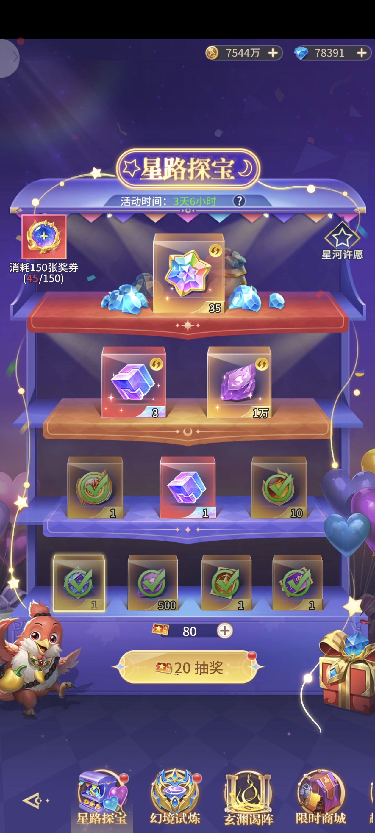 活动期间可消耗探宝券进行抽奖,每个奖励一轮内仅能被抽中1次,抽满10次必得终极大奖,抽中终极大奖后可进入下轮奖池。 +特定奖品在被抽取前,可切换成其他奖励,被抽取后不可切换。 +活动结束后,若有剩余的探宝券,系统将会回收成钻石通过邮件返还给玩家。 +每一轮奖池内,10次抽奖所消耗的探宝券数量为:第1+-2次抽奖每次消耗5张宝券,第3-6次抽奖每次消耗10张宝券,第7-9次抽奖每次消耗20张宝券,第10次抽奖消耗60张宝券。 +活动期间每消耗150张探宝券,就可领取一个星河罗盘,可参与星河许愿活动,星河许愿活动内的奖励每轮仅能被抽中1次,抽满8次必出终极大奖,抽中终极大奖后可进入下轮奖池。 +特定奖品在被抽取前,可切换成其他奖励,被抽取后不可切换。 +活动结束后,已累积的星河许愿保底值将会重置;若有剩余的星河罗盘,系统将会回收成钻石通过邮件返还给