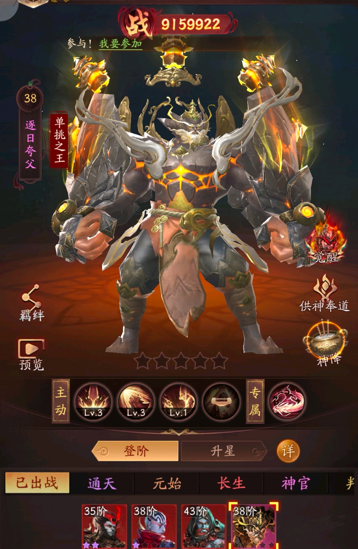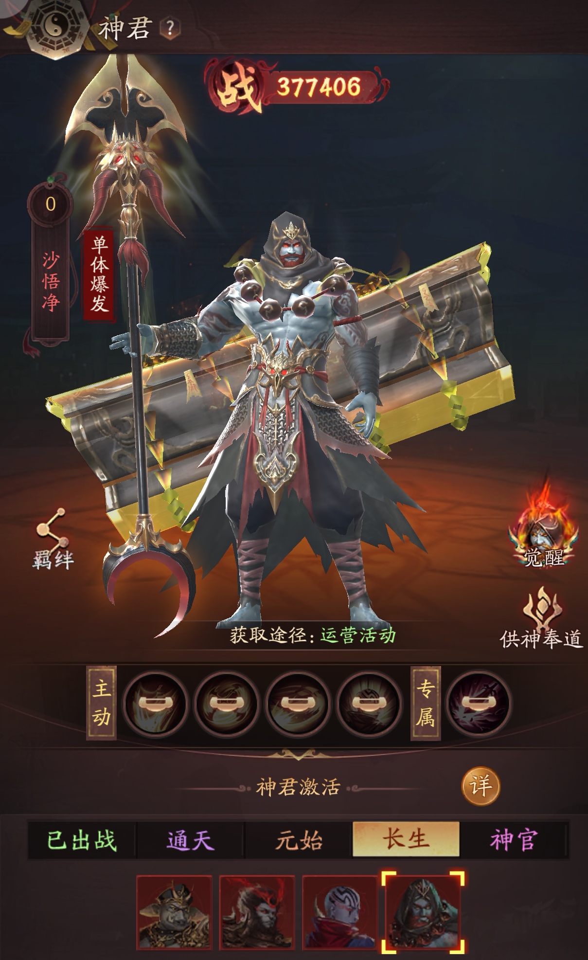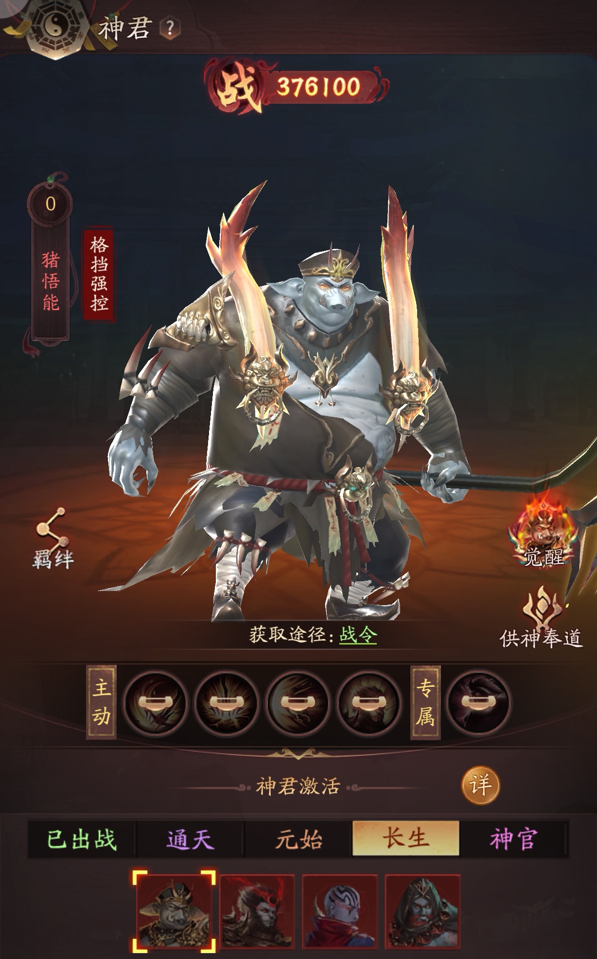 玄奘——六臂持法,冰晶法球凝天地之力,绝对控制主宰战局;红黑法袍加身,眉心一点朱砂映禅意,既是慈悲佛陀,亦是降魔战神。 孙悟空其定位为“爆发输出”型神君,当前战力值413747。角色造型融合暗黑与神话元素,身披金属铠甲,手持标志性金箍棒,周身环绕火焰特效,整体设计突出战斗感与力量感。 “猪悟能”其核心定位为格挡强控型神君,具备“格挡”和“强控”特性,获取途径为“战令”,并可通过“供神奉道”系统进一步养成。 角色整体造型魁梧,身着黑色战甲,肩甲与武器装饰有火焰纹路,手持标志性九齿钉耙,面部呈现青灰色皮肤与獠牙,凸显力量感与神话色彩。 金身罗汉,沙悟净单体爆发型神君战手持降妖宝杖,身披重甲,肩扛卷轴,整体造型融合暗黑与神话风格,突出战斗属性。