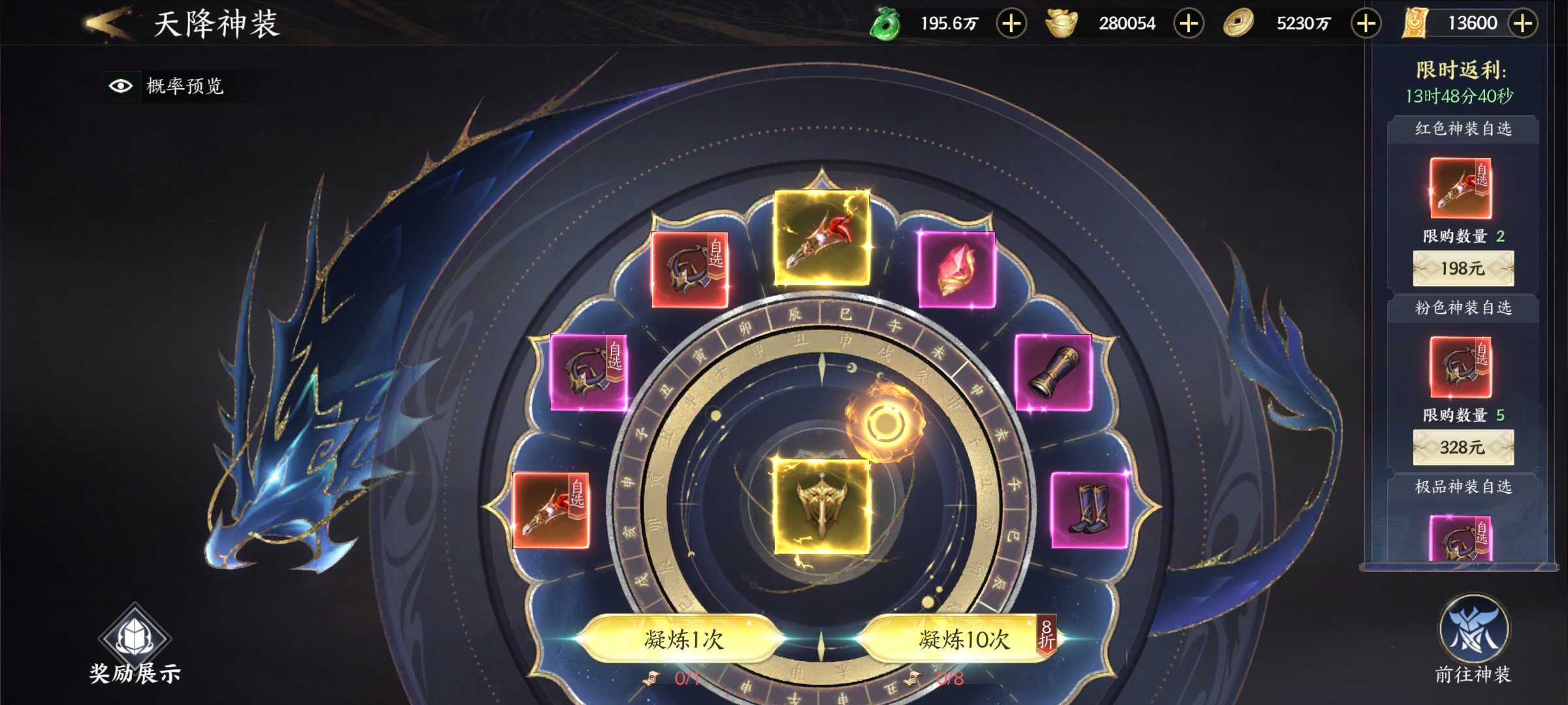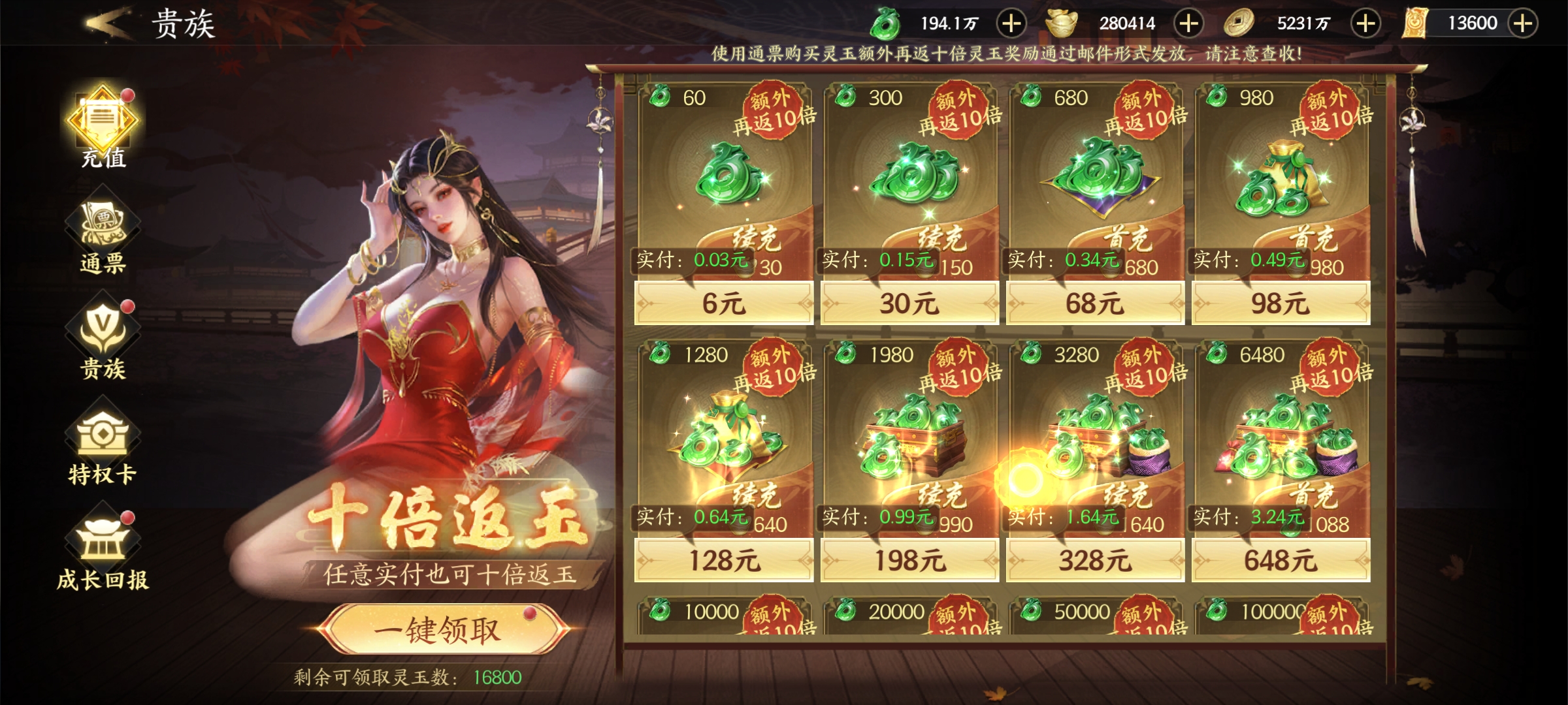 1.每日在0点至23点,可以花费2元、6元、12元、26元、68元、128元、256+元购买奖励 2.购买后,可参与福袋摇奖,随机获得一定倍率的仙玉返利。 3.系统会自动将玩家抽到仙玉的10%放到总奖池中 4+.+每日23.15分,会分别抽取8名购买达到8元档位的玩家,共同瓜分总奖池 5.第一名玩家可独占35%的奖励,2-4名分别获得20%、15%与10%的奖励,+其余玩家分别获得5%的奖励 6.每个档位奖励内,赠送财运亨通玩法内的抽奖龙珠,一个功能多种玩法 7.一键迎财可额外获得更多超值奖励 8.抽奖次数跨天会清除,过期将无法获得灵玉返利
