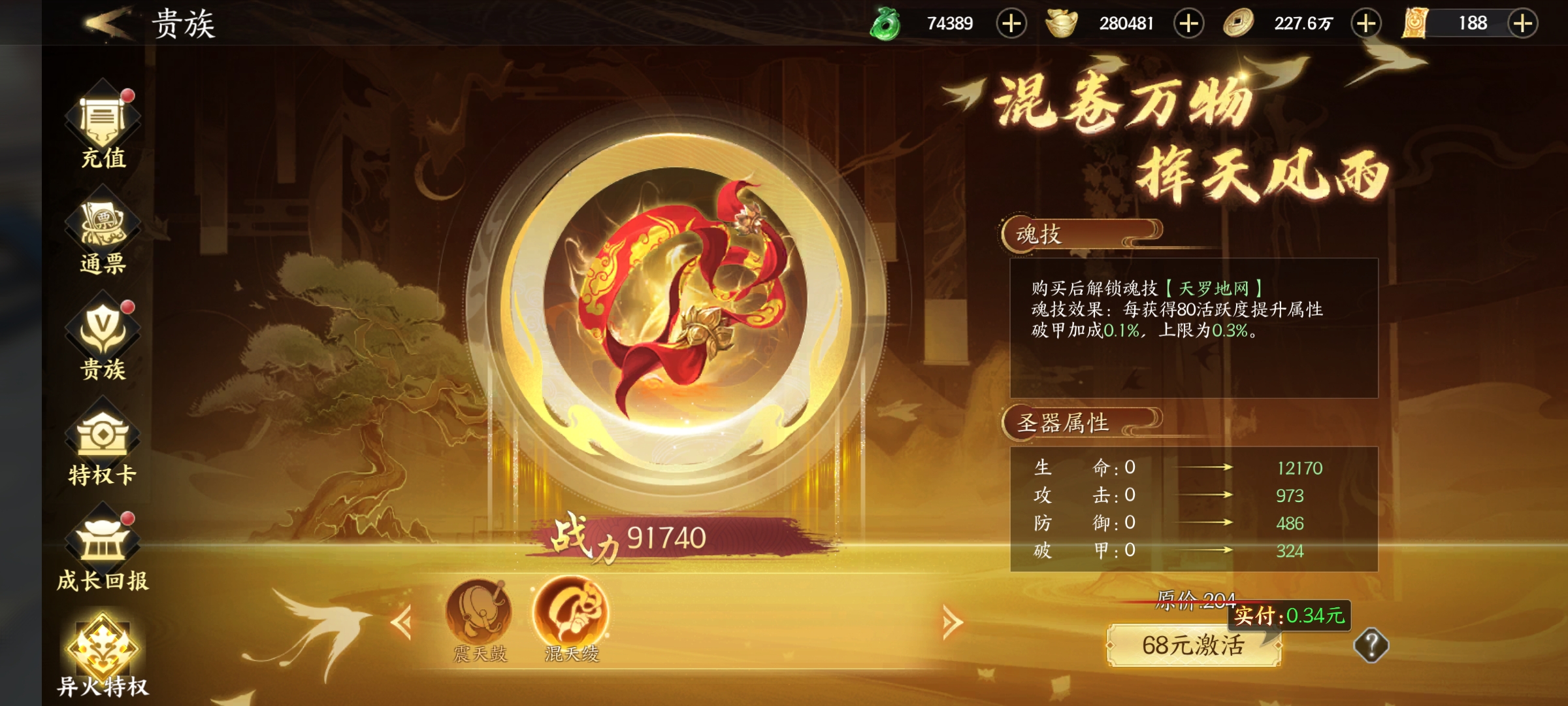 鼓角齐鸣,风卷雷霆!双圣器限时特惠,战力与成长双丰收! 本次活动开启两大上古圣器,一次解锁,同时拥有「防御成长」与「破甲成长」两大核心能力,从生存到输出全面拉满! 1.+震天鼓+·++守御之器 + 核心定位:+永久防御成长,硬抗一切伤害 + -+激活即享:生命+12170+/+攻击+973+/+防御+486+/+破甲+324,战力暴涨91740 -+专属魂技【战鼓雷鸣】:每击杀5个本服BOSS,永久提升0.1%防御,最高叠加0.3% -+核心优势:打BOSS就能躺平养成,越打越肉,后期副本、跨服战再也不怕被秒! 2.+混天绫+·+破敌之器 + 核心定位:+永久破甲成长,无视所有防御 + -+激活即享:生命+12170+/+攻击+973+/+防御+486+/+破甲+324,战力暴涨91740 -+专属魂技【天罗地网】:每获得80活跃度,永久提升0.1%破甲,最高叠加0.3% -+核心优势:日常做任务、刷活动就能轻松养成,打肉盾、高防BOSS刀刀入肉! +双圣器均享特惠:原价204元,现价仅需68元/件! +一次付费,永久生效,无任何时效限制,全程保值不贬值! +双圣器搭配激活,防御+破甲双向成长,不管是PVE还是PVP都能全面碾压对手。