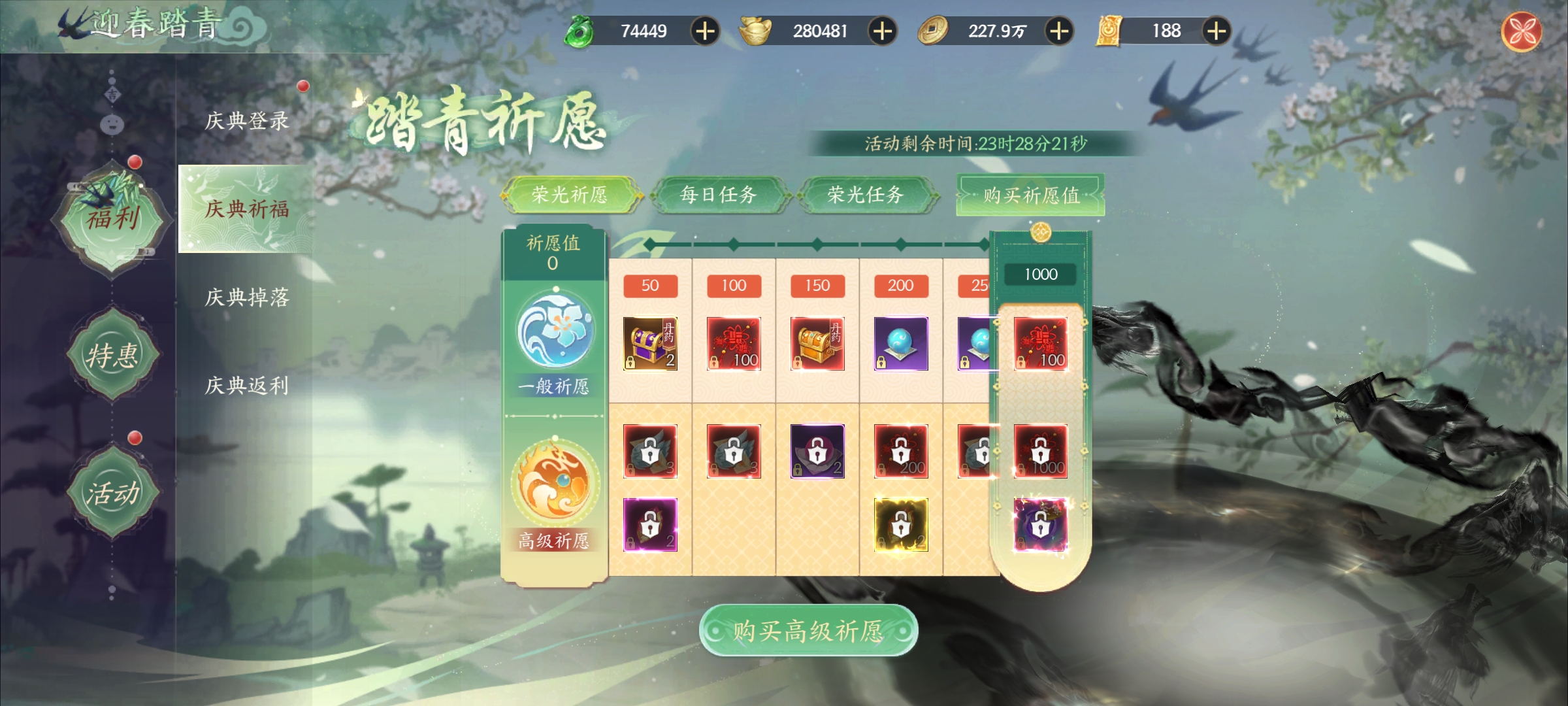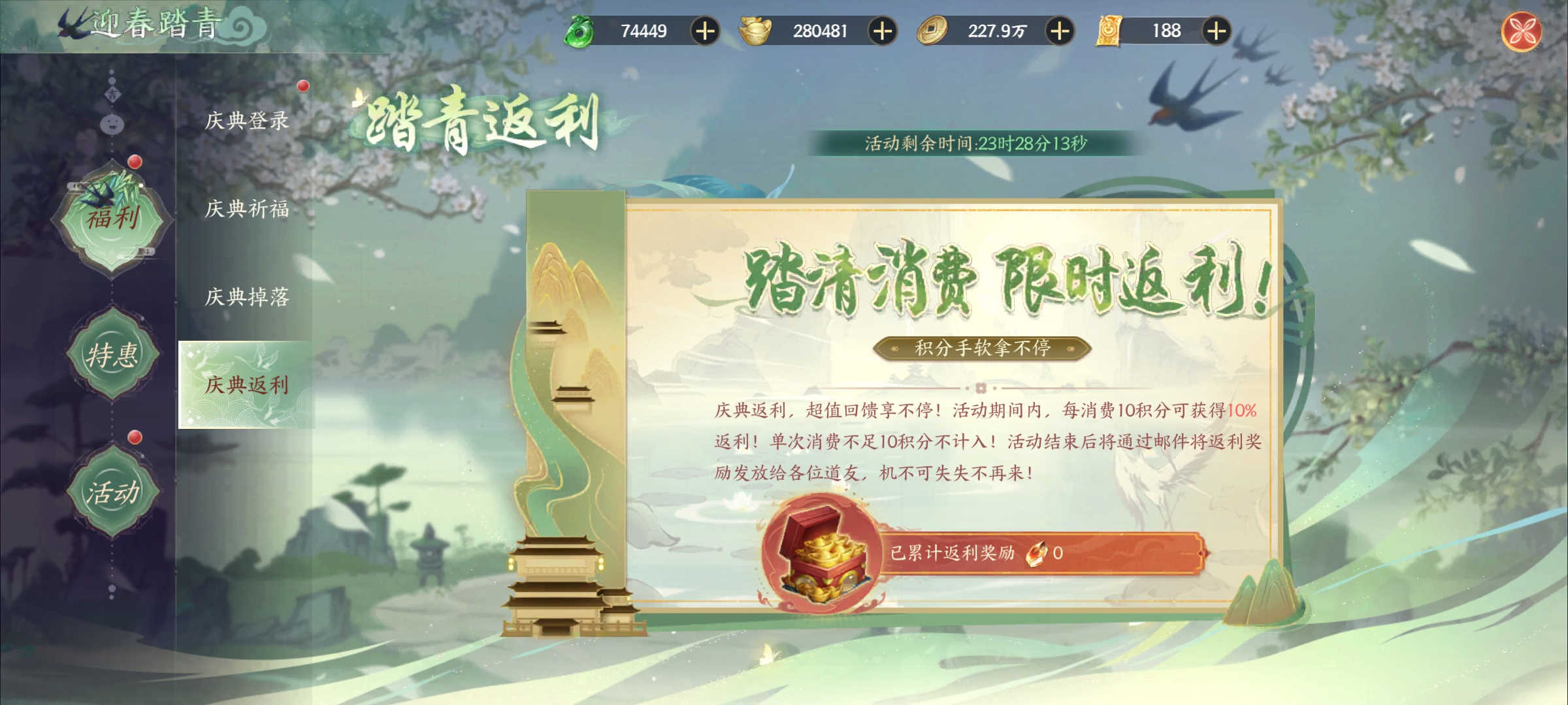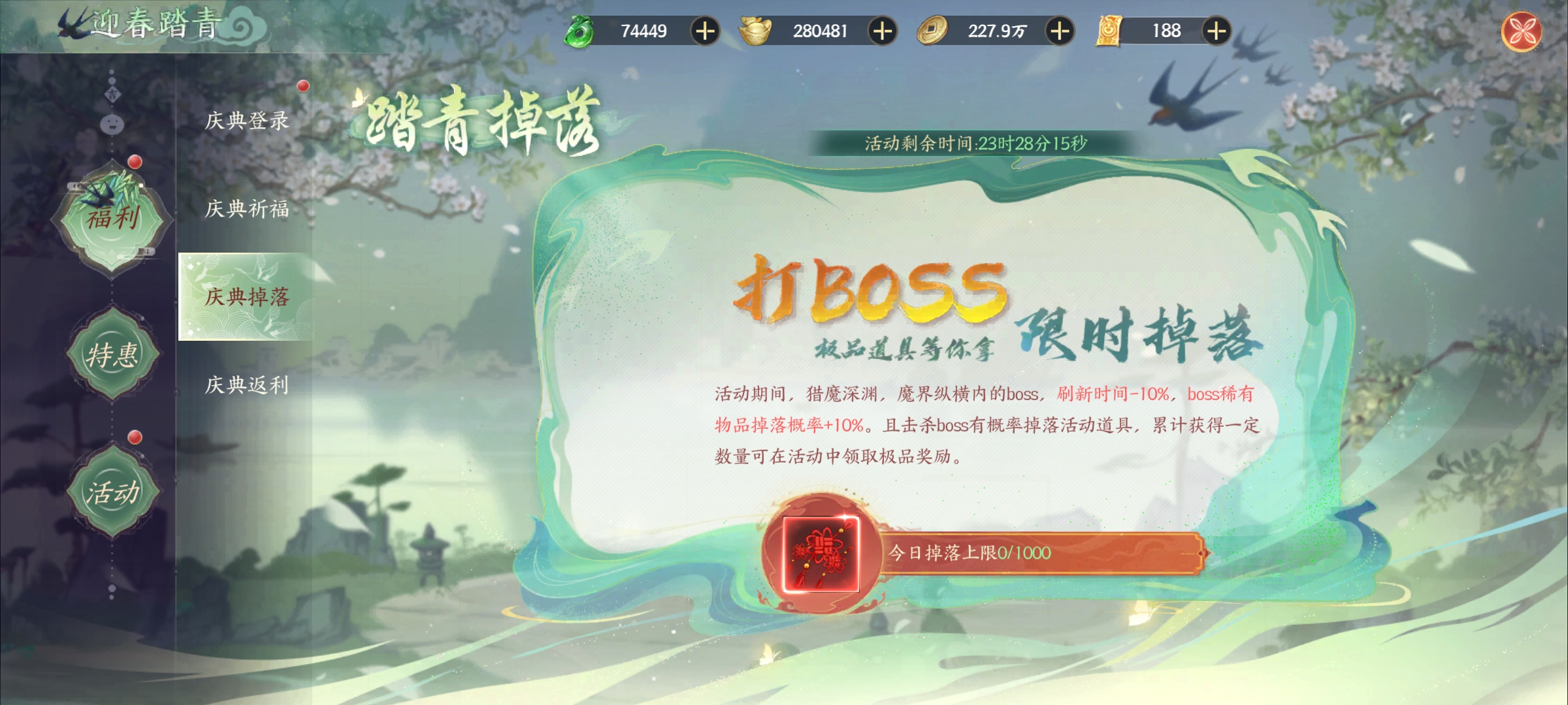 春风拂柳,燕语呢喃,春日限定「迎春踏青」主题活动正式上线!四大福利板块轮番登场,登录、祈福、打本、消费全场景解锁惊喜,更有海量珍稀道具、限定奖励等你来拿,这份春日狂欢攻略请收好,福利不迷路! 踏青登录+·+每日签到抽好礼 + 活动期间,每日登录游戏即可免费领取1次抽奖机会,转盘奖励无空奖,珍稀道具池包含: + -+高阶材料(最高50份)、限定道具(最高20份) -+稀有养成资源,助力角色战力飙升 + 活动期间记得每日上线打卡,别错过白嫖福利的机会! 踏青祈愿+·+解锁进阶限定奖励 + 开启「踏青祈愿」活动,分为「一般祈愿」与「高级祈愿」双路线,累计祈愿值即可解锁阶梯奖励: + -+祈愿值每达50/100/150/200…档位,可领取宝箱、限定道具、养成材料 -+完成「每日任务/荣光任务」还可额外获取祈愿值。 踏青掉落+·+打BOSS享限时加成 + 活动期间,猎魔深渊、魔界纵横副本迎来双重福利buff: + -+BOSS刷新时间-10%,稀有物品掉落概率+10%,刷本效率翻倍 -+击杀BOSS还有概率掉落专属活动道具,每日掉落上限1000个,累计道具可兑换极品限定奖励,肝帝党狂喜! 踏青返利+·+消费享限时回馈 + 活动期间开启「踏青消费限时返利」: + -+每消费10积分即可获得10%返利,单次消费不足10积分不计入 -+活动结束后,返利奖励将通过邮件统一发放,消费也能薅羊毛,福利拉满不亏! + + 春日限定福利已就位,四大活动同步开启,登录、祈愿、刷本、消费全场景解锁惊喜奖励!赶紧上线参与,把春日福利全部抱回家~