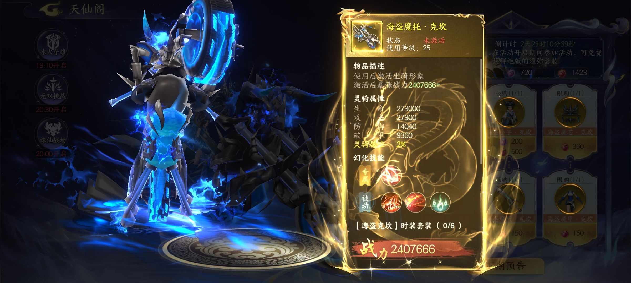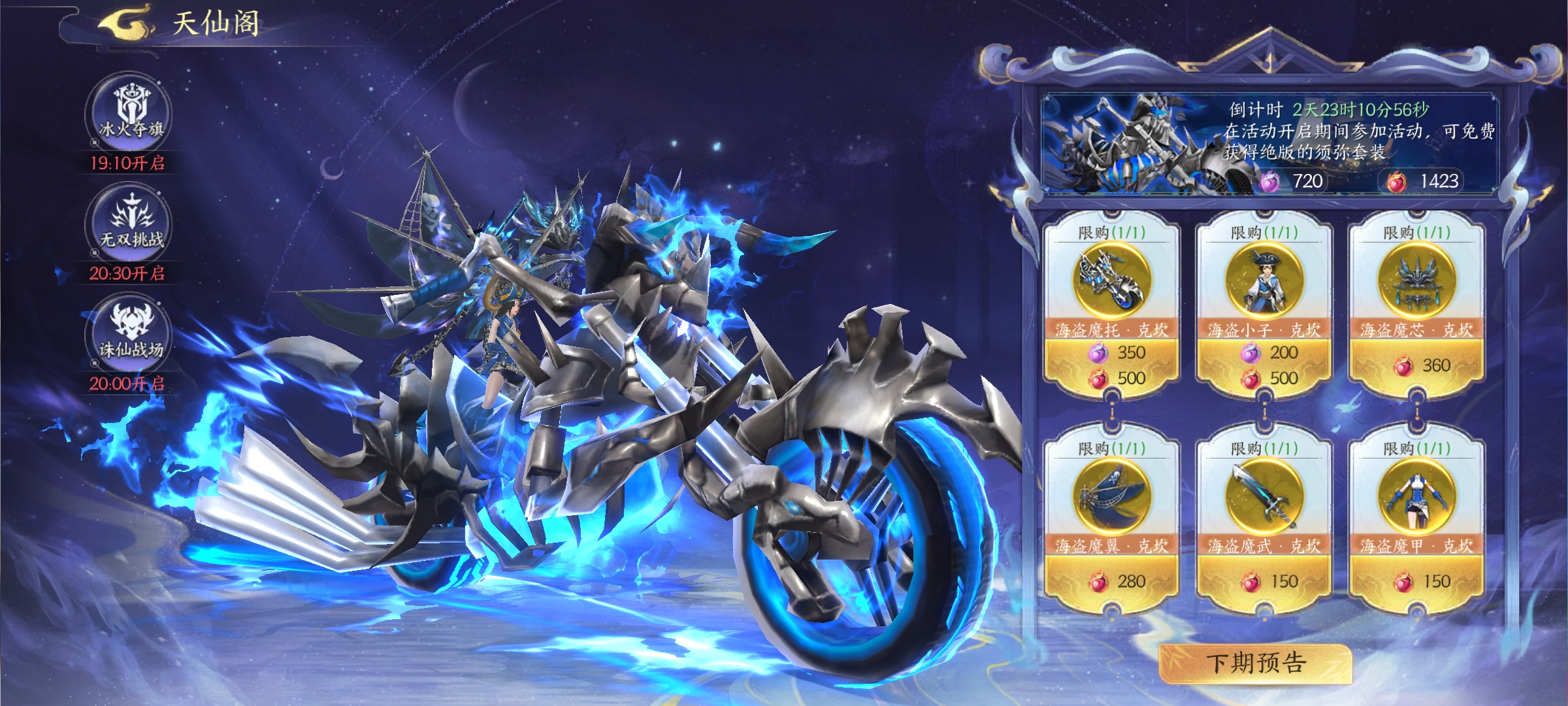 来自天外遗失世界的神秘套装「海盗魔骑·克坎」登陆天仙阁!酷炫蓝焰摩托、暗黑海盗造型,战力与颜值双绝,活动期间参与玩法即可获得道具用于兑换套装部件。 兑换部件 所需道具(九天息壤/本源仙晶) 海盗魔托·克坎 350+++500 海盗小子·克坎 200+++500 海盗魔芯·克坎 360 海盗魔翼·克坎 280 海盗魔武·克坎 150 海盗魔甲·克坎 150 蓝焰轰鸣,海盗降临!这套自带科技感与暗黑风的限定摩托套装,错过这次再无获取机会!现在就登录游戏,参与活动免费获得道具兑换套装。把这组绝版外观彻底拿下吧!