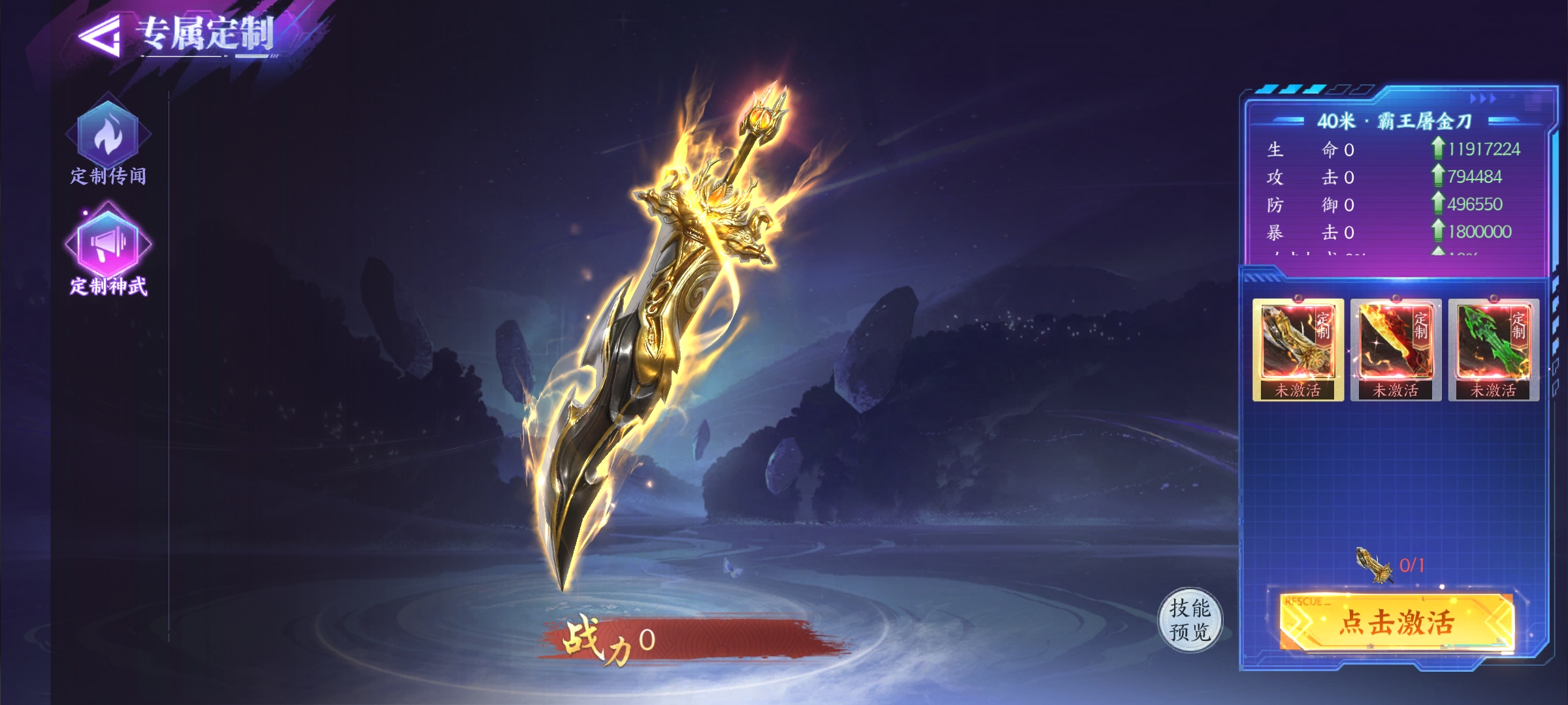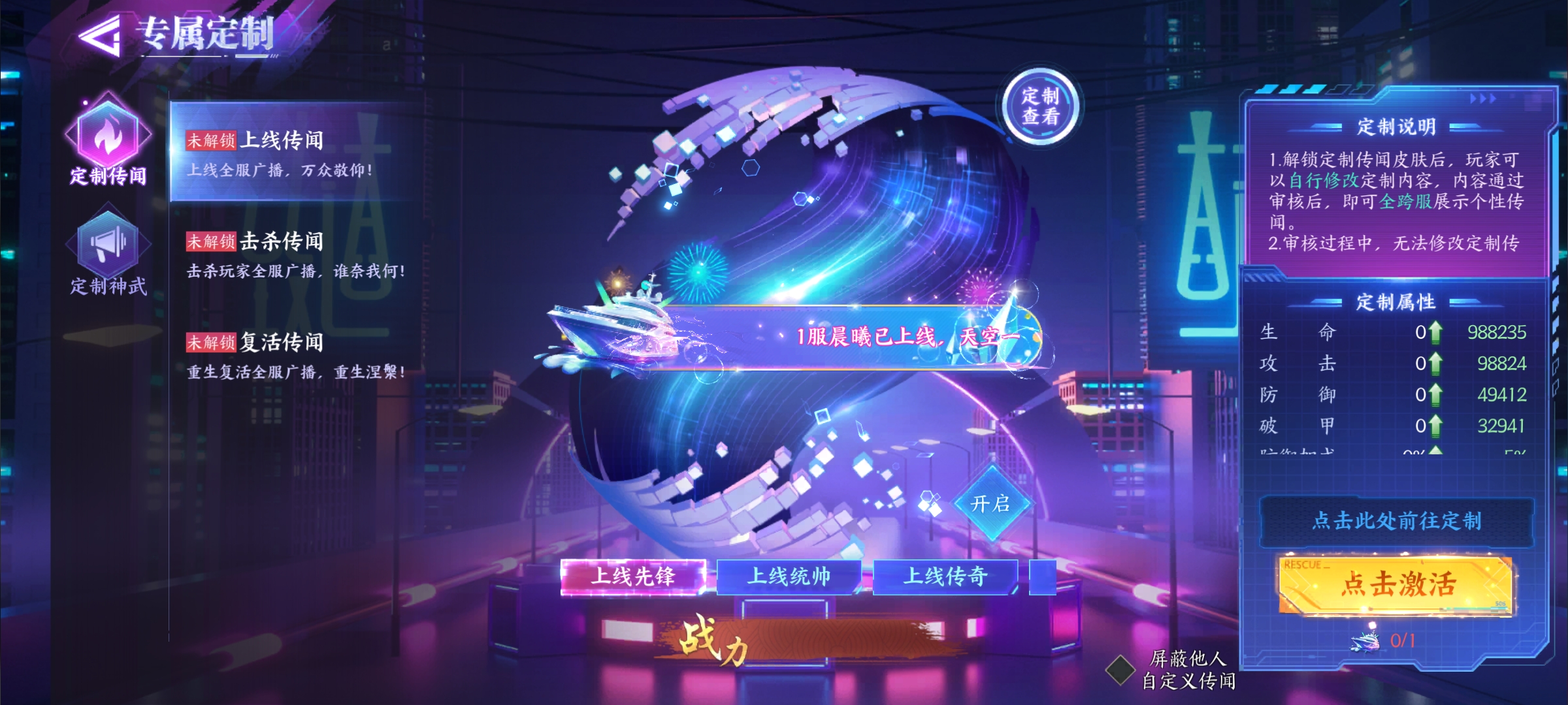 打破千篇一律,解锁独属于你的游戏高光时刻!全新「专属定制」系统来袭,定制专属全服广播与霸气神武,战力与排面双拉满,让你的每一次登场都万众瞩目! 定制传闻+·+全服广播秀出个性】 + 解锁专属传闻皮肤后,即可自定义你的全服广播文案,审核通过后,你的个性宣言将跨服展示! + -+三大传闻类型 -+「上线传闻」:登录即触发全服广播,上线瞬间成为焦点! -+「击杀传闻」:击败对手时触发专属播报,宣告你的绝对实力! -+「复活传闻」:涅槃重生触发广播,尽显王者不屈姿态! -+炫酷特效档位:上线先锋/统帅/传奇等等多种特效可选,霓虹邮轮风格动画拉满氛围感,让你的广播自带视觉冲击! -+战力加成:激活传闻即可解锁高额属性,生命、攻击、防御、破甲全方位提升! 定制神武+·+40米大刀战力狂飙 + 霸气定制神武「40米·霸王屠金刀」震撼登场! + -+超高战力加成:单把神武即可带来千万级生命、近百万攻击、高额暴击属性,战力飙升无压力! -+多款外观可选:金刀、烈焰刀、绿刃等定制外观,每款都自带专属特效,满足你的收藏欲! -+激活即享:解锁神武即可激活对应外观与属性,让你的武器成为行走的实力名片! 还在等什么?现在就来打造你的专属传闻与神武,让你的名字和实力,响彻全服!