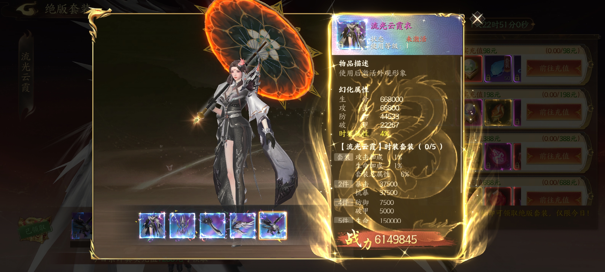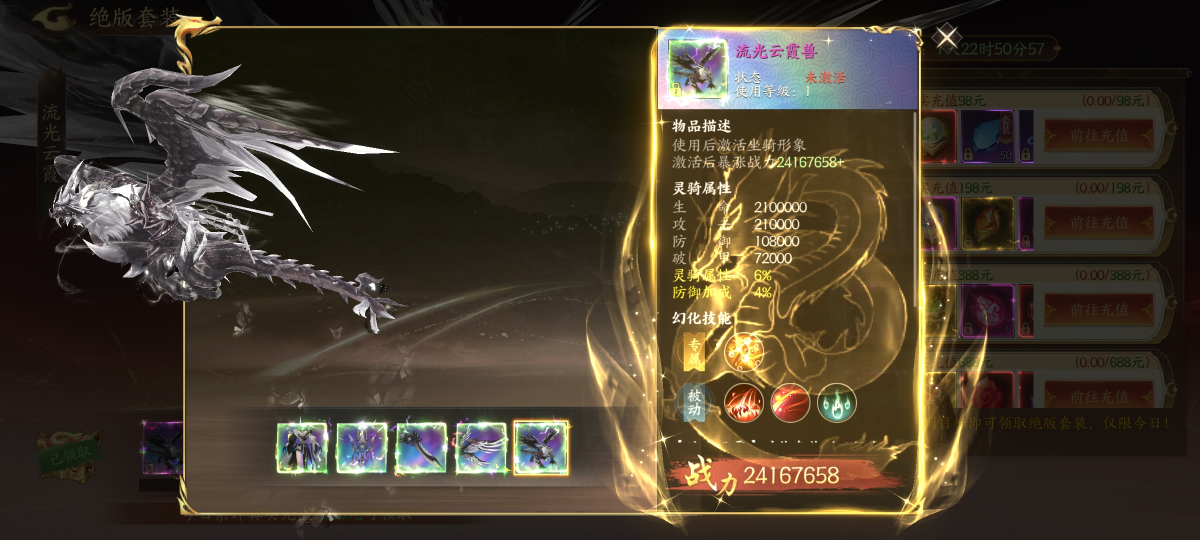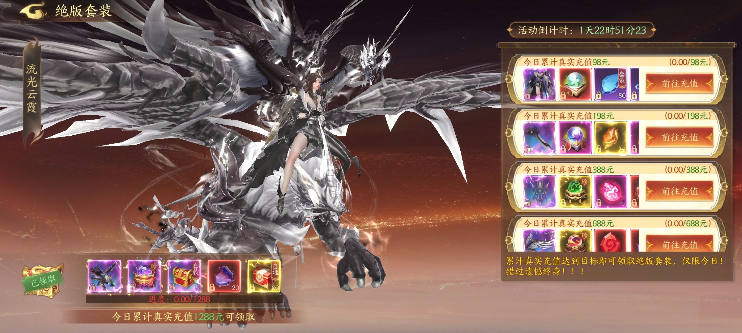 暗黑水墨风外观+百万战力加成,「流光云霞」绝版套装今日限定返场!仅需累计充值即可解锁全套时装、武器、背饰与专属坐骑,活动倒计时中~~ 套装亮点:颜值与战力双巅峰 + 1.+「流光云霞衣」时装 + -+外观特效:黑银水墨风设计,搭配橙焰油纸伞武器,冷艳又飒爽,行走间自带氛围感 -+属性加成:单件时装提供668000生命、66800攻击,套装集齐更有额外属性加成 -+套装效果:5件集齐可激活总属性6%加成,暴击、抗暴、破甲、生命全方位提升,战力暴涨超600万! 2.+「流光云霞兽」专属坐骑 + -+霸气外观:暗黑骨龙造型,银黑羽翼带流光拖尾,骑乘时气场全开 -+高额战力:激活直接暴涨2416万+战力,附带生命、攻击、防御、破甲属性,更有专属被动技能加成 -+实用加成:额外提供6%灵骑属性加成与4%防御加成,副本PK双buff加持! 充值档位福利一览 + 今日累计充值即可解锁对应奖励,套装部件分档获取,最高档直接领齐全套! + 表格 +++ 累计充值档位+核心奖励+ 98元+时装部件、养成材料、套装碎片+ 198元+武器外观、高级道具、套装碎片+ 388元+背饰外观、珍稀道具、套装碎片+ 688元+翅膀外观、稀有材料、套装碎片+ 1288元+坐骑「流光云霞兽」+全套剩余部件+海量自选道具+ + 活动倒计时仅剩1天,错过本次将永久无法获取这套绝版外观与战力加成!无论是外观党还是战力党,这都是不可错过的机会! + + 💡+小贴士:所有奖励仅限今日领取,充值进度不累加至次日,想要全套的道友记得一次性拉满档位哦!