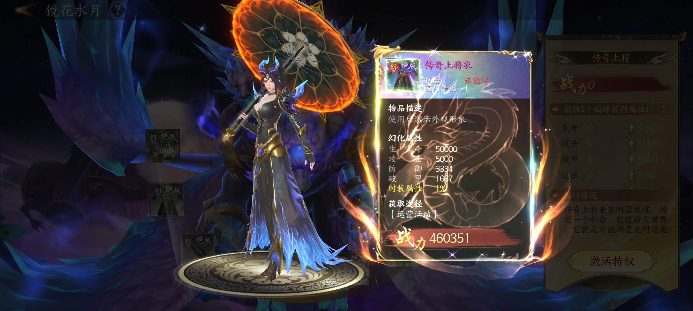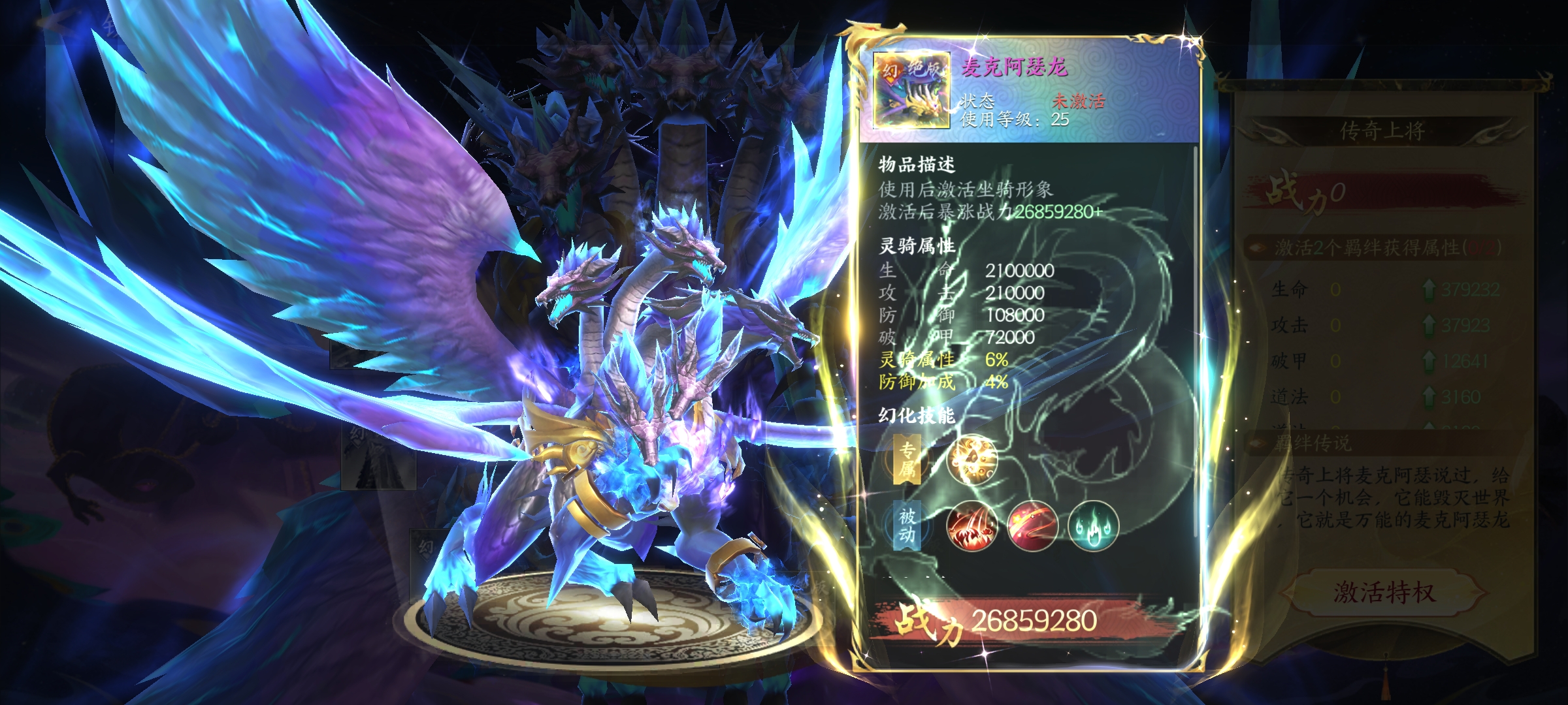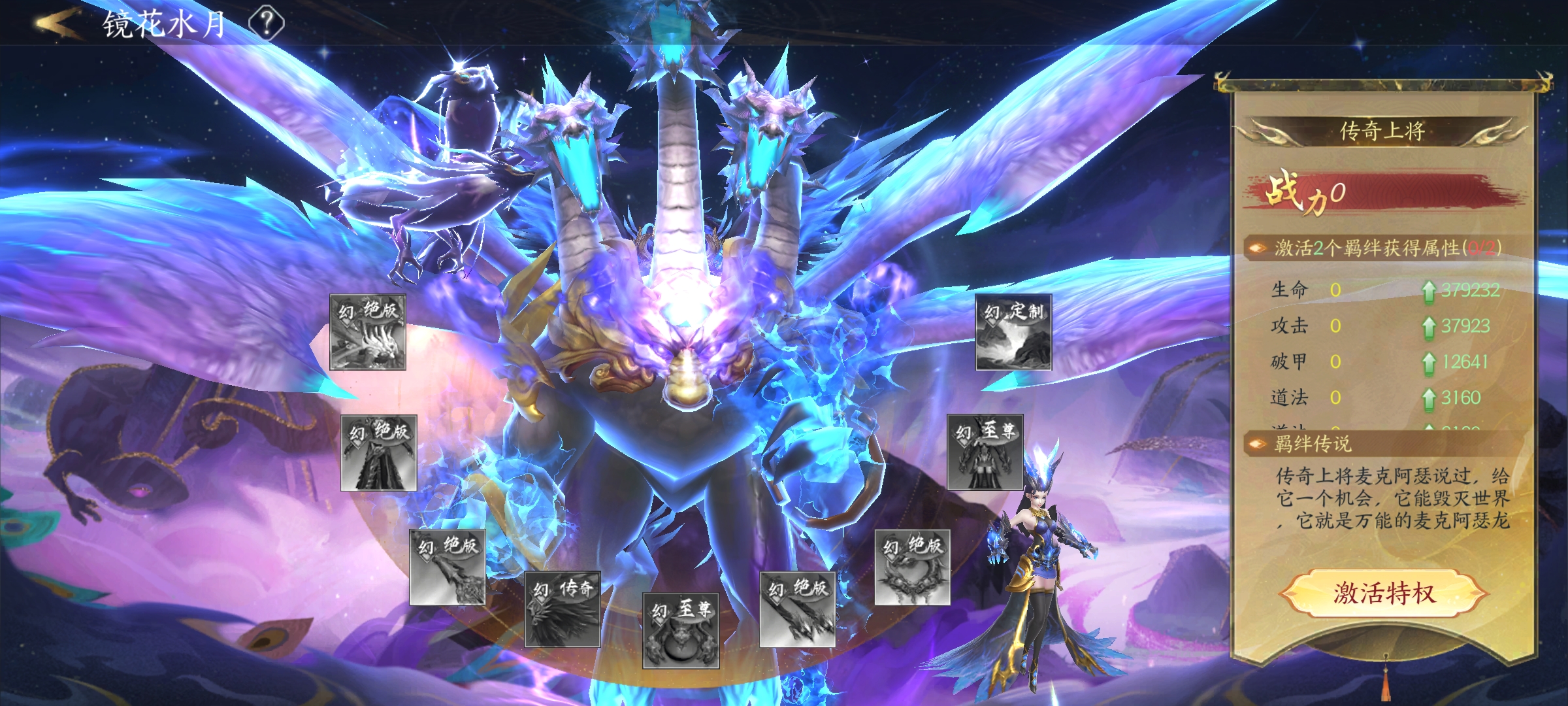 各位少侠久等了!全新「镜花水月」版本正式上线,绝版驭兽、限定外观、全新羁绊系统同步登场,一场战力与颜值的双重盛宴,就此开启! + 一、全新「镜花水月」羁绊系统,战力养成新玩法 + 本次版本核心更新——「镜花水月」羁绊系统,为少侠们带来全新战力成长路径: + -+多维度羁绊激活:收集外观、神灵、武魂真身、驭兽等各类道具,即可激活对应羁绊,一次性获得生命、攻击、破甲、道法等全属性大幅提升,激活2个羁绊即可领取海量属性,战力轻松起飞 -+星级养成,持续变强:将羁绊内的所有外观、武魂、驭兽培养至对应星级,即可升级羁绊星级,解锁更高级的属性加成,越养越强,上限无限 -+养成规则清晰明了:武魂突破对应品阶、驭兽合成升星,均可提升对应星级;温馨提示:吞噬或合成放生驭兽,可能导致星级下降,操作前请务必谨慎! + 二、版本核心:绝版幻·麦克阿瑟龙驭兽登场 + 本次版本的绝对主角——幻·绝版麦克阿瑟龙驭兽,震撼来袭! + -+【外观颜值】冰蓝龙身搭配紫晶龙翼,九头龙身霸气十足,特效拉满,行走江湖回头率100% -+【战力爆炸】激活即涨战力26859280+,基础属性直接拉满:生命2100000、攻击210000、防御108000、破甲72000,更有6%灵骑属性加成、4%防御加成,直接提升角色整体战力上限 -+【技能加持】专属+被动多技能组合,实战能力全面升级,无论是副本推图还是跨服PK,都能助你轻松制霸 + 三、限定外观:幻·绝版传奇上将衣,颜值战力双在线 + 同步上线幻·绝版传奇上将衣时装,为少侠们打造专属传奇造型: + -+【外观设计】暗黑龙纹修身长袍,蓝金渐变裙摆,搭配专属油纸伞,气场全开,御姐感拉满 -+【属性加成】激活即加战力460351,生命50000、攻击5000、防御3334、破甲1667,更有1%时装属性加成,外观与战力兼得 -+【获取方式】仅在本次运营活动限时产出,绝版限定,错过本次再无获取机会! + 四、活动参与指南&福利放送 + -+活动时间:本次运营活动限时开启,具体时间请以游戏内公告为准 -+参与方式:参与活动即可获取「传奇上将」系列绝版道具,解锁镜花水月羁绊 -+终极福利:集齐全套羁绊道具,激活满星羁绊,即可获得版本顶级战力加成,成为服务器名副其实的传奇上将! + 传奇从不等待,机会只给强者! 本次「镜花水月」版本,绝版驭兽、限定外观、全新系统,一站式满足你的所有需求! 即刻登录游戏,参与活动,解锁传奇上将之力,书写属于你的江湖传奇!