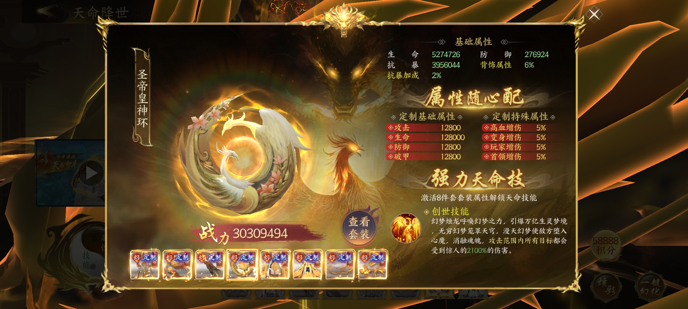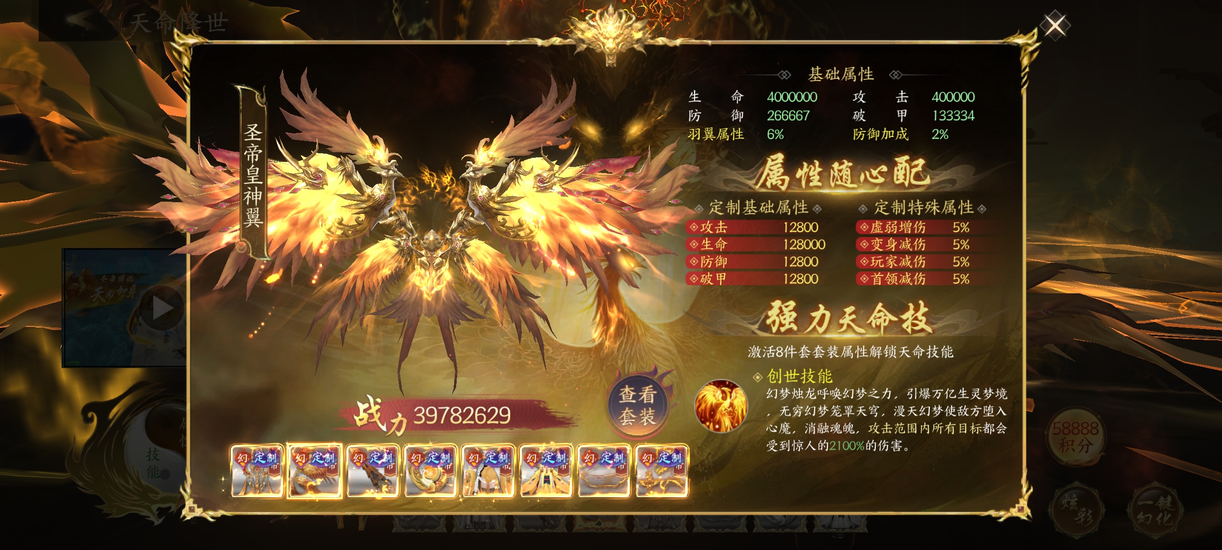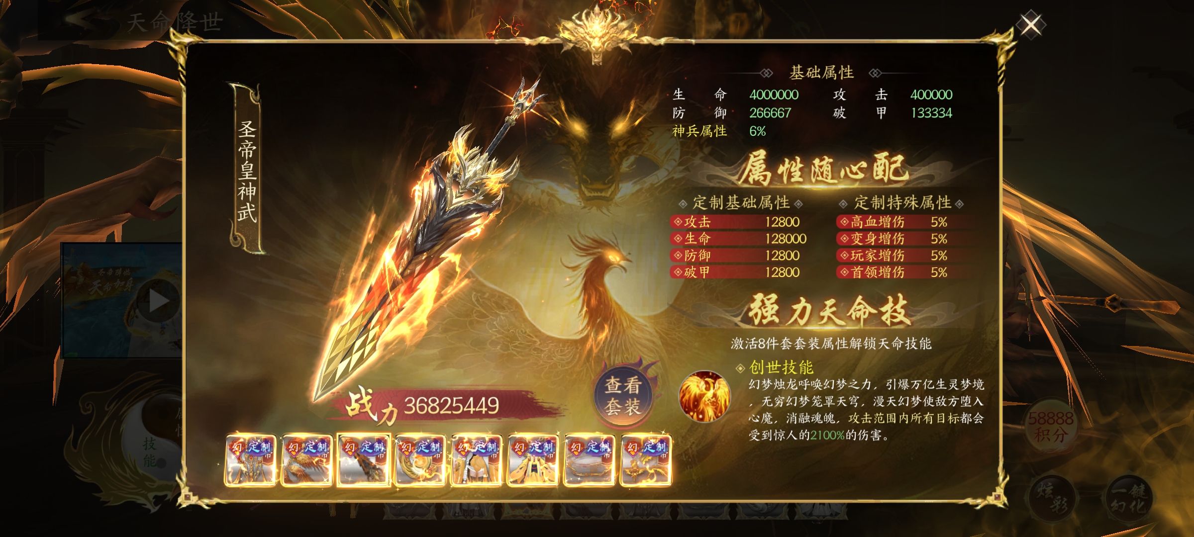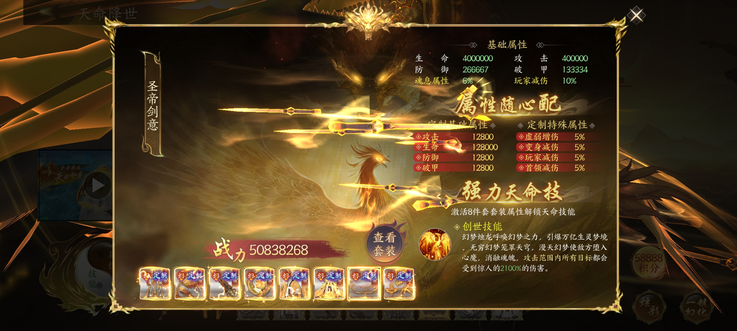 「天命降世」8件定制化圣帝套装登场,自由属性搭配、终极创世技能、爆炸战力加成,一场颜值与实力的双重盛宴,就此开启! + 一、全新「天命降世」系统,战力养成新巅峰 + ——「天命降世」系统,为少侠们带来全新战力成长路径: + -+8件圣帝套装,全维度提升:涵盖驭兽、时装、武器、翅膀、背饰、魂息、配饰、伙伴8大部位,全方位覆盖角色成长 -+属性自由定制,流派随心打造:每件装备均可定制基础属性+特殊属性,输出流、肉盾流、均衡流,一键切换,打造专属角色 -+终极创世技能,全屏秒杀:激活8件套套装属性,解锁终极创世技能「幻梦烛龙」,2100%范围伤害,清场BOSS,称霸战场 + 二、圣帝套装全览:颜值与战力双天花板 + 本次版本推出的8件圣帝套装,每一件都拥有顶级外观与爆炸属性: + -+圣帝龙凰:顶级驭兽,单只战力5146万,全场景增伤拉满,PVE/PVP通吃 -+圣帝皇神衣:绝版时装,颜值拉满,攻防一体,生存输出双在线 -+圣帝皇神武:霸气武器,输出上限突破,全场景增伤加持 -+圣帝皇神翼:华丽翅膀,视觉盛宴,肉度拉满,站撸一切 -+圣帝皇神器:霸气背饰,攻击加成拉满,输出能力再升级 -+圣帝剑意:魂息特效,PVP神级属性,10%玩家减伤,跨服无敌 -+圣帝皇神环:精美配饰,抗暴属性拉满,生存能力拉满 -+圣帝皇神兽:萌趣伙伴,攻防一体,陪伴作战,战力爆表 + 三、活动福利&参与指南 + -+活动时间:本次运营活动限时开启,具体时间请以游戏内公告为准 -+参与方式:参与活动即可获取圣帝套装部件,集齐8件激活满额属性与终极技能 -+绝版限定:圣帝套装仅本次活动产出,错过本次再无获取机会! + 圣帝降世,天命加身! 本次「天命降世」版本,绝版外观、爆炸战力、自由养成,一站式满足你的所有需求! 即刻登录游戏,参与活动,解锁圣帝之力,书写属于你的江湖传奇!