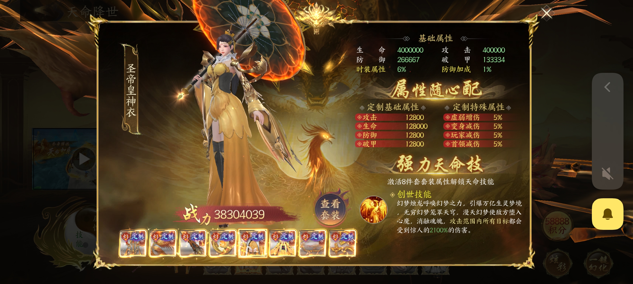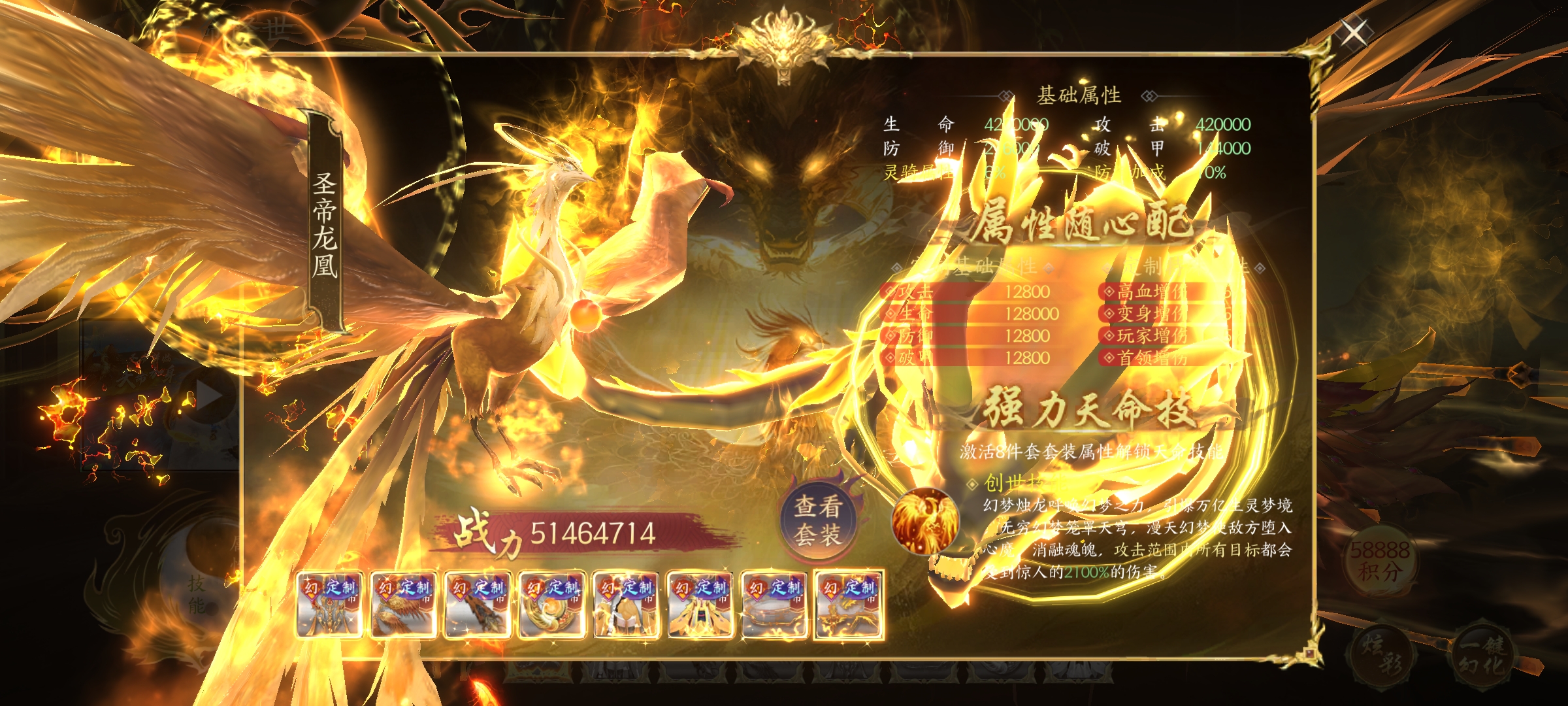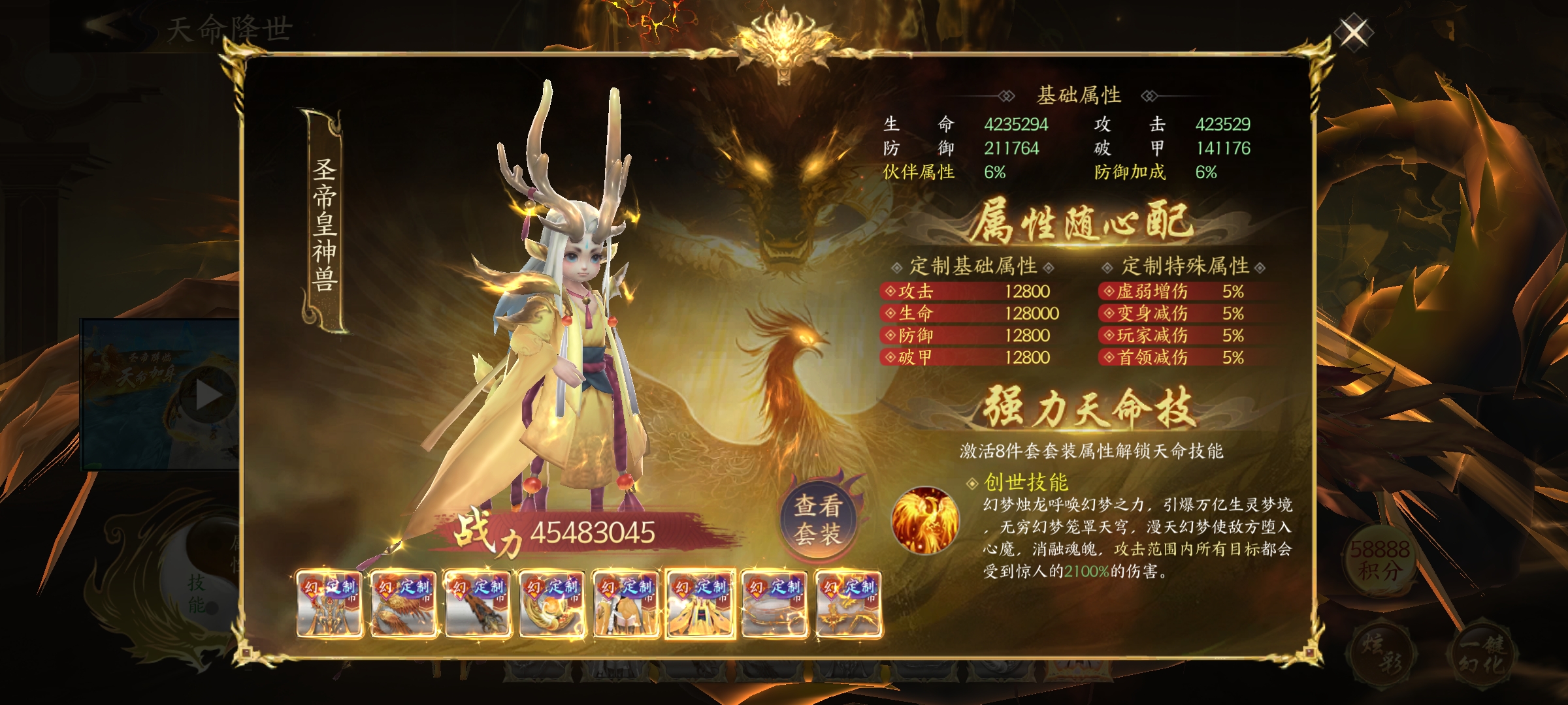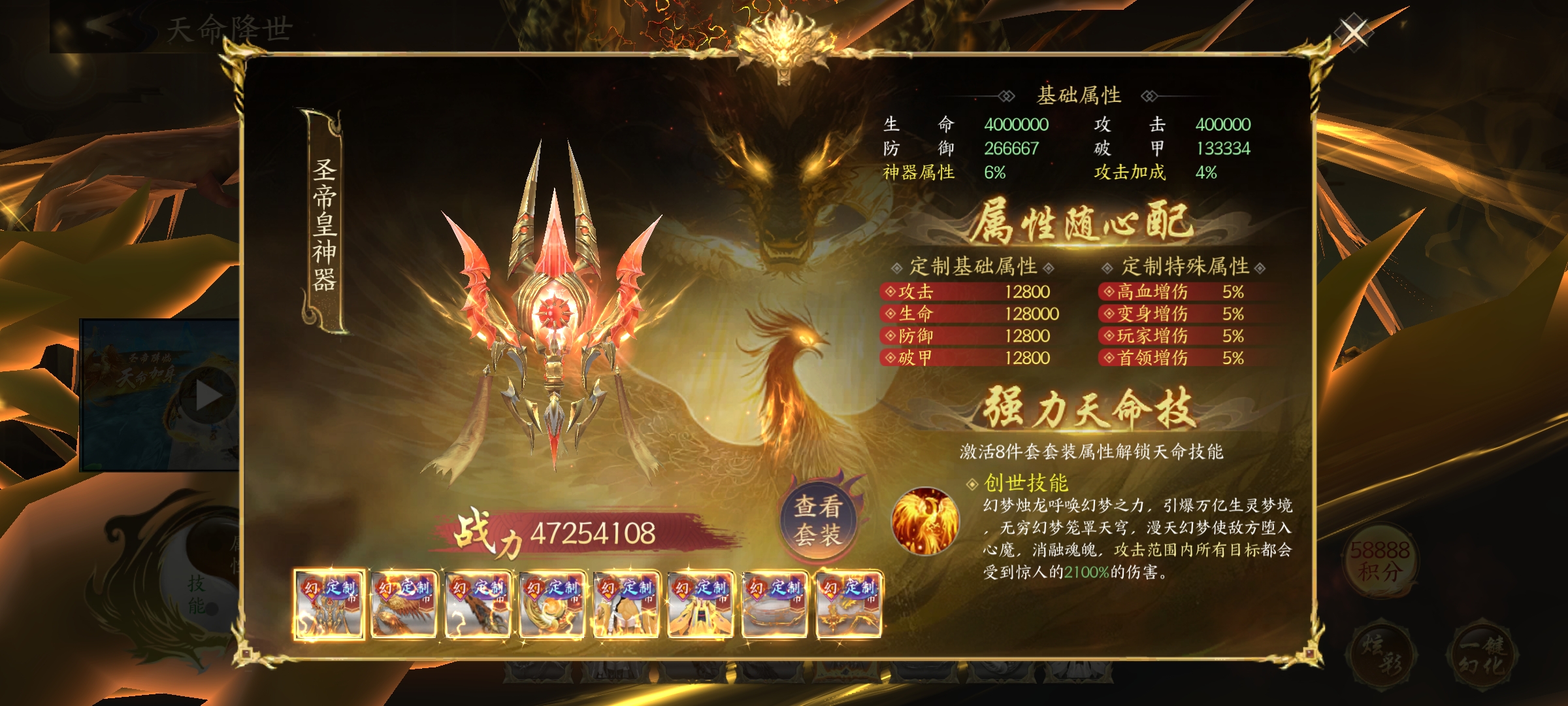 「天命降世」8件定制化圣帝套装登场,自由属性搭配、终极创世技能、爆炸战力加成,一场颜值与实力的双重盛宴,就此开启! + 一、全新「天命降世」系统,战力养成新巅峰 + ——「天命降世」系统,为少侠们带来全新战力成长路径: + -+8件圣帝套装,全维度提升:涵盖驭兽、时装、武器、翅膀、背饰、魂息、配饰、伙伴8大部位,全方位覆盖角色成长 -+属性自由定制,流派随心打造:每件装备均可定制基础属性+特殊属性,输出流、肉盾流、均衡流,一键切换,打造专属角色 -+终极创世技能,全屏秒杀:激活8件套套装属性,解锁终极创世技能「幻梦烛龙」,2100%范围伤害,清场BOSS,称霸战场 + 二、圣帝套装全览:颜值与战力双天花板 + 本次版本推出的8件圣帝套装,每一件都拥有顶级外观与爆炸属性: + -+圣帝龙凰:顶级驭兽,单只战力5146万,全场景增伤拉满,PVE/PVP通吃 -+圣帝皇神衣:绝版时装,颜值拉满,攻防一体,生存输出双在线 -+圣帝皇神武:霸气武器,输出上限突破,全场景增伤加持 -+圣帝皇神翼:华丽翅膀,视觉盛宴,肉度拉满,站撸一切 -+圣帝皇神器:霸气背饰,攻击加成拉满,输出能力再升级 -+圣帝剑意:魂息特效,PVP神级属性,10%玩家减伤,跨服无敌 -+圣帝皇神环:精美配饰,抗暴属性拉满,生存能力拉满 -+圣帝皇神兽:萌趣伙伴,攻防一体,陪伴作战,战力爆表 + 三、活动福利&参与指南 + -+活动时间:本次运营活动限时开启,具体时间请以游戏内公告为准 -+参与方式:参与活动即可获取圣帝套装部件,集齐8件激活满额属性与终极技能 -+绝版限定:圣帝套装仅本次活动产出,错过本次再无获取机会! + 圣帝降世,天命加身! 本次「天命降世」版本,绝版外观、爆炸战力、自由养成,一站式满足你的所有需求! 即刻登录游戏,参与活动,解锁圣帝之力,书写属于你的江湖传奇!