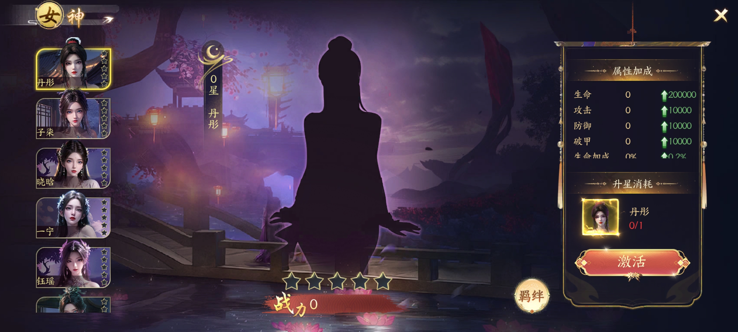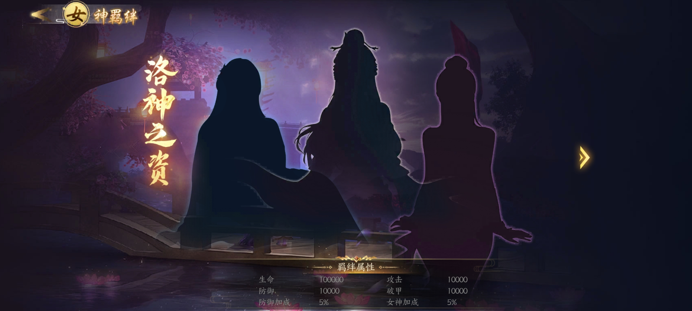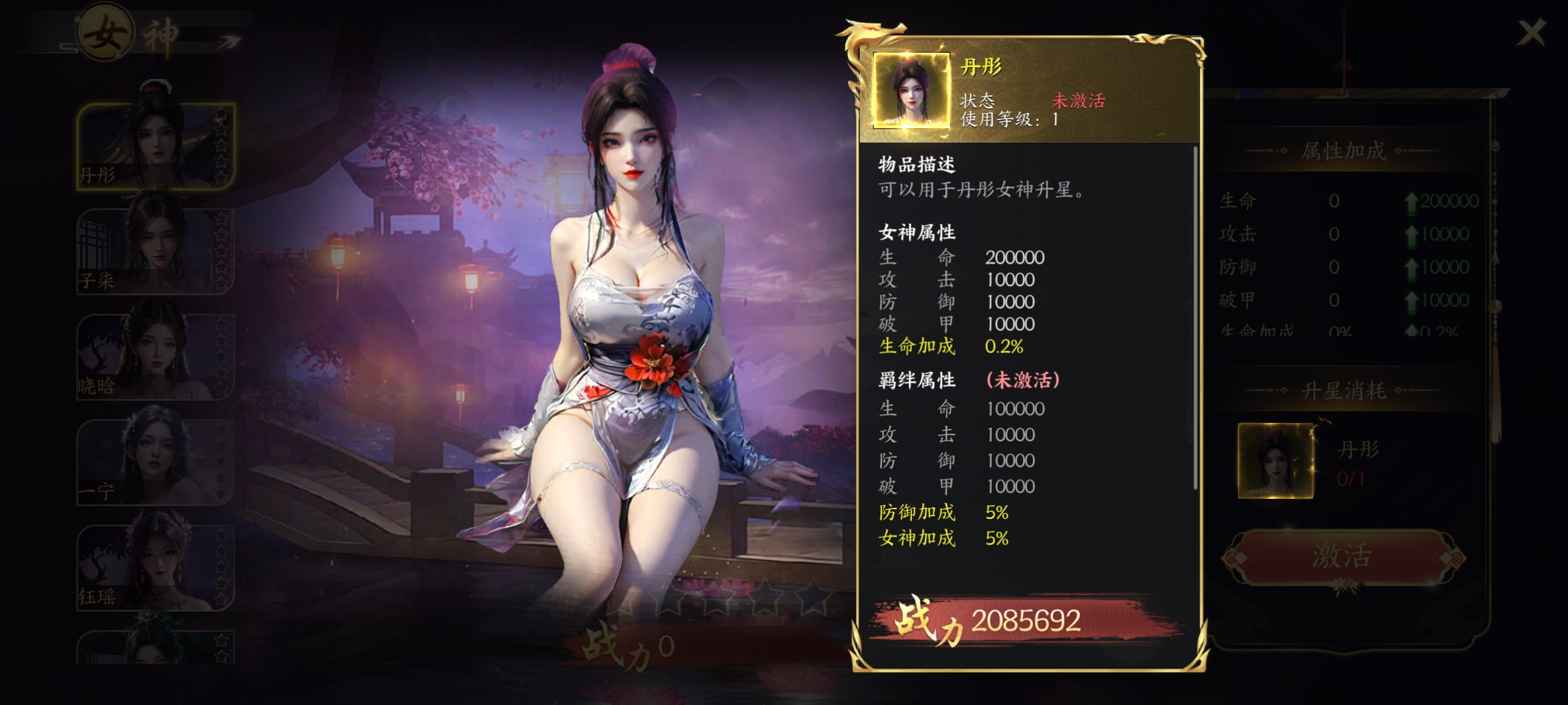 全新「女神」系统重磅登场!收集绝美女神卡牌,激活专属属性加成,解锁羁绊传说,颜值与战力双丰收,助你驰骋江湖,一路开挂! 绝美女神,颜值拉满 + 首批女神惊艳登场:丹彤、子柒、晓晗、一宁、钰瑶…+每一位都拥有顶级国风颜值,造型精致,细节拉满,收藏党狂喜! 以丹彤为例: + -+银纹旗袍造型,红妆点缀,国风氛围感拉满 -+激活即涨战力+2085692,基础属性直接拉满 -+女神属性:生命200000、攻击10000、防御10000、破甲10000,更有0.2%生命加成 升星养成,战力持续飙升 + -+收集对应女神卡牌,即可激活女神,解锁基础属性 -+消耗同名女神卡升星,星级越高,属性加成越爆炸 女神羁绊,额外属性加持 + 解锁「洛神之资」等专属羁绊,集齐对应女神,即可激活羁绊属性: + -+生命+100000、攻击+10000、防御+10000、破甲+10000 -+5%防御加成+5%女神加成,全方位提升角色战力 -+多套羁绊待解锁,收集越多,加成越多,上限无限 覆盖生命、攻击、防御、破甲、百分比加成等全维度属性,PVE/PVP双模式通吃,助你横扫副本、称霸跨服! 红颜相伴,战力无双! 「女神系统」不仅有颜值拉满的绝美女神,更有爆炸战力的属性加成。 即刻登录游戏,参与活动,收集女神,解锁羁绊,登顶全服巅峰,就在此刻!