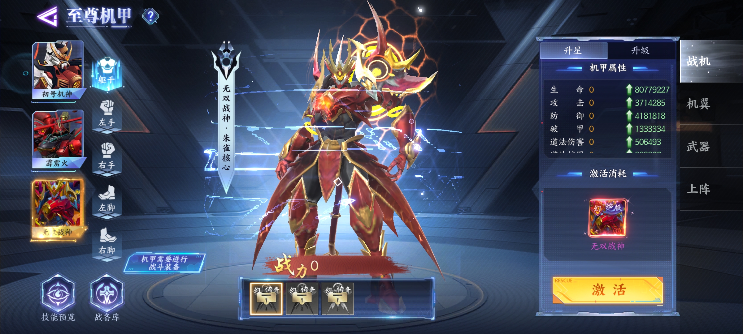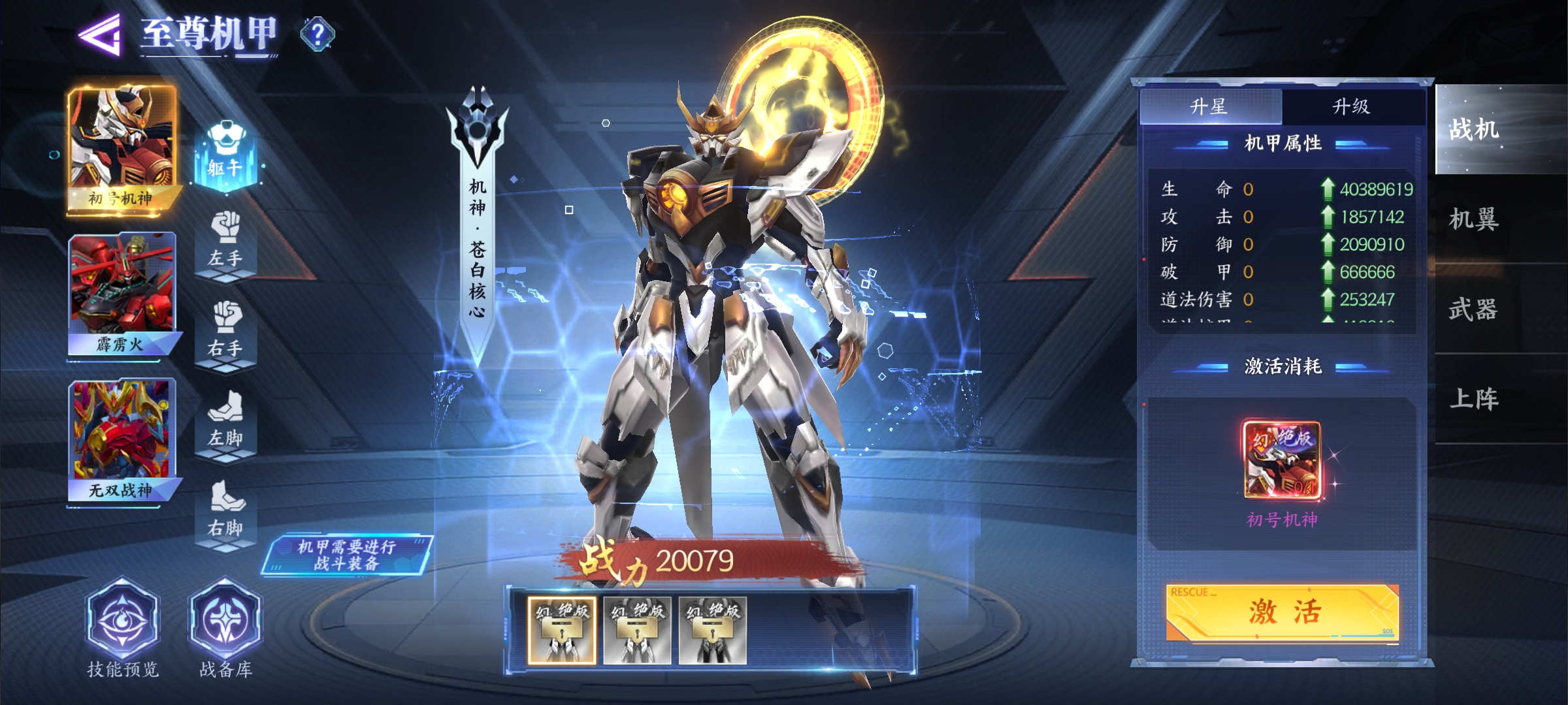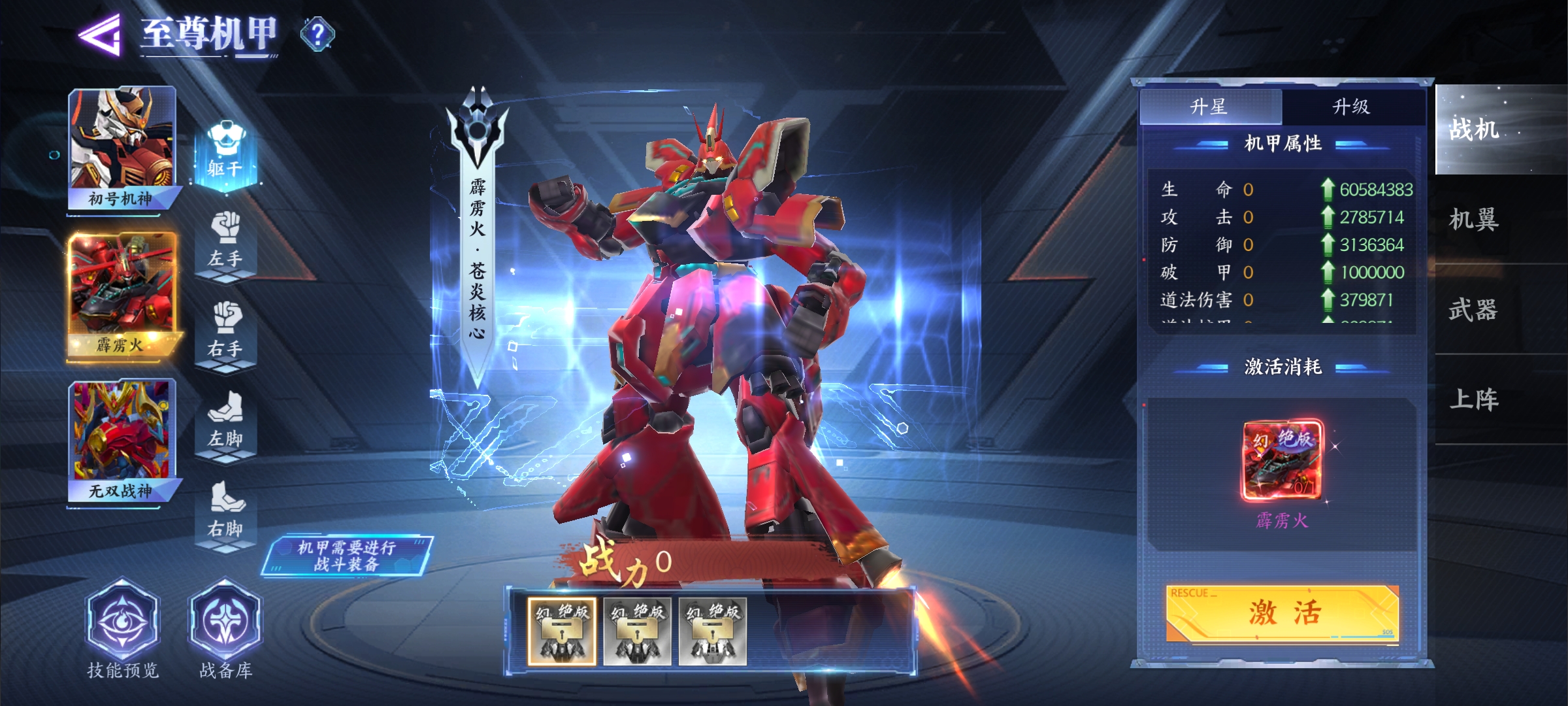 「至尊机甲」重磅登场!多款绝版机甲同步上线,自由DIY机甲外观,解锁专属技能,爆炸战力加成,助你驰骋战场,制霸全服! + + +绝版机甲全解析:颜值与战力双天花板 + 1.+初号机神·苍白核心 + -+外观颜值:白金银甲造型,金环光环加持,科技感拉满,机甲美学巅峰 -+爆炸属性:激活即提供海量属性加成:生命+40389619、攻击+1857142、防御+2090910、破甲+666666、道法伤害+253247,战力直接起飞 -+定位:均衡型机甲,攻防一体,全场景适配 + 2.+霹雳火·苍炎核心 + -+外观颜值:赤红烈焰机甲,火焰推进器,热血感拉满,燃炸全场 -+爆炸属性:属性全面超越,生命+60584383、攻击+2785714、防御+3136364、破甲+1000000、道法伤害+379871,输出能力拉满 -+定位:输出型机甲,PVE/PVP双模式通吃 + 3.+无双战神·朱雀核心 + -+外观颜值:朱雀炎甲造型,金纹点缀,霸气无双,战神气场拉满 -+爆炸属性:版本顶级属性,生命+80779227、攻击+3714285、防御+4181818、破甲+1333334、道法伤害+506493,战力天花板级别 -+定位:全能型机甲,版本T0,称霸全服 + 玩法规则详解 + 1. 机甲结构:每个机甲拥有8个部位,激活后自动获得躯干+四肢5个基础部位,羽翼、武器可自由替换 2. 出战要求:出战需至少选择1把武器,武器类型决定技能效果;同套羽翼解锁主动突进技能 3. 外观与战力:机甲外观仅为展示,不影响战力与技能伤害,颜值战力双自由 4. 变身限制:机甲变身状态下,无法切换武器,专注输出 + 机甲狂潮,战力无双!