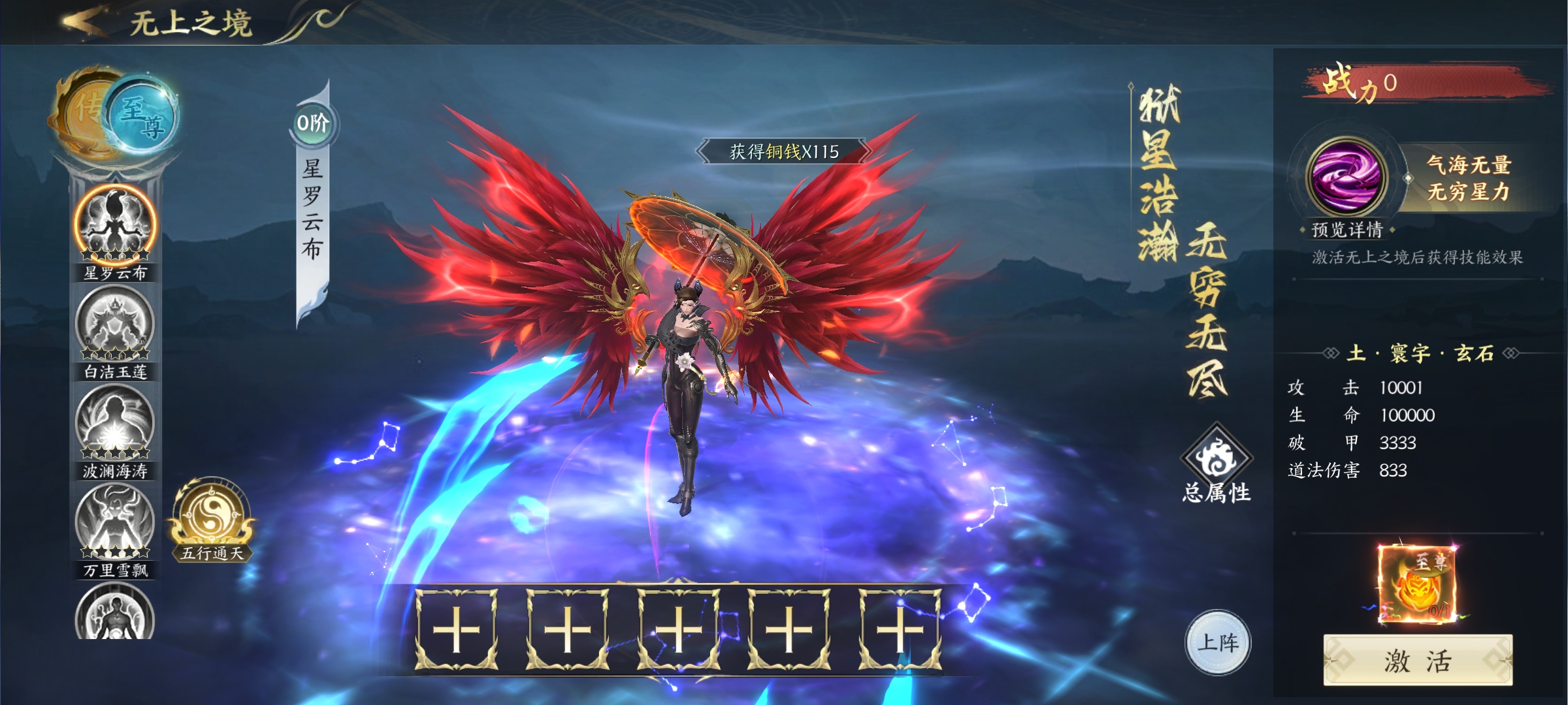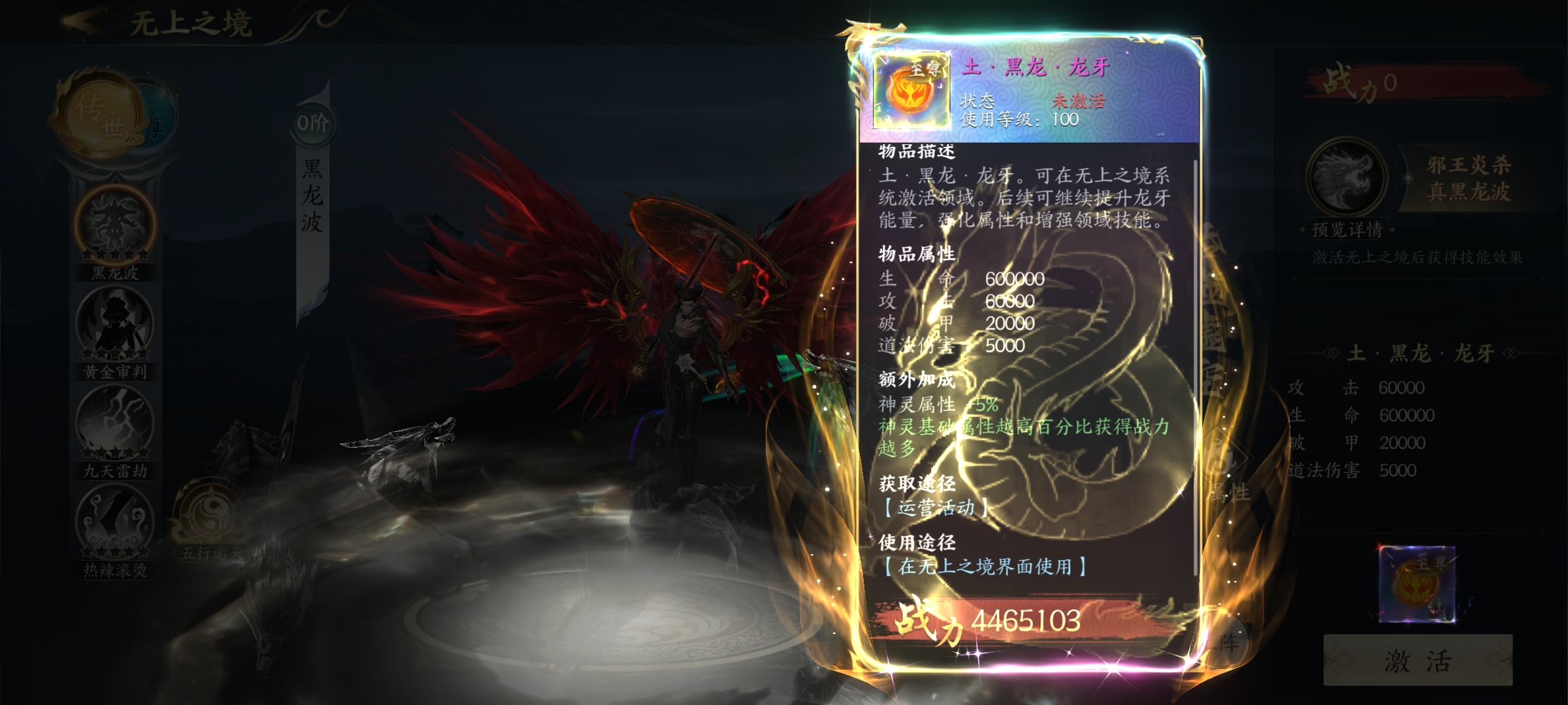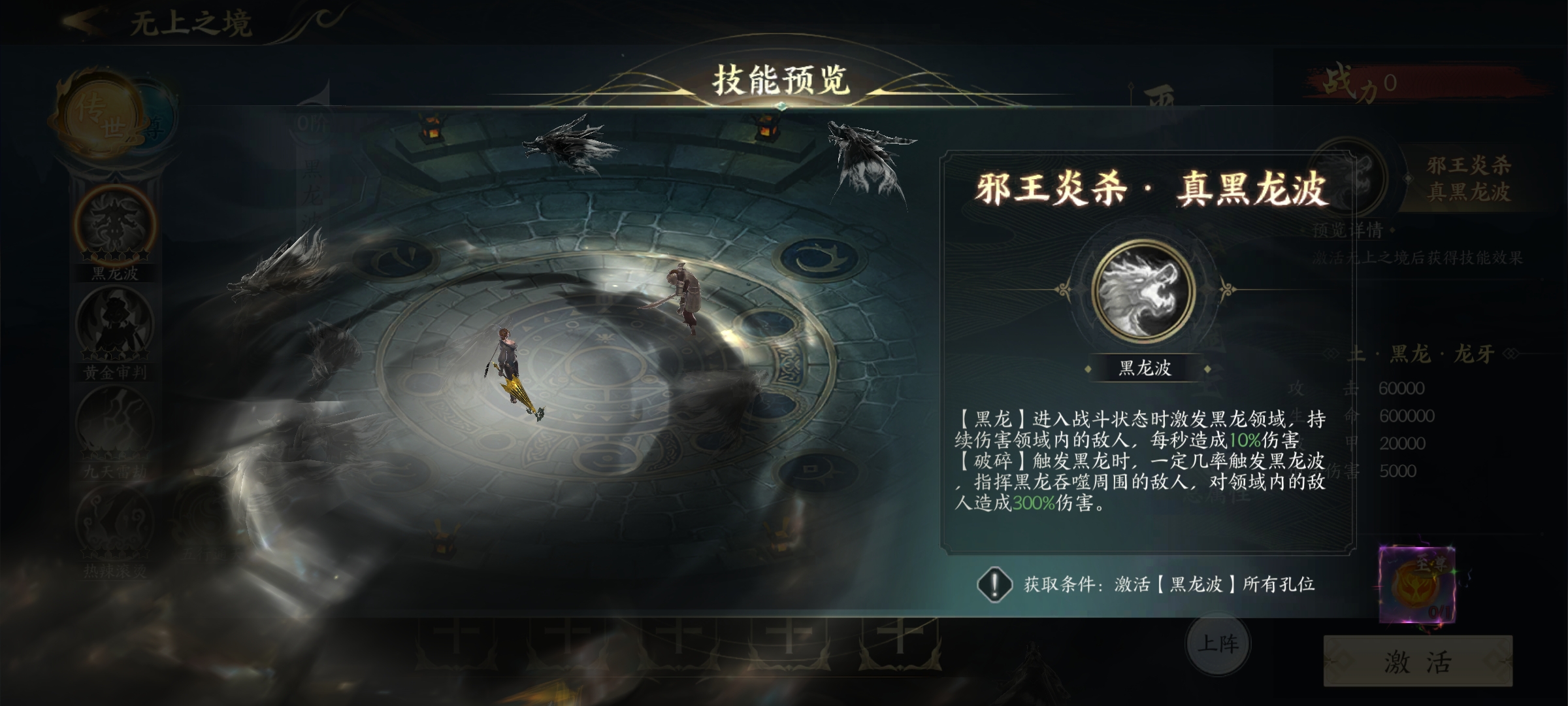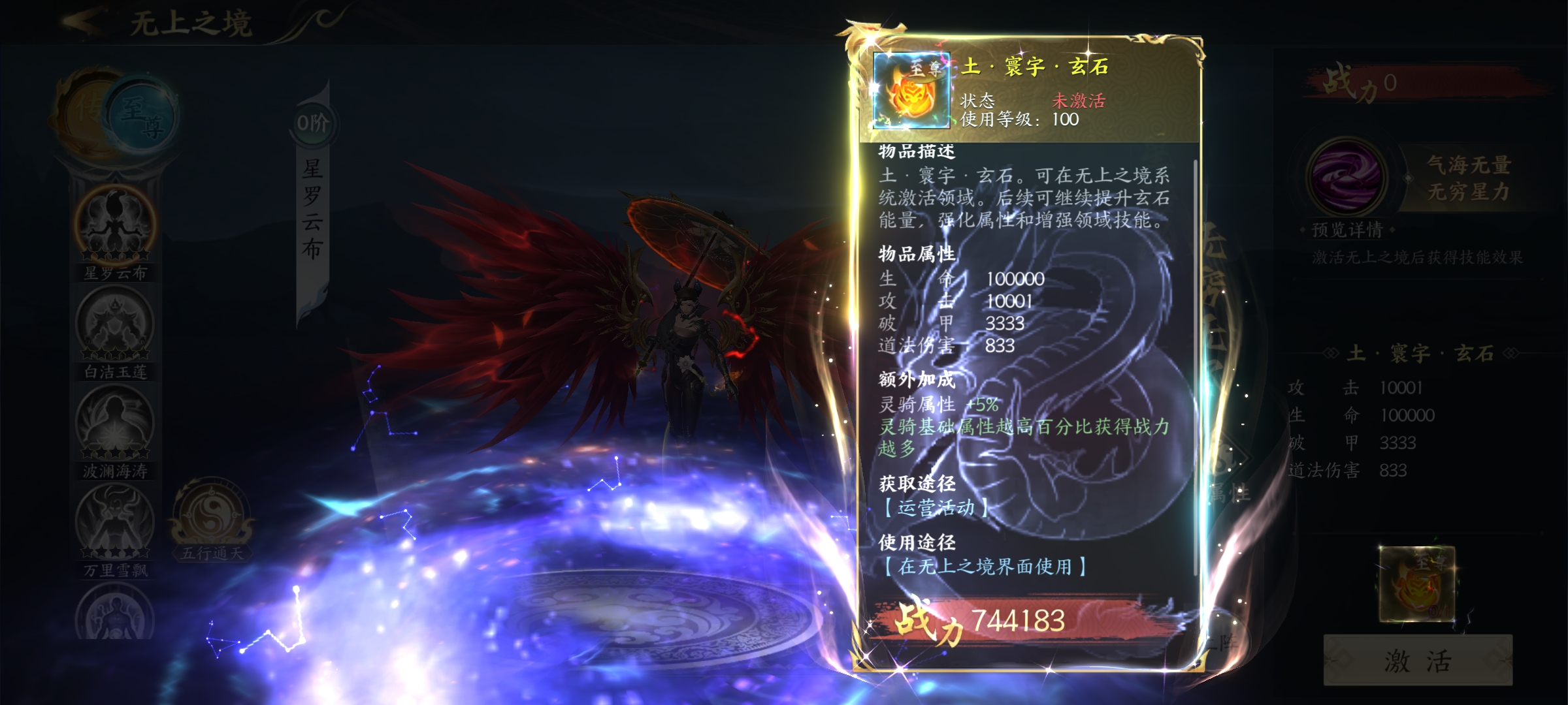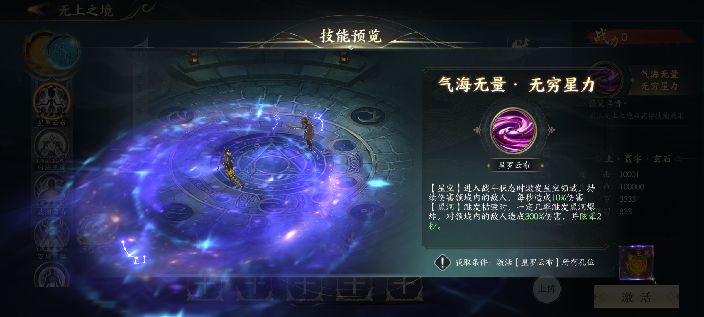 「无上之境」重磅登场!解锁专属领域,激活至尊玄石,解锁全屏领域技能,爆炸战力加成,助你驰骋战场,制霸全服! + + 🗡️+两大顶级领域全解析 + 1.+星罗云布·星空领域 + -+外观颜值:紫电星空特效,星轨环绕,氛围感拉满,视觉效果炸裂 -+核心玄石:土·寰宇·玄石 -+激活即涨战力+744183 -+基础属性:生命+100000、攻击+10001、破甲+3333、道法伤害+833 -+额外加成:灵骑属性+5%,灵骑基础属性越高,战力加成越多 -+专属技能:气海无量·无穷星力 -+【星空】进入战斗自动激发星空领域,每秒对领域内敌人造成10%持续伤害 -+【黑洞】触发枯荣时,概率触发黑洞爆炸,对领域内敌人造成300%伤害+2秒眩晕 -+获取条件:激活星罗云布所有孔位,解锁全屏控场能力 + 2.+黑龙波·灭世领域 + -+外观颜值:黑龙环绕,暗影吞噬,霸气无双,战神气场拉满 -+核心玄石:土·黑龙·龙牙 -+激活即涨战力+4465103,版本顶级属性 -+基础属性:生命+600000、攻击+60000、破甲+20000、道法伤害+5000 -+额外加成:神灵属性+5%,神灵基础属性越高,战力加成越多 -+专属技能:邪王炎杀·真黑龙波 -+【黑龙】进入战斗自动激发黑龙领域,每秒对领域内敌人造成10%持续伤害 -+【破碎】触发黑龙时,概率触发真黑龙波,指挥黑龙吞噬敌人,造成300%范围伤害 -+获取条件:激活黑龙波所有孔位,全屏秒杀,BOSS瞬秒 颜值与战力双在线 + -+每套领域都有专属特效,星空、黑龙等顶级视觉效果,行走江湖回头率100% -+爆炸属性加成,百分比加持,灵骑/神灵双体系增益,全方位提升角色战力 -+参与方式:参与运营活动即可获取玄石,激活领域、升星、解锁专属技能