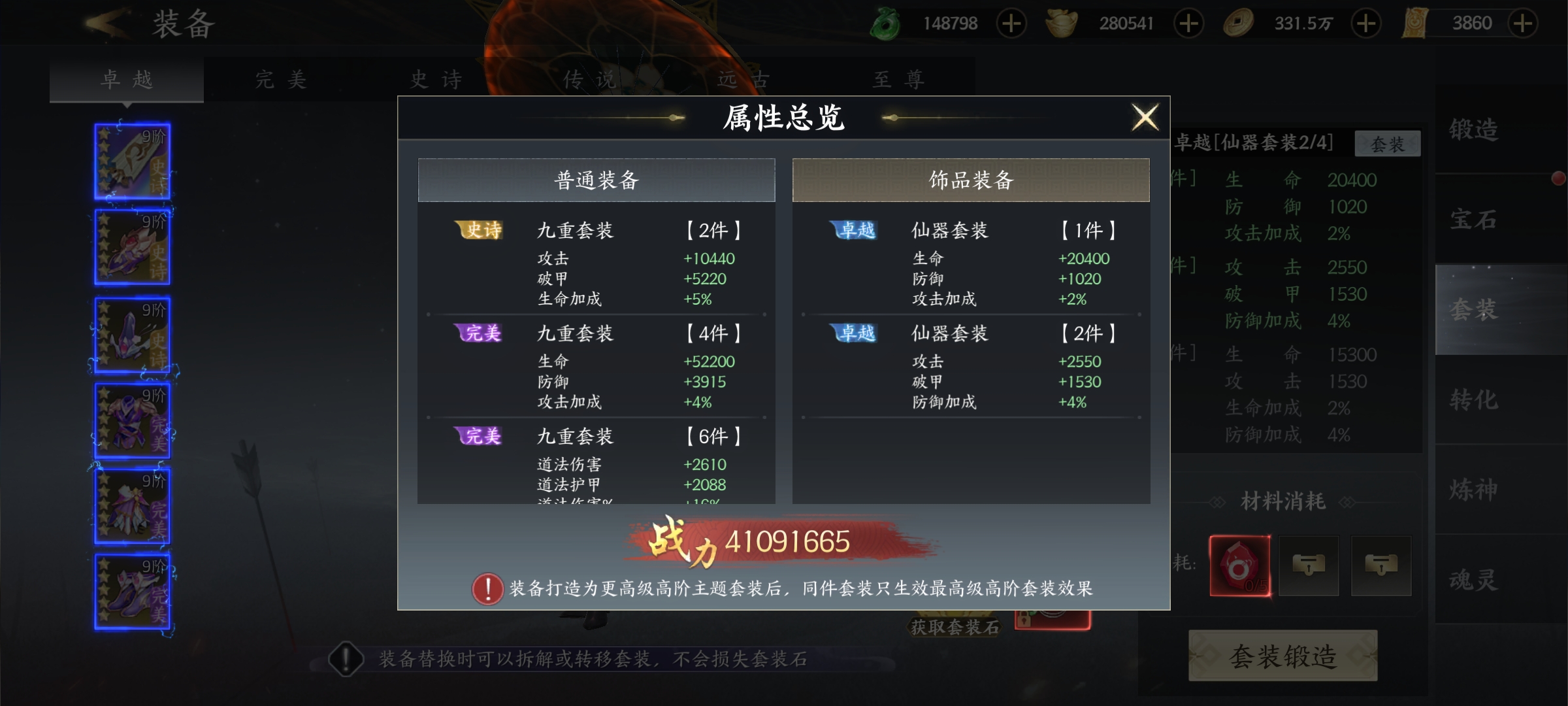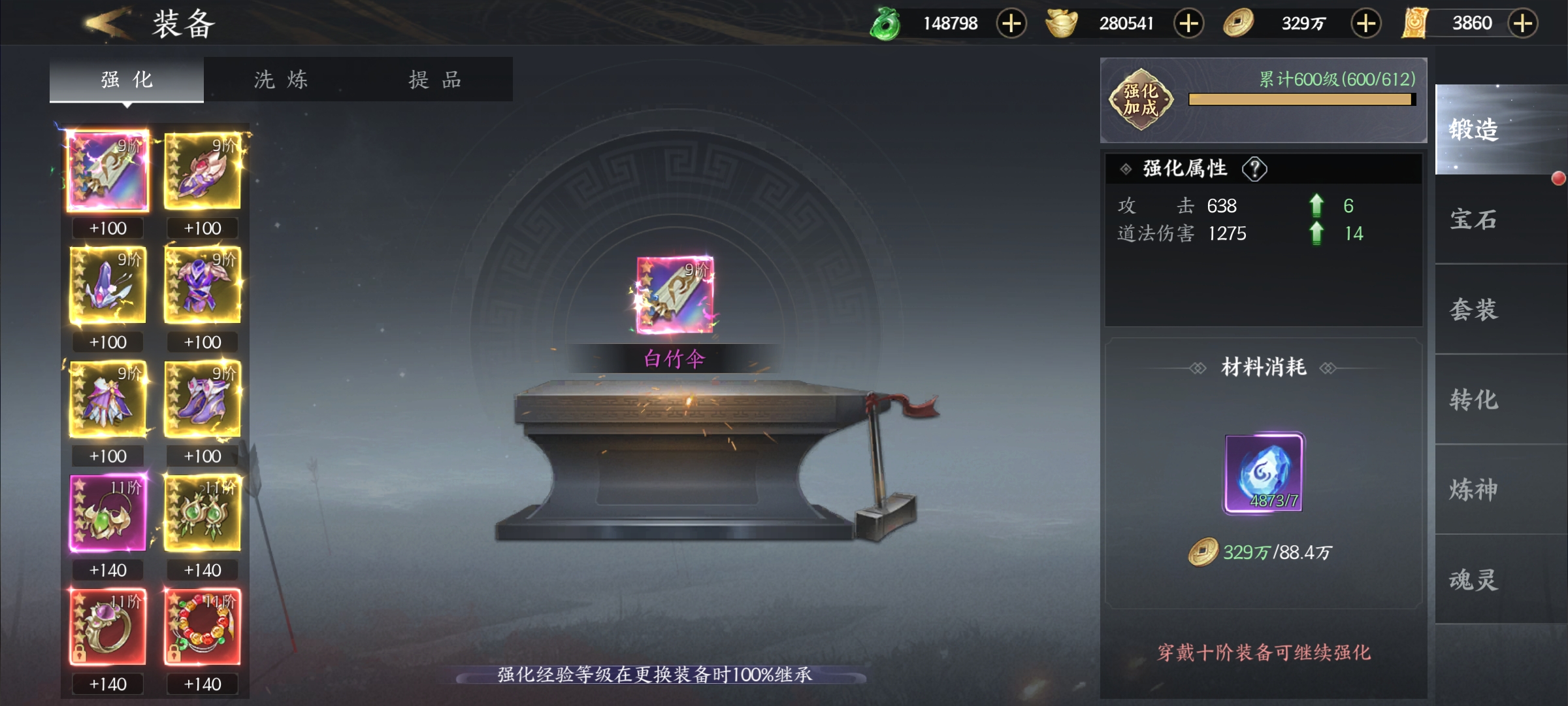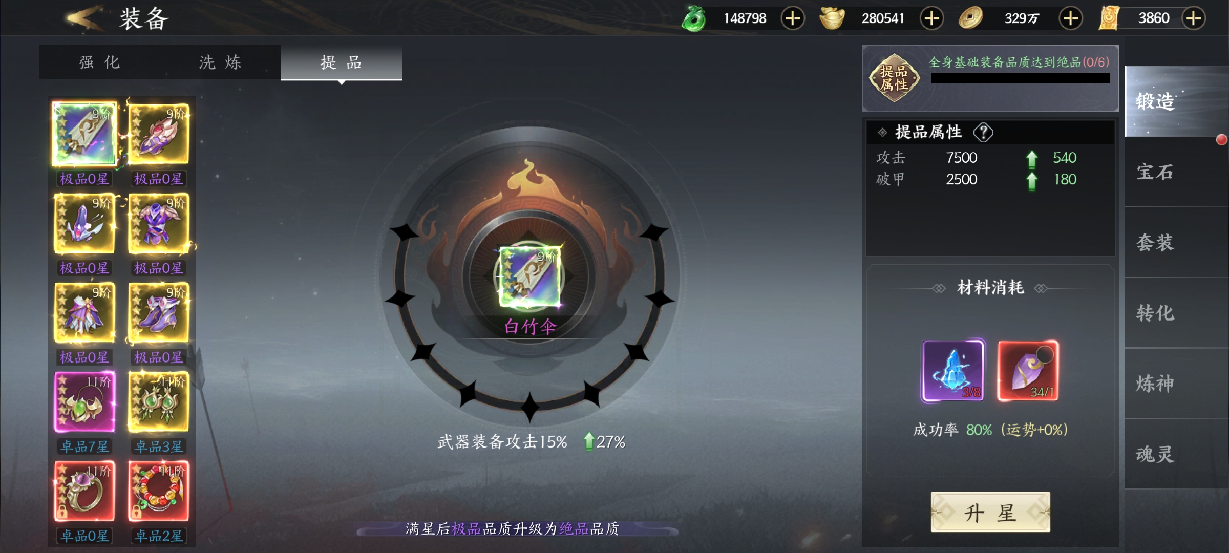 消耗强化水晶可对装备进行强化。提升属性。 1. 强化等级越高,强化属性加成越高 2. 普通装备与仙器装备全身强化达到一定等级,可激活对应的额外属性加成 3. 阶数越高的装备,强化等级上限越高 4. 替换装备无损继承强化等级与属性 强化经验:100%经验无损继承 装备洗炼+ 1. 洗炼共分5个槽位,装备星数决定激活对应洗炼条数,例如:3星装备解锁3条洗炼属性 2. 洗炼可对装备星级属性进行属性值的百分比提升 3. 高星装备替换低星装备时,未生效的槽位百分比加成暂时失效,但仍保留洗炼品质 4. 洗炼品质越高,洗炼百分比加成越高 5. 一键洗炼将会自动消耗洗炼石,直到洗炼出任意一条橙色及橙色以上品质属性。 +洗炼锁定 1. 锁定属性将额外消耗灵玉,洗炼时保留锁定的洗炼品质 2. 未生效的洗炼槽也可进行锁定和洗炼 + 洗炼加成 + 5个槽位洗炼至指定品质时,可激活洗炼额外属性 + 提品规则 + 1. 提品等级分为:凡、卓、极、绝、灵、仙、圣、神、荒 2. 提品后将改变装备的后缀名称,提高装备的基础属性 3. 装备阶数越高,提品上限越高 4. 更换装备会自动无损转移提品等级和属性 5. 当基础装备或者仙器达到指定提品品级时,可分别额外激活提品加成,提品加成可激活大量百分比属性