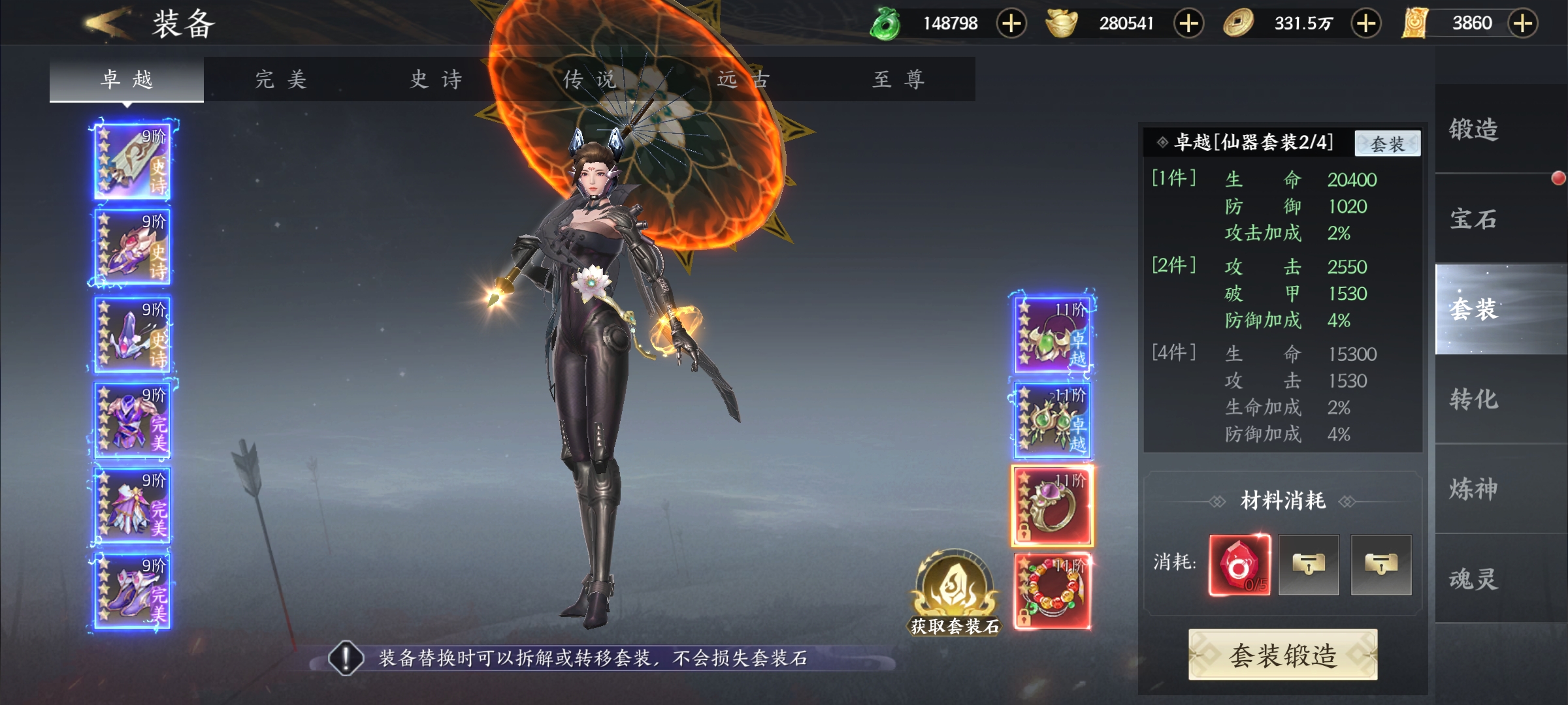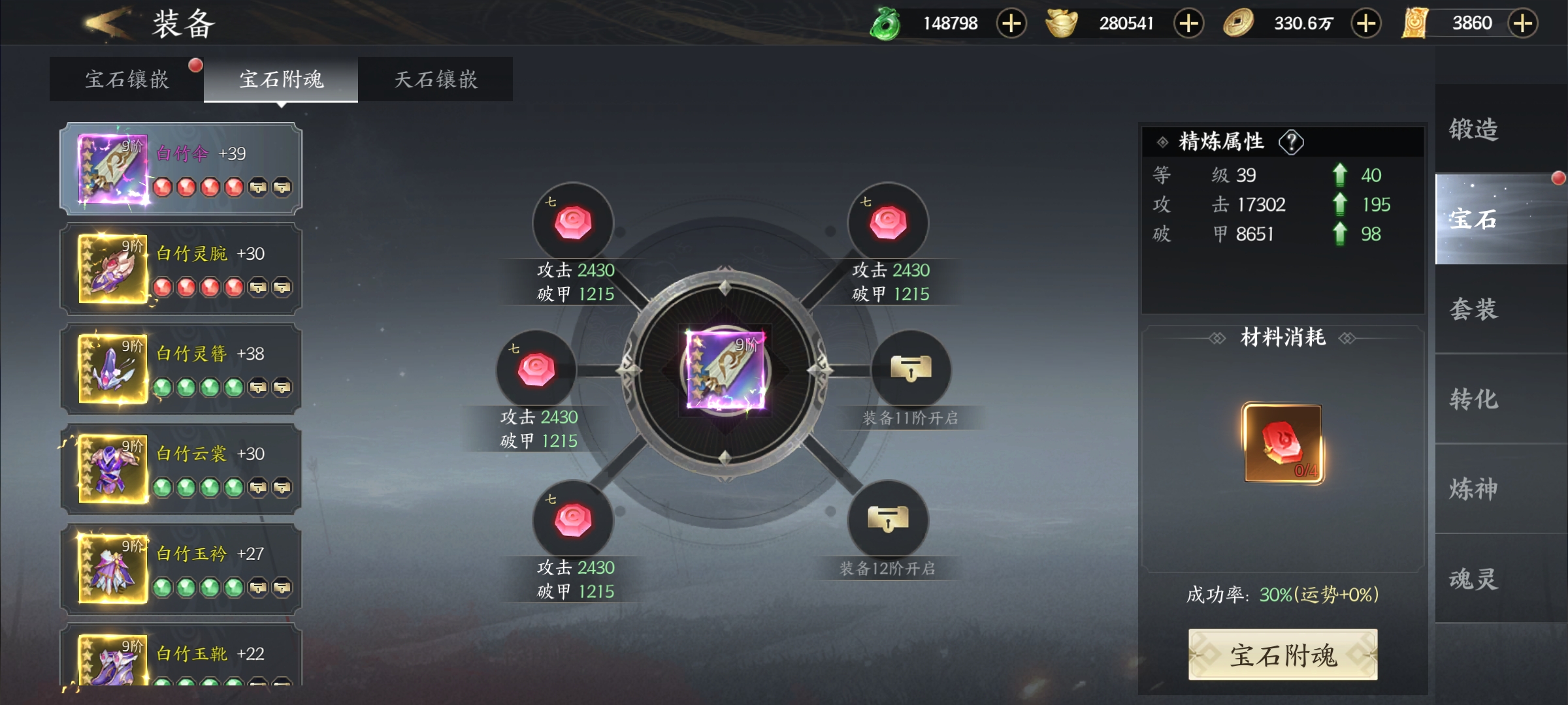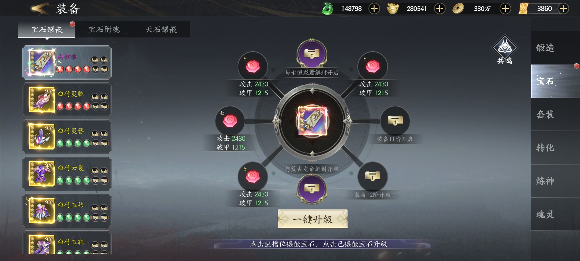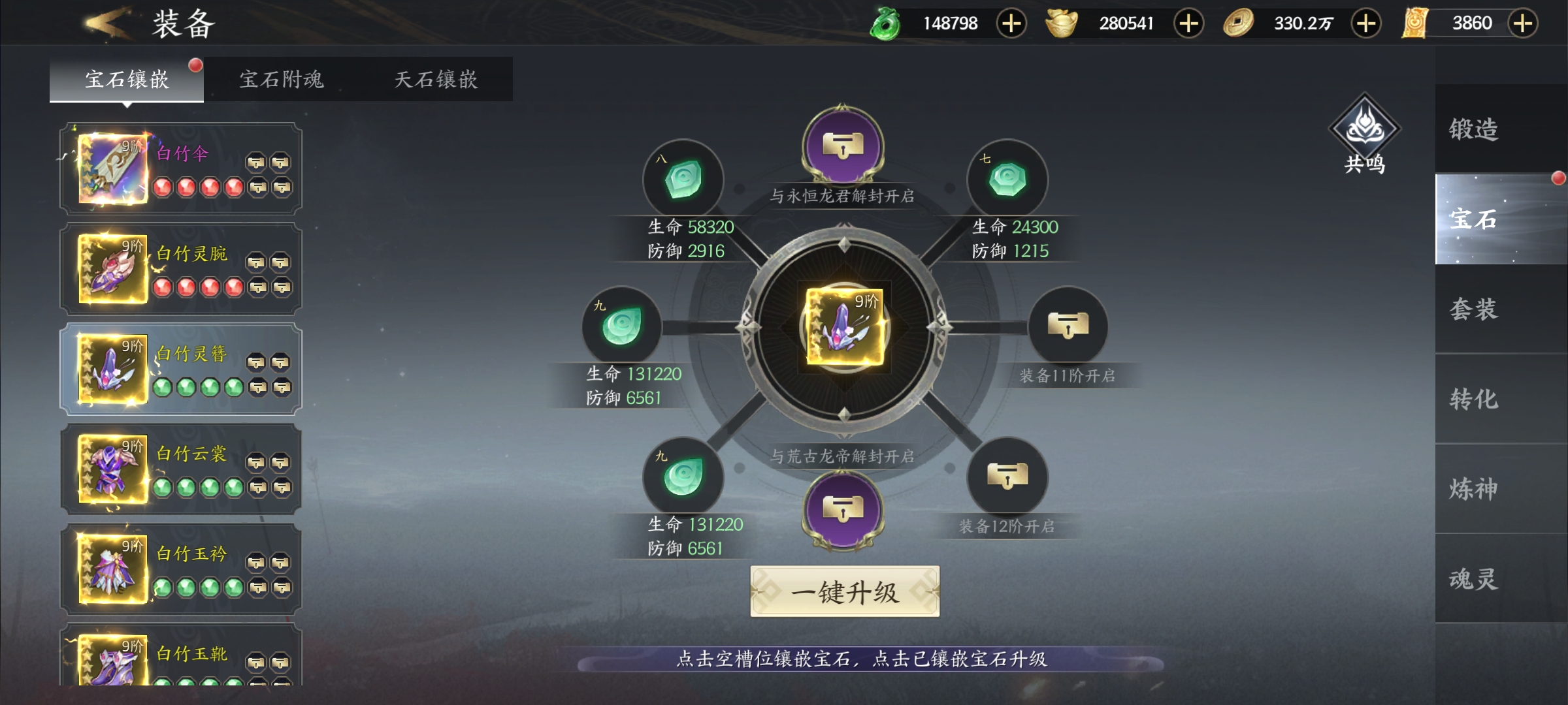消耗强化水晶可对装备进行强化。提升属性。 1. 强化等级越高,强化属性加成越高 2. 普通装备与仙器装备全身强化达到一定等级,可激活对应的额外属性加成 3. 阶数越高的装备,强化等级上限越高 4. 替换装备无损继承强化等级与属性 强化经验:100%经验无损继承 装备洗炼+ 1. 洗炼共分5个槽位,装备星数决定激活对应洗炼条数,例如:3星装备解锁3条洗炼属性 2. 洗炼可对装备星级属性进行属性值的百分比提升 3. 高星装备替换低星装备时,未生效的槽位百分比加成暂时失效,但仍保留洗炼品质 4. 洗炼品质越高,洗炼百分比加成越高 5. 一键洗炼将会自动消耗洗炼石,直到洗炼出任意一条橙色及橙色以上品质属性。 +洗炼锁定 1. 锁定属性将额外消耗灵玉,洗炼时保留锁定的洗炼品质 2. 未生效的洗炼槽也可进行锁定和洗炼 + 洗炼加成 + 5个槽位洗炼至指定品质时,可激活洗炼额外属性 + 提品规则 + 1. 提品等级分为:凡、卓、极、绝、灵、仙、圣、神、荒 2. 提品后将改变装备的后缀名称,提高装备的基础属性 3. 装备阶数越高,提品上限越高 4. 更换装备会自动无损转移提品等级和属性 5. 当基础装备或者仙器达到指定提品品级时,可分别额外激活提品加成,提品加成可激活大量百分比属性