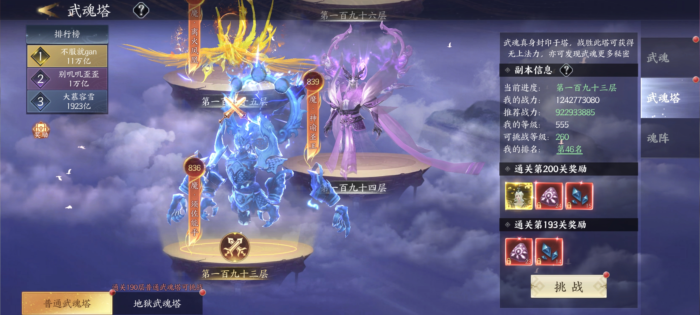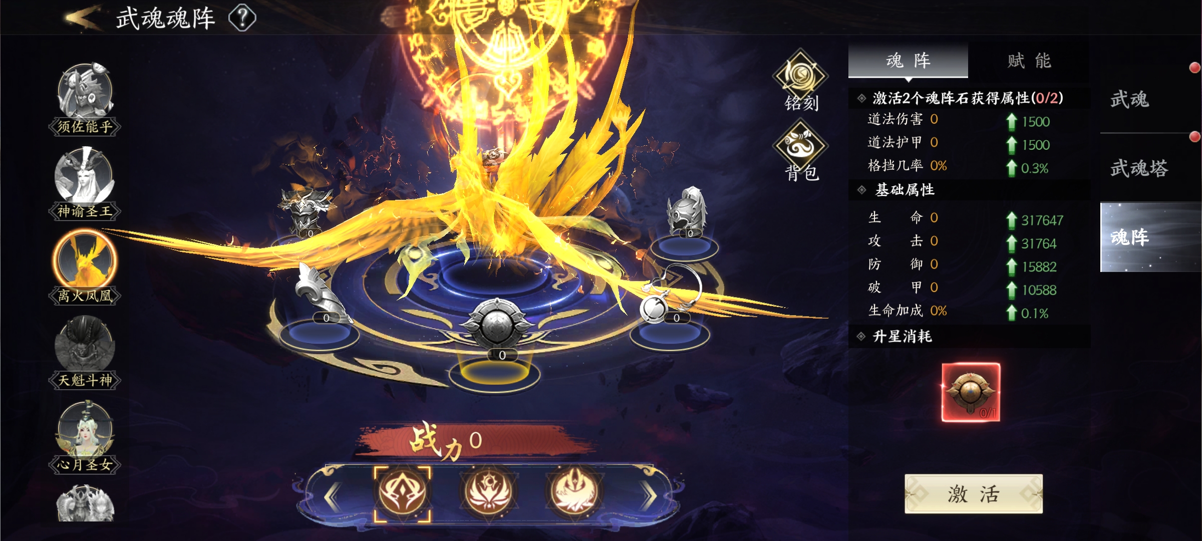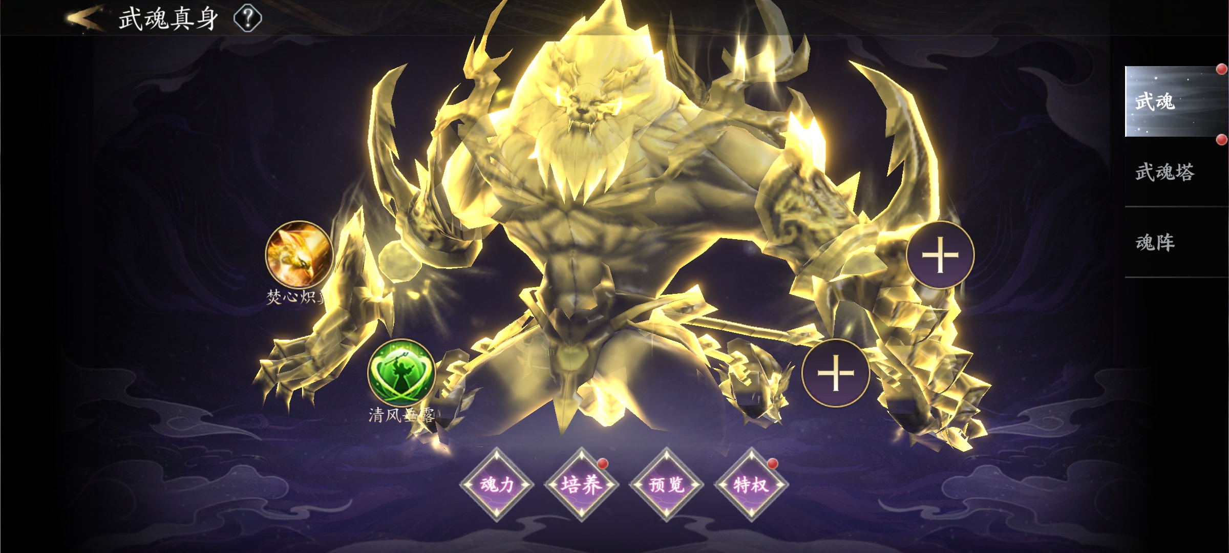 + 武魂形象: + 1、获得武魂后,可以在角色背后幻化出巨型武魂(触发武魂技能时)。 2、武魂可以无限变大,每一次突破都可以将灵体增长。 + 武魂之力: + 1、不同的武魂拥有不同的武魂之力,武魂之力在计算时,会单独计算,不与其他武魂之力相加。 2、需要在技能上阵处,选择角色技能上阵武魂技能。在使用对应角色技能时,有一定几率触发对应武魂技能。 3、武魂技能的触发几率,会根据对方和自身的武魂之力差距进行几率修正。差距越大,释放几率越大。 武魂塔 + 1、武魂塔每天都可以无限挑战。 2、通关可获得大量的奖励,可以迅速提升自身的战力。 3、每层武魂塔只可通关一次。 4、每天0点根据通关层数的排名发放排名奖励,排名越高奖励越丰厚,只有排名在前一百名的玩家才有对应的排名奖励。 5、武魂塔分为普通武魂塔和地狱武魂塔,地狱武魂塔难度更高,奖励更加丰厚 武魂魂阵 + 1、只有激活武魂才可以激活武魂对应的魂阵。 2、需要激活魂阵对应的全部魂阵石才可激活魂阵。 3、魂阵会根据武魂灵体的变大而一起变大。 4、一个武魂只能佩戴一个魂阵,多余的魂阵可以提升武魂的战力。 5、只有激活之后的魂阵石才可进行赋能、镶嵌刻印、叠阵升品,提升魂阵战力。 6、魂阵石镶嵌的刻印等级越高,对自身的赋能加成也越高。 7、魂阵的叠阵品阶越高对自身镶嵌的刻印加成也越高