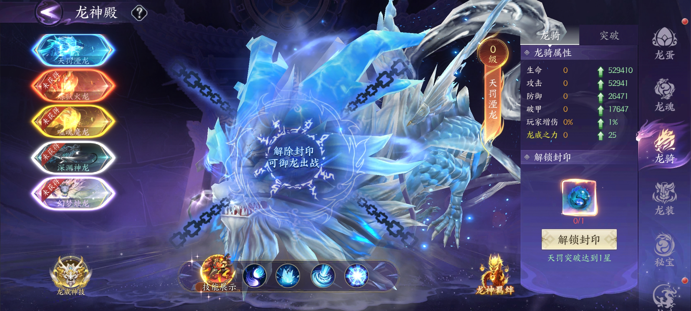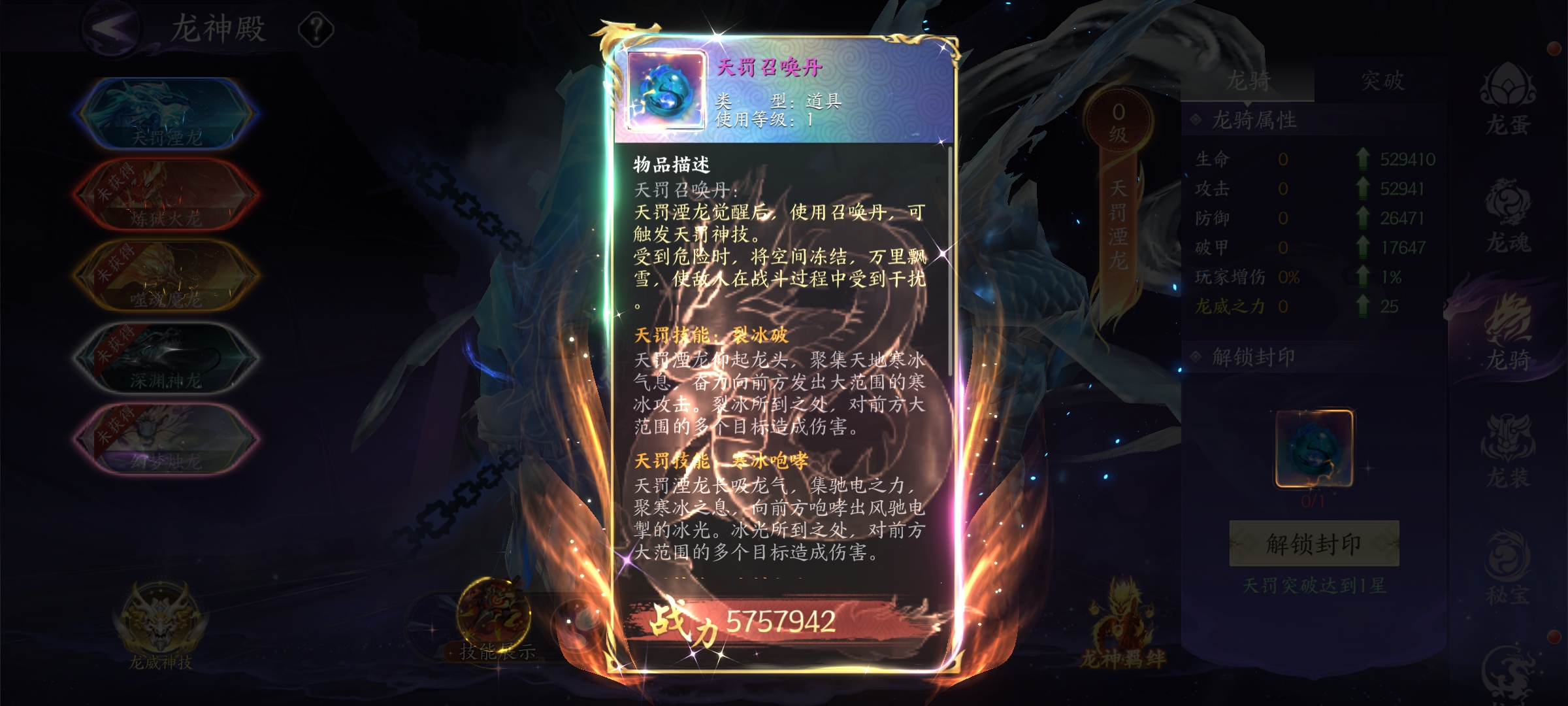 升级龙神,解锁多重超强增益,助你横扫副本、制霸全服: ✅+BOSS秒杀概率UP:升级龙神等级,大幅提升BOSS秒杀概率,刷本效率直接拉满! ✅+秘宝寻宝次数+1:龙神达到指定等级,额外增加秘宝寻宝次数,稀有道具拿到手软! ✅+全新龙蛋孵化:解锁更多龙蛋,孵化专属龙神,解锁更强战力! ✅+材料掉落大升级:龙神等级越高,材料掉落概率越高、掉落上限越高,养成资源再也不愁! 🐉+首尊龙神「天罚湮龙」登场 + 冰寒之力,万龙之首!首只可解锁龙神天罚湮龙震撼亮相,解锁即享海量属性加成: + -+生命+529410、攻击+52941、防御+26471、破甲+17647,玩家增伤+1%,龙威之力+25,战力直接暴涨5757942! -+两大专属神技,战场制霸: 🔹+裂冰破:聚集天地寒冰气息,向前方发出大范围寒冰攻击,对多个目标造成高额伤害! 🔹+寒冰咆哮:长吸龙气,集驰电之力,咆哮出风驰电掣的冰光,大范围清场,干扰敌方战斗节奏! -+解锁条件:使用「天罚召唤丹」,将天罚突破至1星,即可解除封印,御龙出战! -+解锁龙神,即可激活龙威神技,战斗中触发天罚神技,冻结空间、万里飘雪,危机时刻逆转战局! -+集齐五大龙神(炼狱火龙、噬魂魔龙、深渊神龙、幻梦烛龙),激活龙神羁绊,解锁终极属性,战力再登巅峰! -+龙蛋孵化、龙魂养成、龙装打造,全方位养成体系,打造专属最强龙神!
