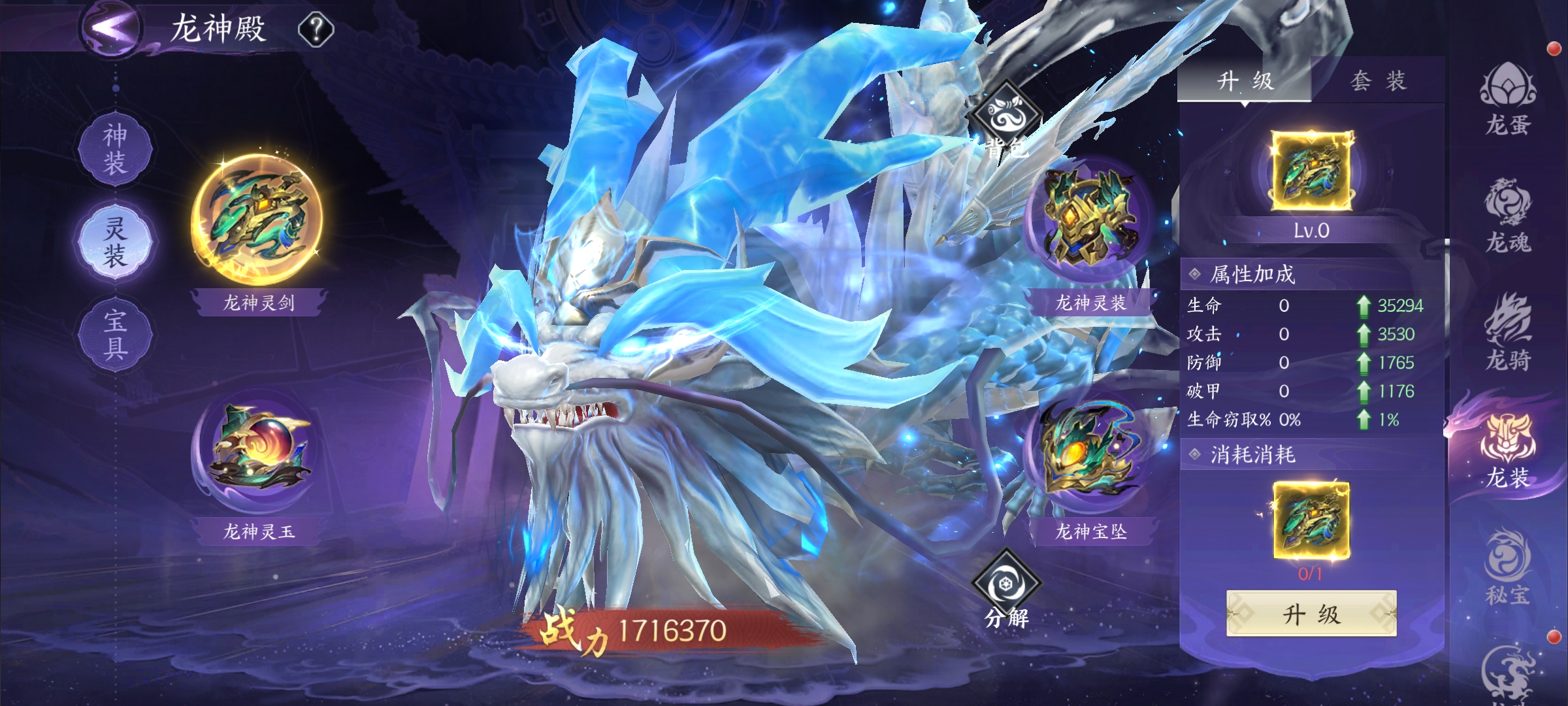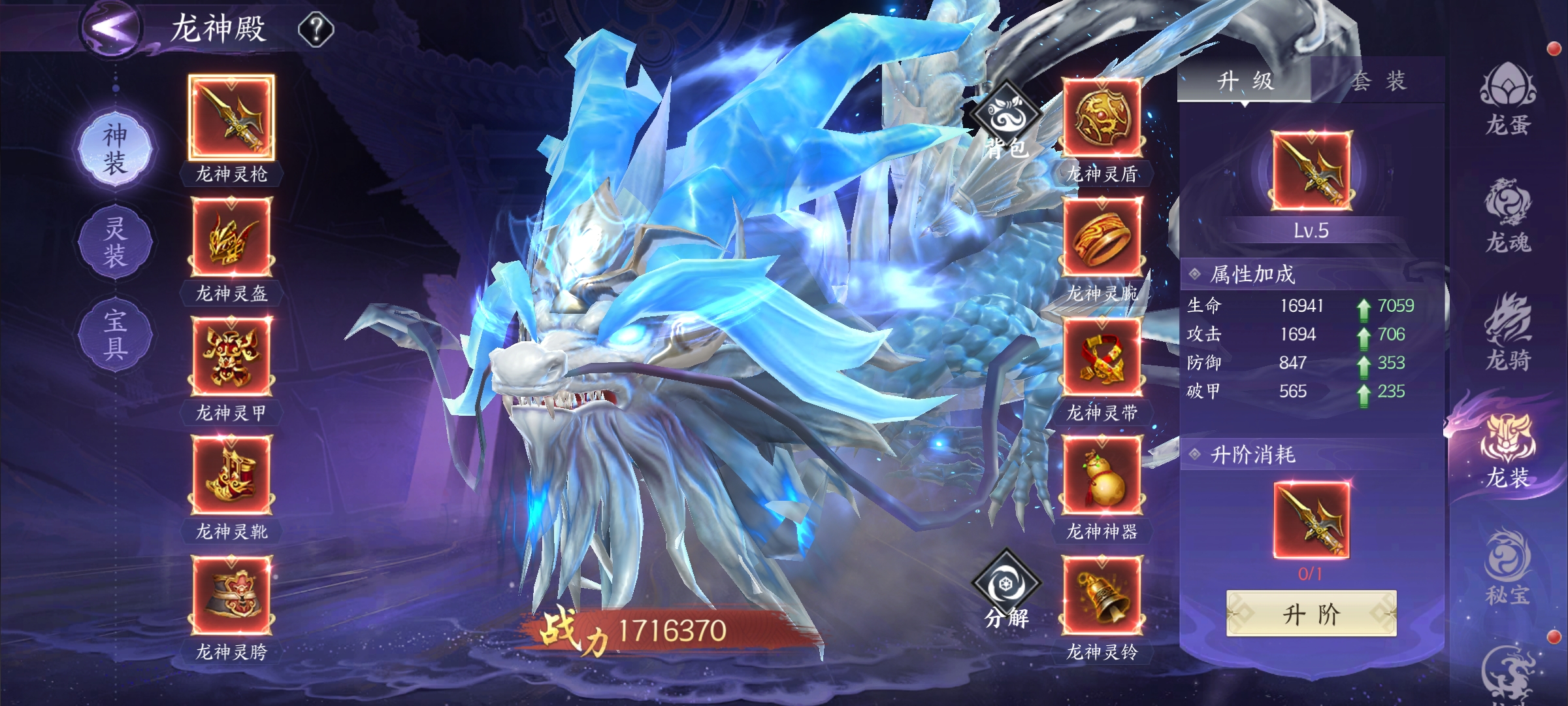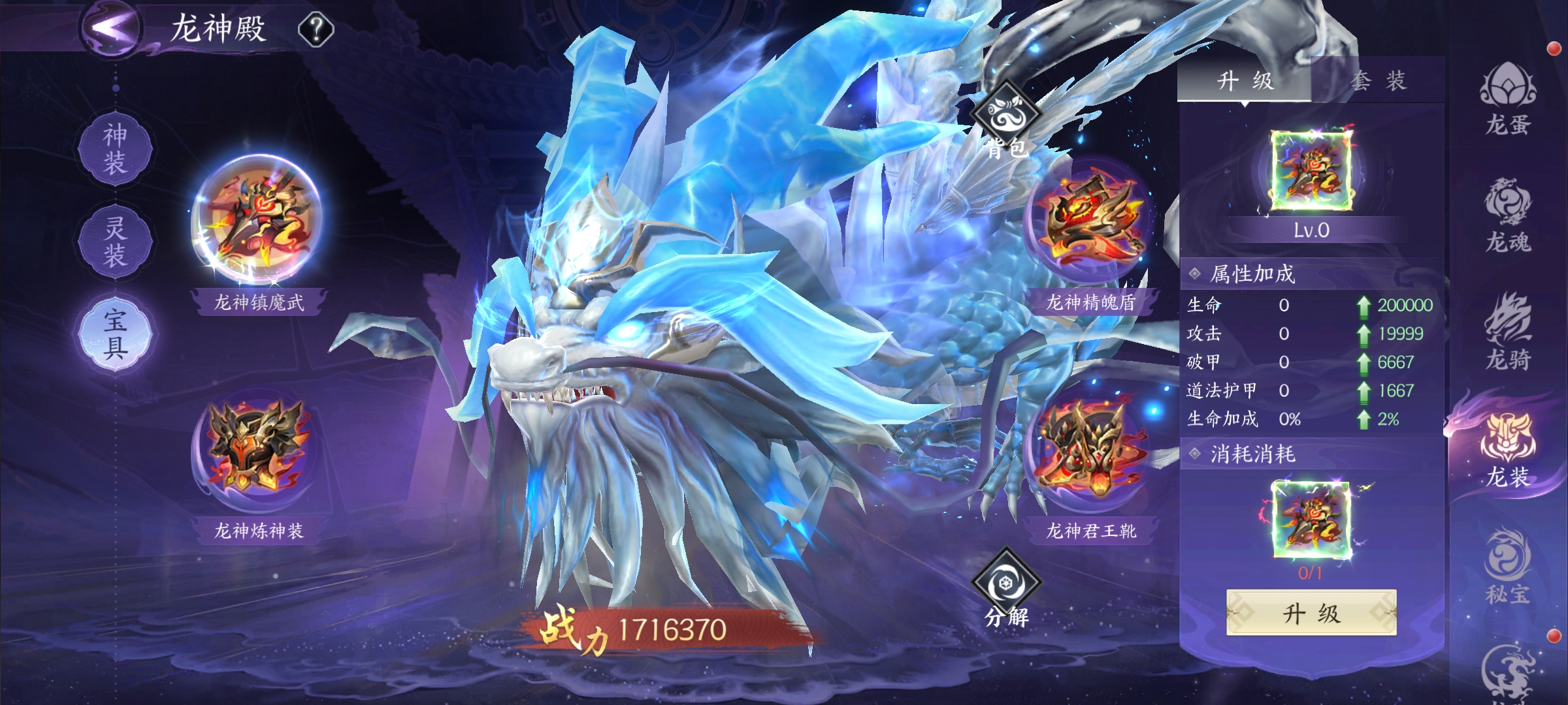 1.+神装体系(10件套) + -+包含:龙神灵枪、灵盔、灵甲、灵靴、灵胯、灵盾、灵腕、灵带、神器、灵铃 -+核心福利:集齐10件激活超强套装属性,单件升级即可获得生命/攻击/防御/破甲四维加成,升阶战力持续暴涨! -+满级单件属性参考(Lv.5):生命+7059、攻击+706、防御+353、破甲+235,全套拉满属性爆炸! 2.+灵装体系(4件套) + -+包含:龙神灵剑、灵玉、灵装、宝坠 -+核心福利:集齐4件激活强力技能,附带生命窃取%等稀有属性,0级单件即享生命+35294、攻击+3530、防御+1765、破甲+1176,开局即巅峰! 3.+宝具体系(4件套) + -+包含:龙神镇魔武、炼神装、精魄盾、君王靴 -+核心福利:集齐4件激活强力技能,附带生命加成%等顶级属性,0级单件即享生命+200000、攻击+19999、破甲+6667,直接拉满生存与输出! 龙装说明 装备激活后可使用对应部位的装备碎片进行强化升级,增加装备属性加成。 达到一定等级后需要消耗装备本身进行突破。 装备可通过在龙神秘宝的各类宝库中寻宝获得。 多余的出口装备可分解成装备碎片