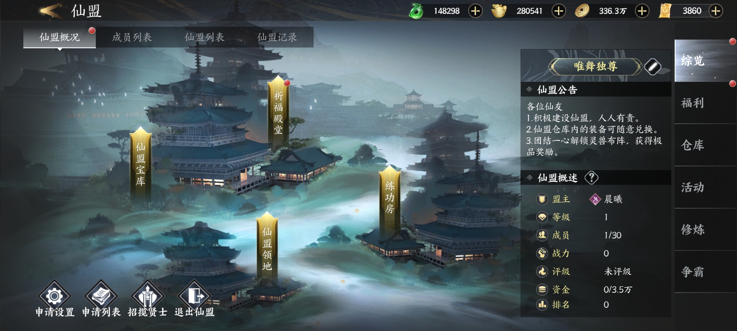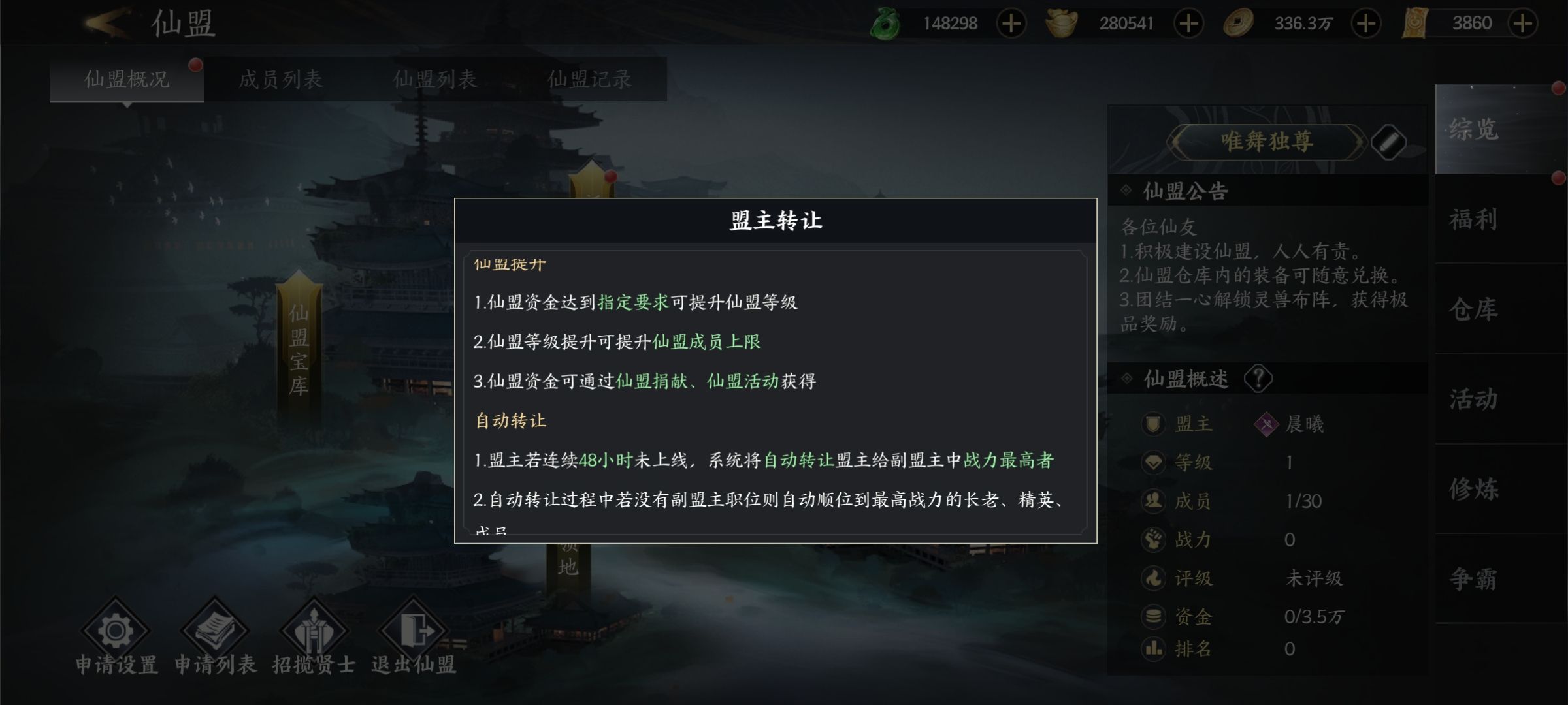 仙盟核心:共建仙门,福利共享 + 仙盟概况:打造专属仙门 + -+仙盟建设:仙盟资金达标即可升级仙盟等级,提升成员上限,解锁更多玩法;资金可通过仙盟捐献、仙盟活动获取,全员共建,人人有责! -+自动传承机制:盟主连续48小时未上线,系统自动将盟主之位转让给副盟主中战力最高者,无副盟主则顺延至高战力长老/精英,仙盟永不落幕! -+仙盟福利:仙盟仓库装备自由兑换,团结一心解锁灵兽布阵,赢取极品奖励,资源互通,共同成长! 仙盟建筑:功能拉满,助力养成 + -+祈福殿堂:每日祈福,领取海量养成资源,助力战力飙升! -+仙盟宝库:兑换稀有道具、装备,毕业速度直接翻倍! -+练功房:挂机修炼,离线也能涨经验,升级永不停歇! -+仙盟领地:专属仙门领地,打造专属仙盟家园!