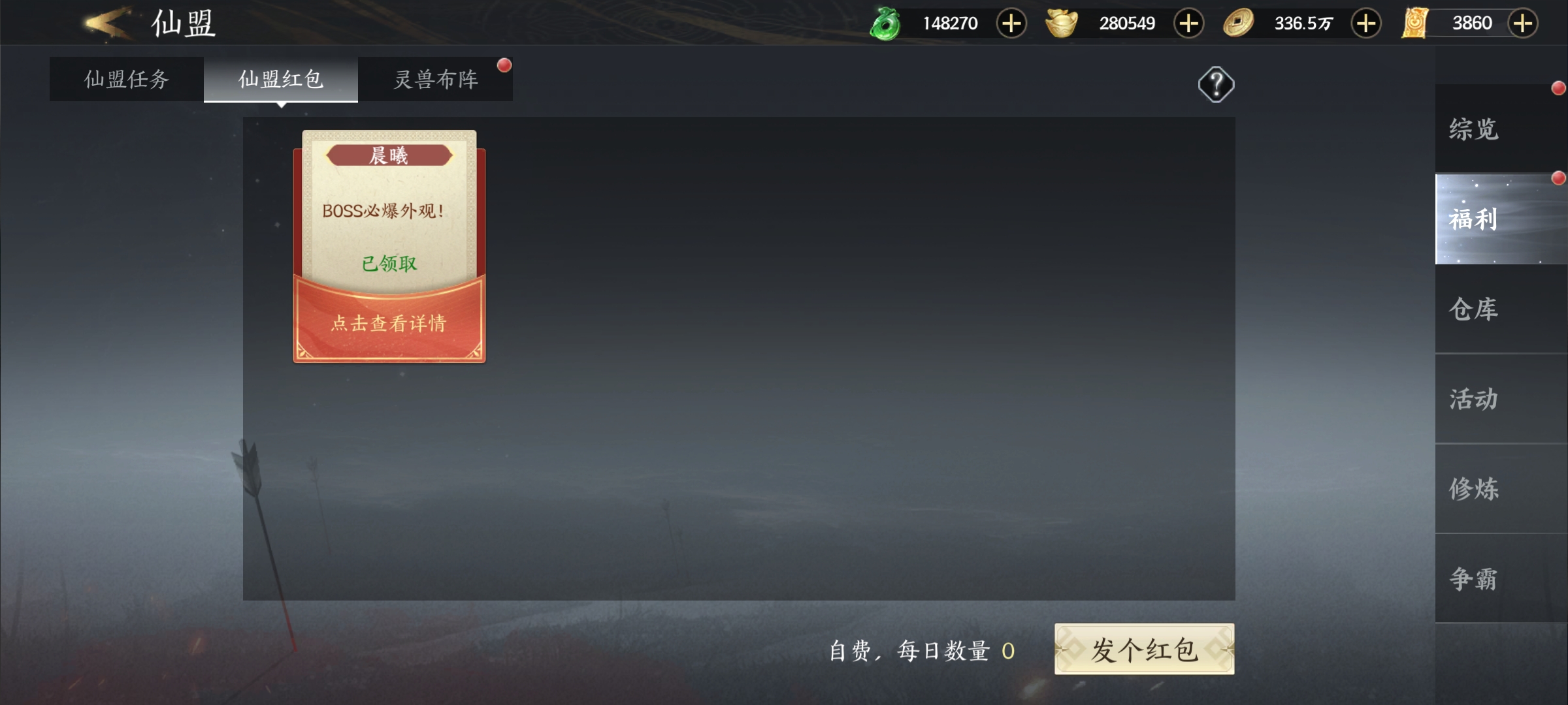 挑战类任务 + -+仙盟试炼:完成3次仙盟试炼,奖励1万仙盟贡献+50元宝,每日必做! -+仙盟争霸:完成1次仙盟争霸,奖励稀有英雄碎片+100元宝,团战狂欢,战力比拼! + 推荐类任务 + -+仙盟悬赏:完成70次仙盟悬赏,奖励10个套装石碎片+100元宝,海量养成资源! + 交互类任务 + -+仙盟守护:完成2次仙盟守护,奖励3万仙盟贡献+50元宝,守护仙盟,共御外敌! -+仙盟夜宴:完成4次仙盟夜宴,奖励2个高级宝石+50元宝,休闲互动,福利满满! -+发个红包:完成3次发红包,奖励1万仙盟贡献+50元宝,仙盟互动,热闹非凡! 🧧+仙盟红包:福利狂欢,双倍领取 + 红包类型 + -+系统红包:玩家达成指定条件,24小时内可手动发送,超时系统自动发送;发送后自动领取,不计入领取上限! -+主动红包:玩家可自定义金额发送,每日最多1次,0点重置次数;发送后自动领取,不计入领取上限! + 领取特权 + -+领取金额随机,VIP6玩家可双倍领取! -+非VIP6玩家错过的双倍部分自动积累,激活VIP6可一次性全部领取,福利不浪费