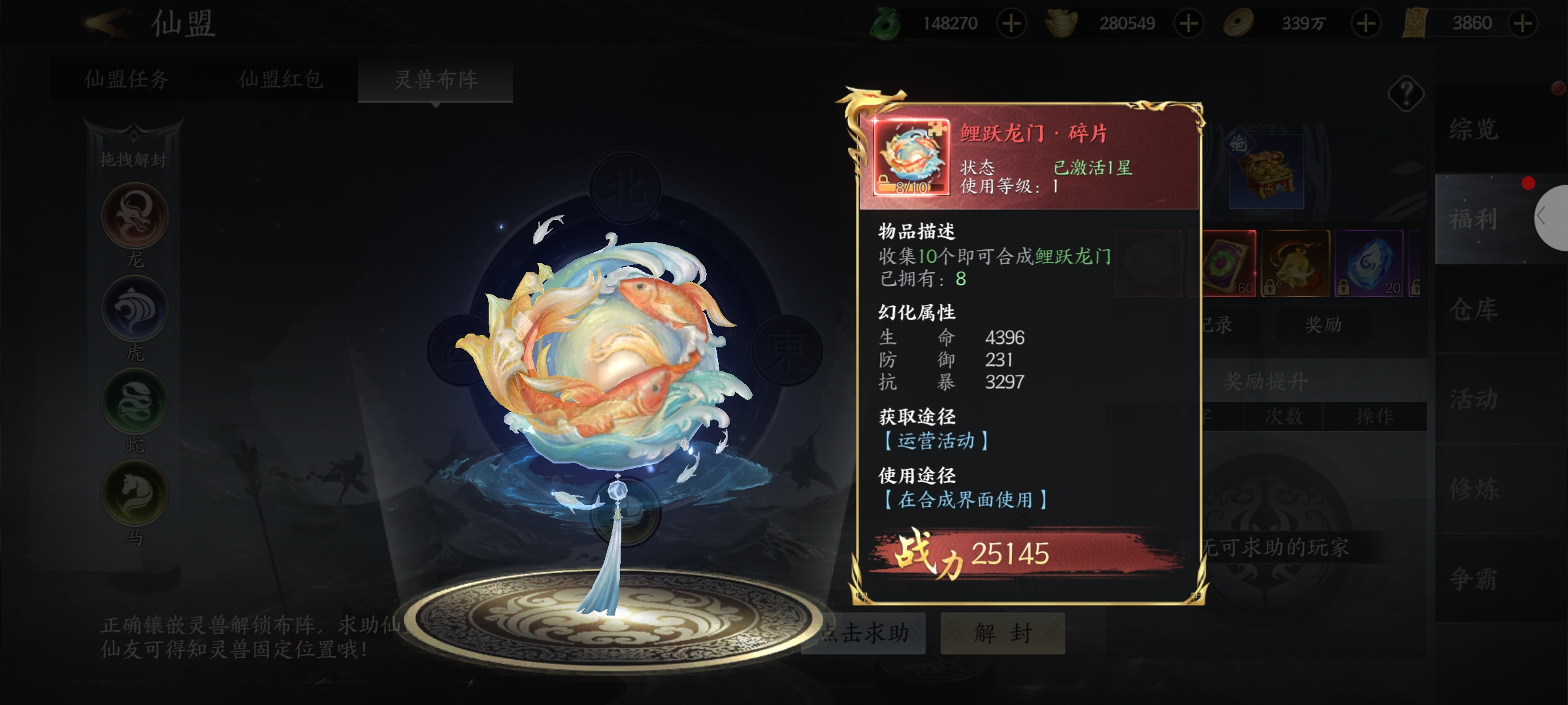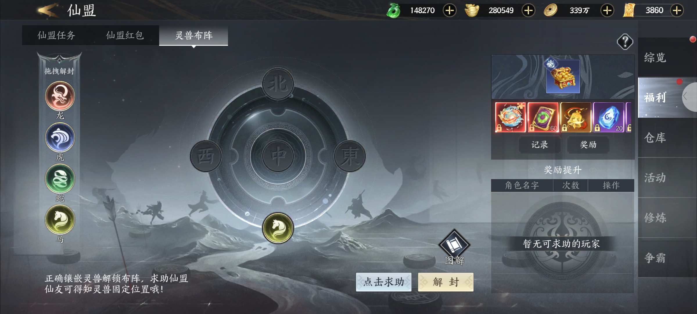 【仙盟灵兽布阵玩法!】 一、解封规则 + 1. 每日免费福利:每位玩家每日可免费获得1次布阵解封奖励,零门槛领福利! 2. 品质决定奖励:阵位图品质分为「凡、绝、仙、神」四档,品质越高,解封后奖励越丰厚! 3. 求助刷新机制:对当前阵位品质不满意?可向仙盟成员请求刷新,有概率刷出更高品质的布阵! 4. 互助次数限制:每位玩家每日有5次帮助他人刷新的机会,互帮互助,共赢奖励! + 二、开启规则 + 1. 解封布阵需置入阵位解封,所有品质的布阵解封阵位完全相同。 2. 每次获取布阵时,系统会随机解封1个解封阵位。 3. 可求助仙盟成员或其他玩家,获取布阵的其他阵位,快速解锁完整大阵! 4. 每日限制:每日仅能解封1次布阵,解封后无法更换布阵品质。 5. 重置时间:每日零点重置布阵阵位,新的一天,新的福利! + 🎁+丰厚奖励一览 + 参与灵兽布阵玩法,可获得: + -+珍稀道具、养成材料 -+高价值宝箱、强化资源 -+绝版幻化(如「鲤跃龙门」等强力外观,提升战力+颜值双在线) -+仙盟专属福利,助力仙盟成长!