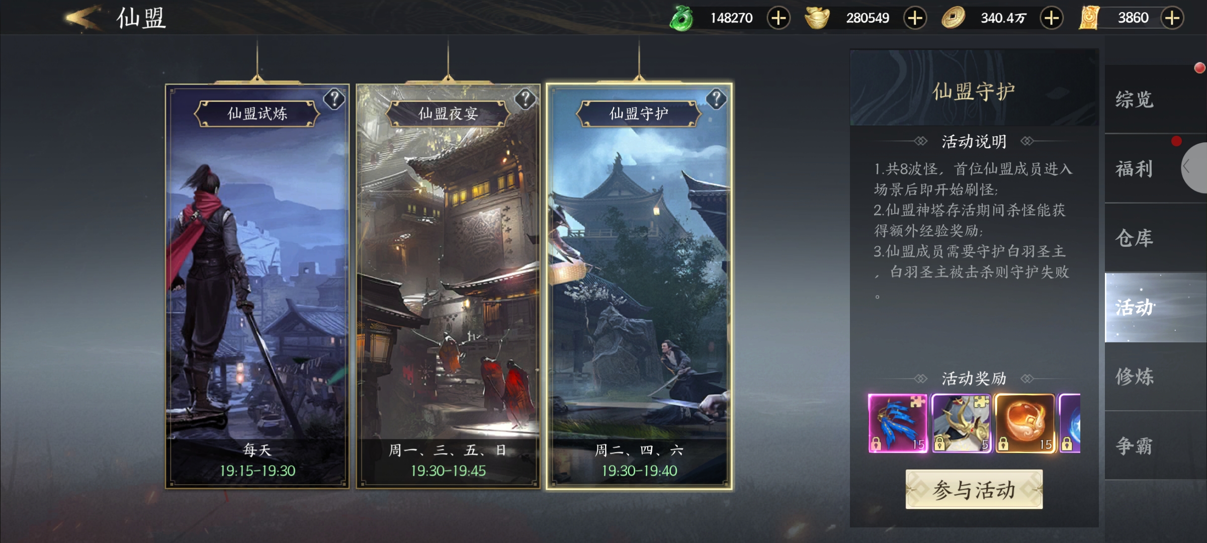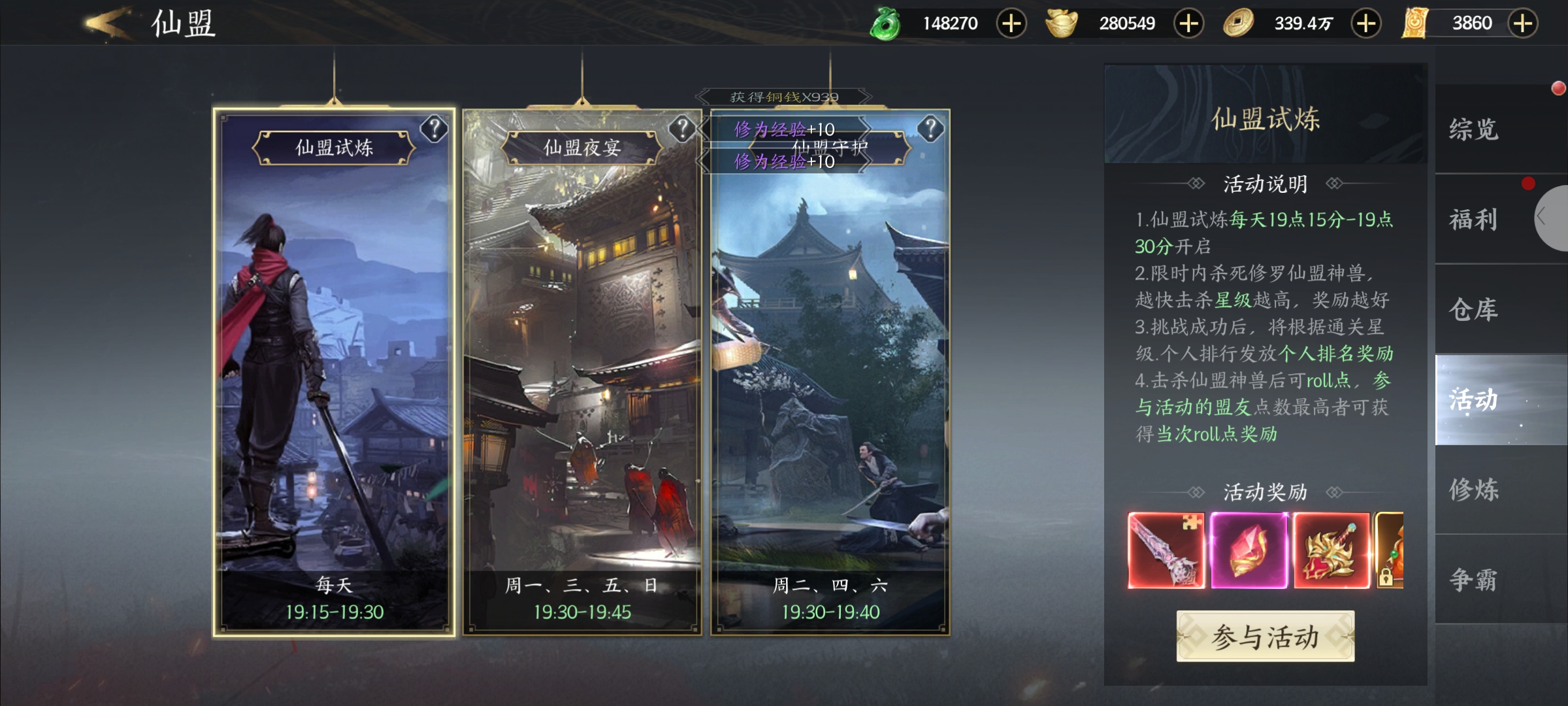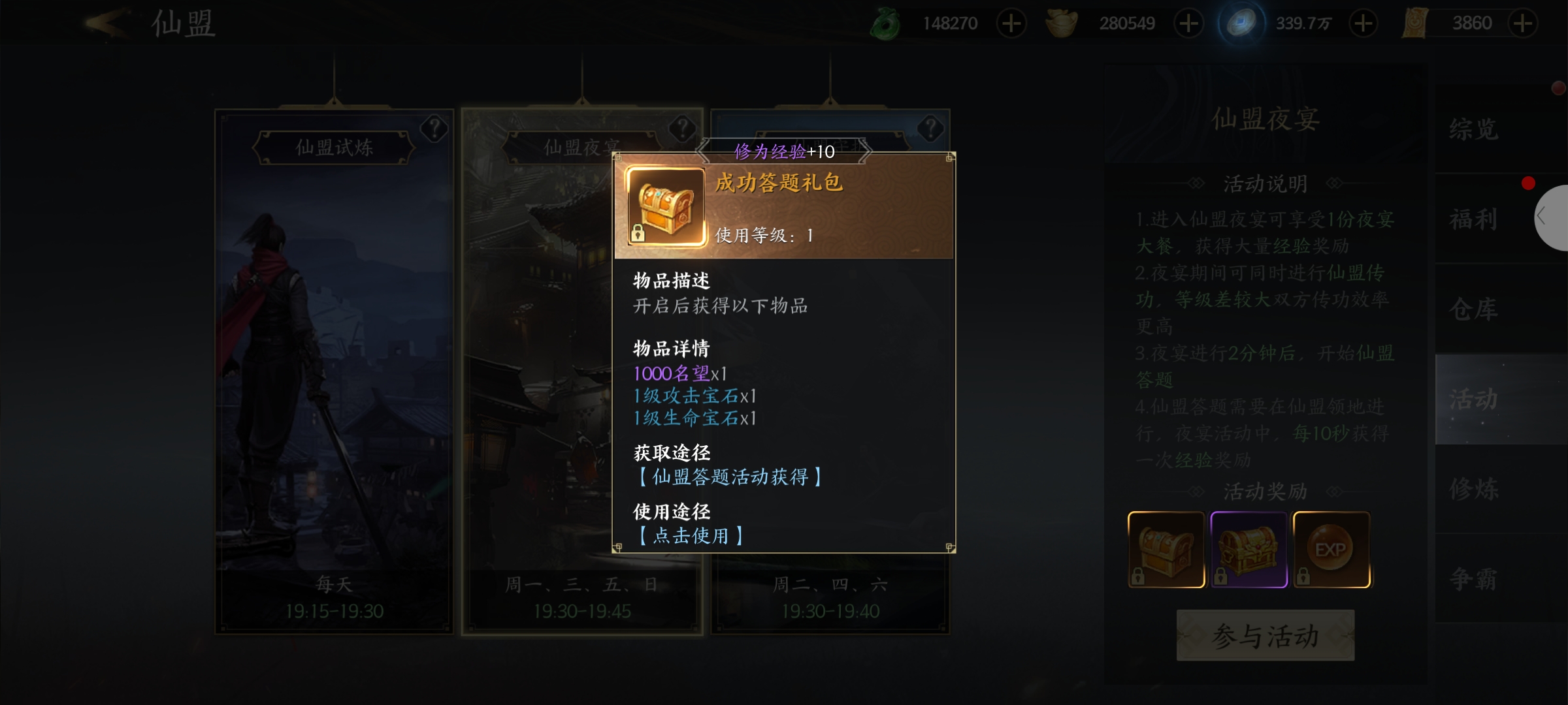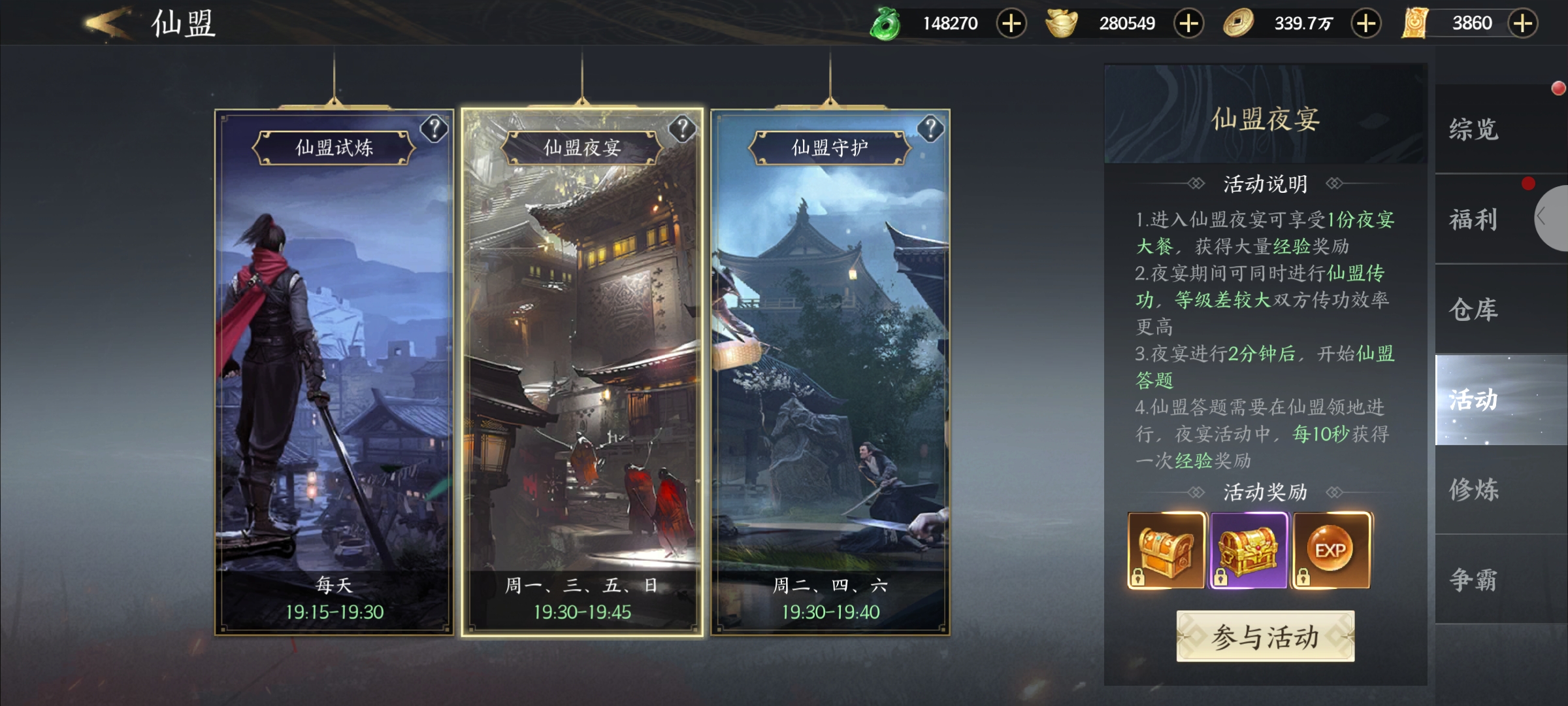 ⏰+活动时间 + 每周+一、三、五、日+19:30-19:45,限时15分钟,错过不补! + 🎯+核心玩法规则 + 1. 挂机领经验:进入仙盟夜宴即可享受1份夜宴大餐,活动期间每10秒自动获得一次经验奖励,全程挂机躺平升级! 2. 仙盟传功:夜宴期间可与仙盟成员进行传功,等级差较大的双方传功效率更高,快速拉平等级,助力萌新飞速成长! 3. 仙盟答题:夜宴开启2分钟后,正式开启仙盟答题环节,需在仙盟领地内参与答题,答对即可获得丰厚奖励! 4. 奖励机制:全程参与即可领满经验,答题赢取额外宝箱,传功加速升级,福利多到拿不完! 🎁+丰厚奖励一览 + -+海量经验:全程挂机自动涨经验,快速提升等级,轻松追上大部队 -+答题礼包:成功答题礼包,内含1000名望、1级攻击宝石、1级生命宝石等养成资源 -+传功福利:传功额外经验加成,等级差越大,收益越高