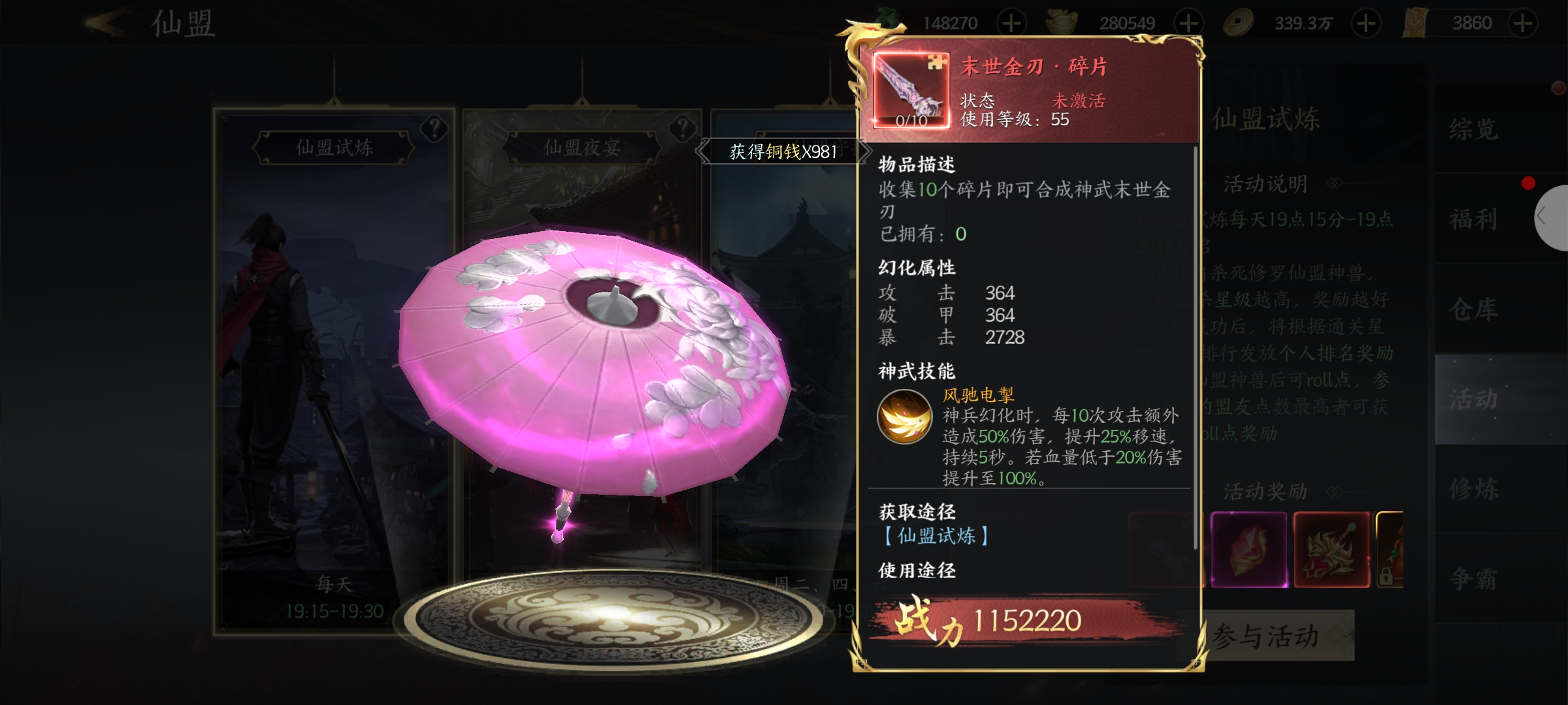 ⏰+活动时间 + 每日+19:15-19:30+准时开启,限时15分钟,错过不补! + 🎯+核心玩法规则 + 1. 限时挑战:活动期间内击杀修罗仙盟神兽,击杀速度越快,通关星级越高,最终奖励越丰厚! 2. 排名奖励:挑战成功后,将根据通关星级+个人排行,发放专属个人排名奖励! 3. roll点抽奖:成功击杀仙盟神兽后,全盟开启roll点,参与活动的仙友中,点数最高者可获得当次roll点大奖! 4. 奖励机制:星级越高、排名越靠前,奖励越豪华,人人都有参与奖,欧皇更有专属惊喜! -+极品神武碎片:「末世金刃」(伞形神兵,专属技能「风驰电掣」,攻击额外增伤、提速,残血伤害拉满,战力直接飙升115W+) -+养成材料:海量强化资源、进阶道具、铜钱等 -+roll点专属奖:稀有道具、高价值宝箱 -+排名奖励:专属称号、珍稀材料,助力快速成长