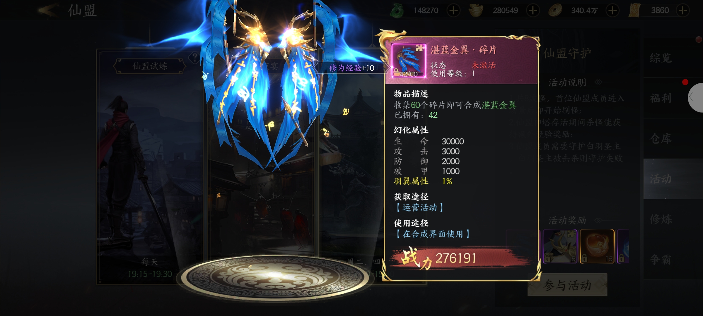 各位仙友,仙盟团队协作活动「仙盟守护」正式开启!每周固定时段,携手仙盟伙伴共抗8波怪潮,守护白羽圣主,赢取海量奖励与极品羽翼,速来参战! ⏰+活动时间 + 每周+二、四、六+19:30-19:40,限时10分钟,错过不补! + 🎯+核心玩法规则 + 1. 8波怪潮挑战:首位仙盟成员进入场景后,即刻开启刷怪,共8波怪物来袭,全员合力清怪! 2. 守护核心目标:仙盟成员必须全程守护白羽圣主,若圣主被击杀,则守护失败,无法领取完整奖励! 3. 额外经验加成:仙盟神塔存活期间,击杀怪物可获得额外经验奖励,神塔存活越久,收益越高! 4. 奖励机制:成功守护圣主通关,即可领取对应奖励,杀怪越多、神塔存活越久,奖励越丰厚! 🎁+丰厚奖励一览 + -+极品羽翼:「湛蓝金翼」碎片(收集60个可合成完整羽翼,战力直接飙升27W+,全属性加成拉满) -+海量经验:杀怪基础经验+神塔存活额外经验,快速升级,轻松追级 -+养成道具:各类珍稀材料、宝箱、养成资源,助力角色成长 -+专属外观:湛蓝金翼高颜值幻化,提升战力同时,外观拉满