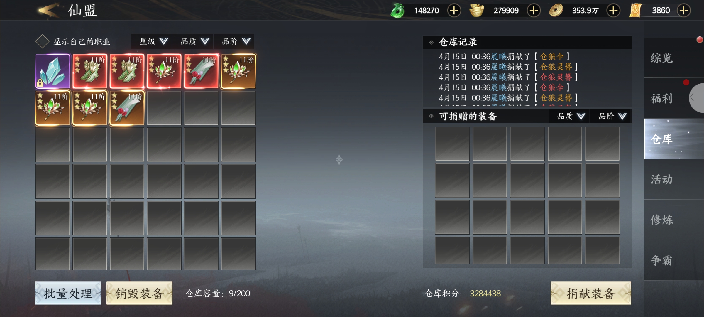 🎯+核心玩法规则 + 1. 装备捐献:将自己闲置、多余的装备,捐献至仙盟仓库,为仙友提供助力,同时获得仓库积分! 2. 积分获取:每捐献一件装备,即可获得对应仓库积分,积分可用于兑换各类珍稀道具、养成资源! 3. 装备申领:仙盟成员可在可捐赠装备栏,申领其他仙友捐献的装备,快速补齐毕业装,提升战力! 4. 仓库管理:支持按星级、品质、品阶筛选装备,批量处理、销毁闲置,轻松扩容个人仓库! + 🎁+玩法福利一览 + -+仓库积分:捐献装备累计积分,可兑换高价值道具、强化材料、养成资源 -+装备互助:快速获取毕业装备,不用反复刷本,零成本提升战力 -+仙盟成长:资源循环利用,仙盟全员快速成型,提升整体实力 -+仓库扩容:清理个人闲置装备,释放仓库空间,告别背包爆满 + 💡+玩法小贴士 + -+优先捐献高品阶、高星级的闲置装备,获取更多仓库积分 -+定期查看可捐赠装备栏,申领自己需要的装备,快速毕业 -+批量处理重复、闲置装备,保持个人仓库整洁 -+积极参与互助,助力仙友成长,提升仙盟凝聚力