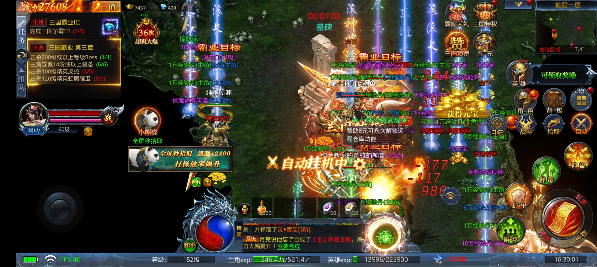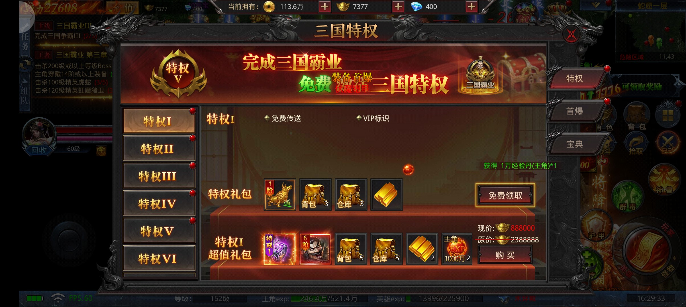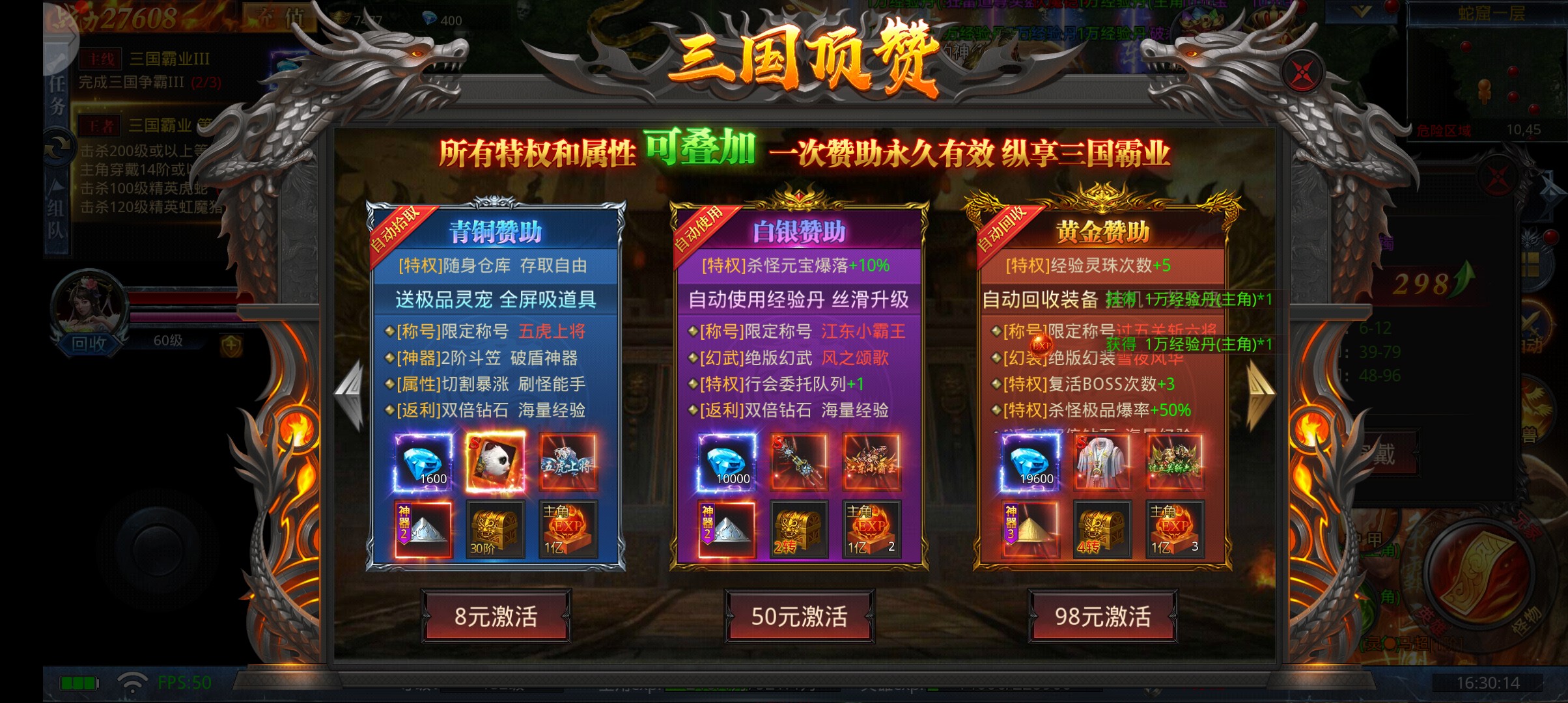 小小诀窍,不走弯路 【初遇传奇】开服后第一时间进入游戏,跟着主线以及三国霸业任务走,可以获得大量经验,三国霸业是成为大神重要捷径,完成三国霸业任务,还可以获得真实充值红包 【小氪一波】开启8元赞助达成首充条件,领取首充神兵奖励,当天即可领取专属的神兵和小熊猫,获得切割伤害属性和全屏吸效果,打怪效率飙升 【小有成就】打算长期玩的玩家,可以开通三国顶战的特权服务,一次开通,永久享受,送的灵宠,幻武,幻装,英雄幻化四阶斗笠都可即时快速提升战力,同时获得高额切割伤害属性,自动回收装备和一键扫荡任务和副本特权,挂机打怪和日常任务效率都很高,使用三国顶赞获得的钻石购买霸服礼包,让你体验打怪如切菜的快感
