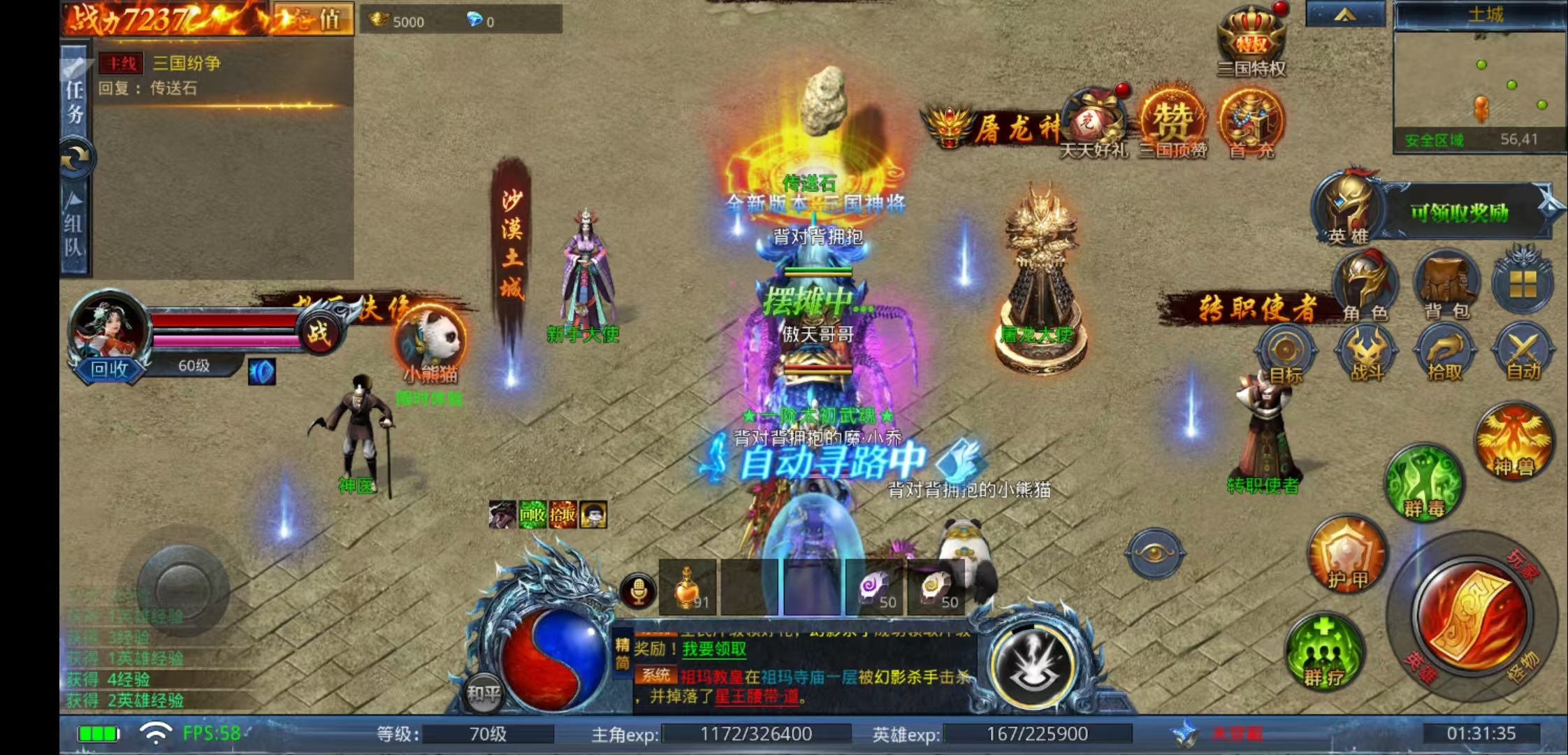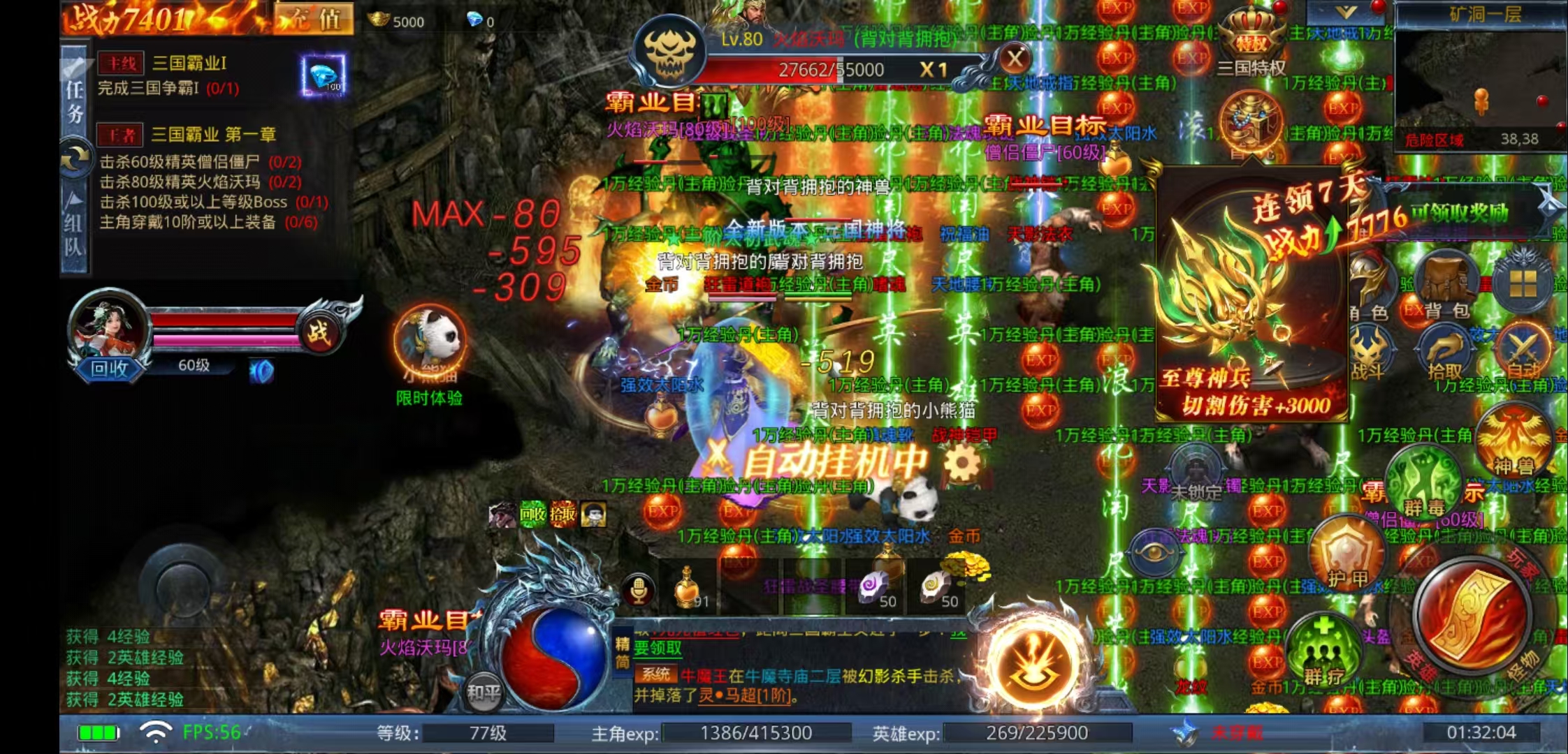 通过首充一次+连领七天”活动,8元即可获取绝版至尊神兵,切割伤害+3000)、“三国顶赞”(青铜、白银、黄金赞助分别花费8元、50元、98元,可获得限定称号、绝版幻武、超高爆率加成)等付费途径,能快速获得大量钻石、经验丹、极品灵宠等资源,资源获取效率呈几何级提升。可以通过日常任务、打怪掉落和免费活动获取资源。而首充的“传奇神杖·法神”、顶赞的“绝版幻装”等极品装备,前期就能拥有高额切割伤害和属性加成;再通过付费资源快速升级装备、镶嵌宝石,短时间内就能达成“全身10阶+”的毕业水准。野外地图刷怪,掉落装备逐步合成、强化;通过“装备回收”系统兑换材料,提升装备等级每一次提升都充满成就感。优先完成经验收益高的日常任务,组队挑战精英怪来提升效率...游戏里打怪满屏爆经验丹,技能特效拉满,还有传送石、摆摊等玩法,是经典传奇风的爽快体验...