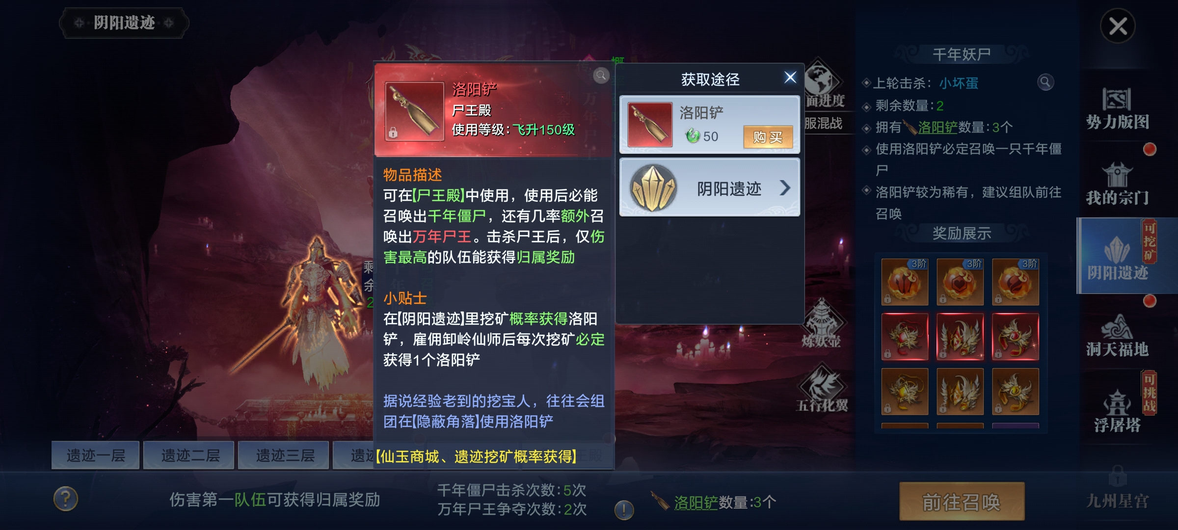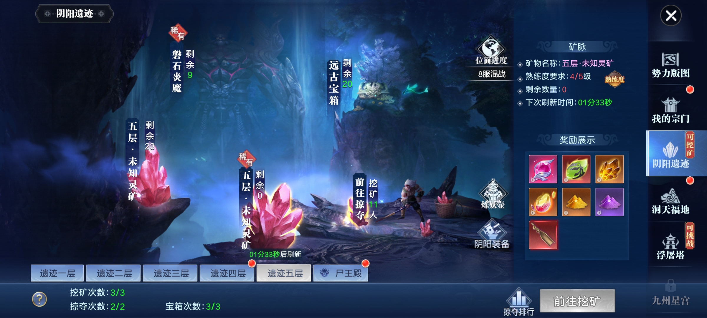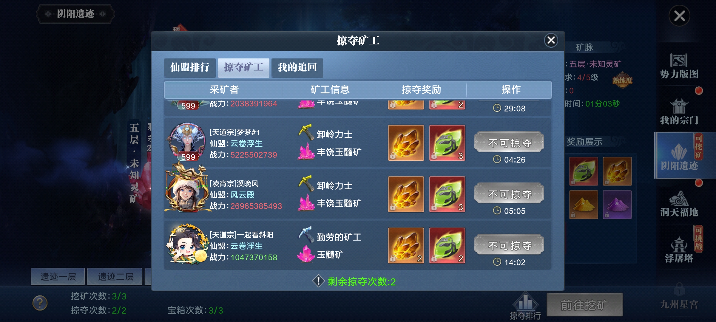 阴阳遗迹是采矿玩法,分为挖矿、掠夺、宝箱/BOSS,遗迹共5层,每层矿物需对应熟练度,靠打造阴阳装备提升;每日10-1点整点刷新矿石,默认每日可挖2次,每次60分钟,开通特权可免费雇佣“卸岭力士”,额外+1次挖矿次数且耗时更短、收益更高;矿工离线也会自动采矿,需领完当前奖励再开下一次。 可挑战其他矿工的雇主来抢夺其产物,每个矿工仅能被抢1次;被掠夺后可自行或请求仙盟成员挑战掠夺者追回奖励,矿工采矿时有概率刷出宝箱,每日可开3次,需自行寻找;采矿结束后可能刷出BOSS,击杀得珍稀材料,每日限10次,建议组队参与,最后一击队伍获得掉落归属。 +