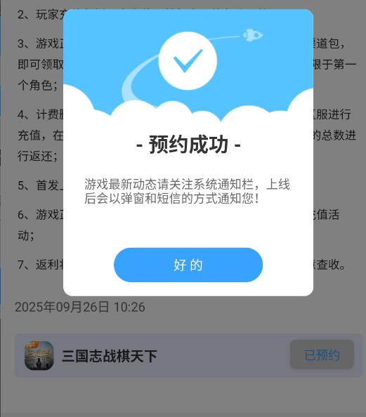 《三国志战棋天下》将于9月30日10:00上线,疯狂福利,参与活动赢福利代金券!现在参与预约活动不仅可以第一时间收到上线消息提前体验,参与活动即有机会获得30-10元代金券奖励!只要在本帖下方评论区按要求发送截图以及前往《三国志战棋天下》社区发帖分享体验心得,小咖已为各位咖友准备好各种社区好礼!【活动时间】即日起-10月8日【参与方式】1)在本帖评论区分享预约游戏或首发后体验游戏截图或五星好评截图、评论,即可参与~2)预约体验游戏后,前往社区发帖,围绕《三国志战旗天下》游戏为主题进行相关创作,可以视频/图文形式进行,内容可参考但不仅限于以下内容:1.游戏攻略/武将搭配分享;2.游戏玩法细节挖掘分享;3.游戏整体评测分享;温馨提示:发帖作品标题前缀需要携带“三国志战旗天下”字样,否则视为无效处理;作品内容不得使用AI创作或是网络内容搬运,一经发现取消活动评选资格;视频不得低于30秒,图片≥两张,文字数≥50字,以上三个条件满足其中之二即可;【活动奖励】一)精英体验礼:有效评论中随机抽5位咖友赠送30-10元代金券奖励!预约集结礼:有效评论中随机5位咖友获得15咖币集结奖励!(有效参与人数每增加30人集结礼奖励加3份)二)一等奖:真实阅读量、点赞量、评论量相加最高的有效发帖作品的咖友可获得刻度二两酒杯;参与奖:凡是有效发布活动参与帖的咖友均可获得15咖币。(已获得一等奖的不再参与本奖项)【温馨提示】1、活动结束后,3个工作日内在原帖公布获奖名单,7个工作日内发放奖励;2、不符合活动要求或者违反社区行为规范使用AI创作的发稿将取消获奖资格;3、活动期间到奖励发放完毕前,请咖友们不要更改昵称或删评论,避免奖励发放失败:4、每个账号仅可获奖一次;5、本次活动解释权归《大咖玩》运营团队所有。