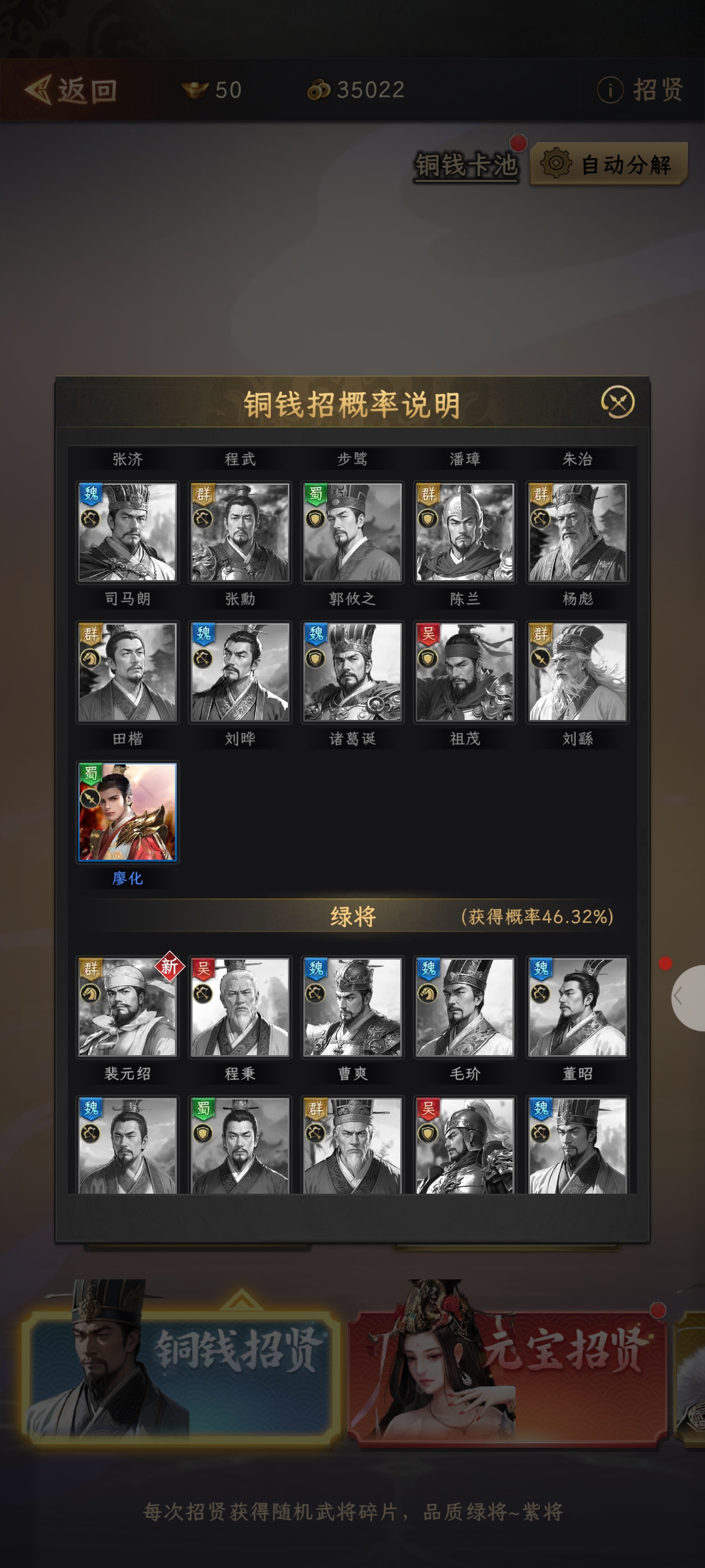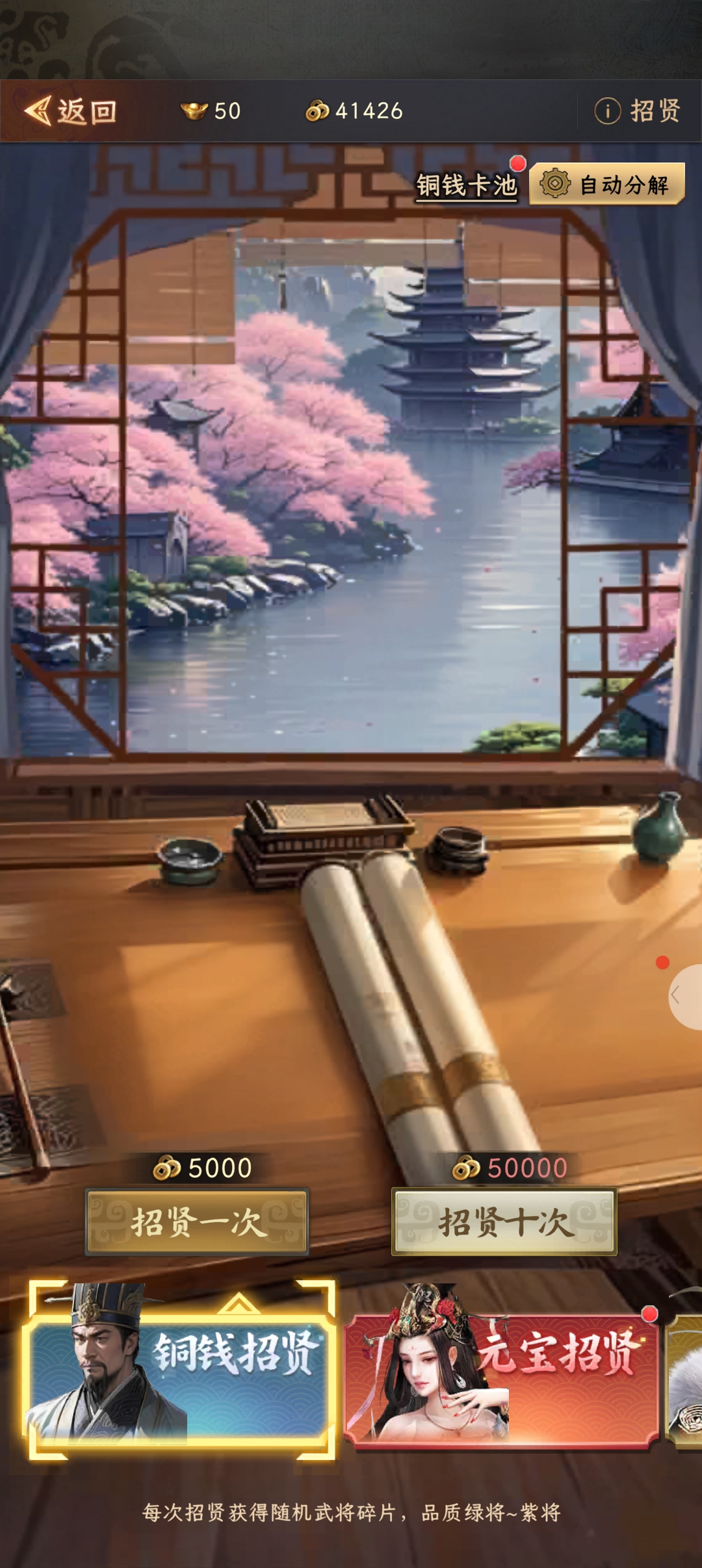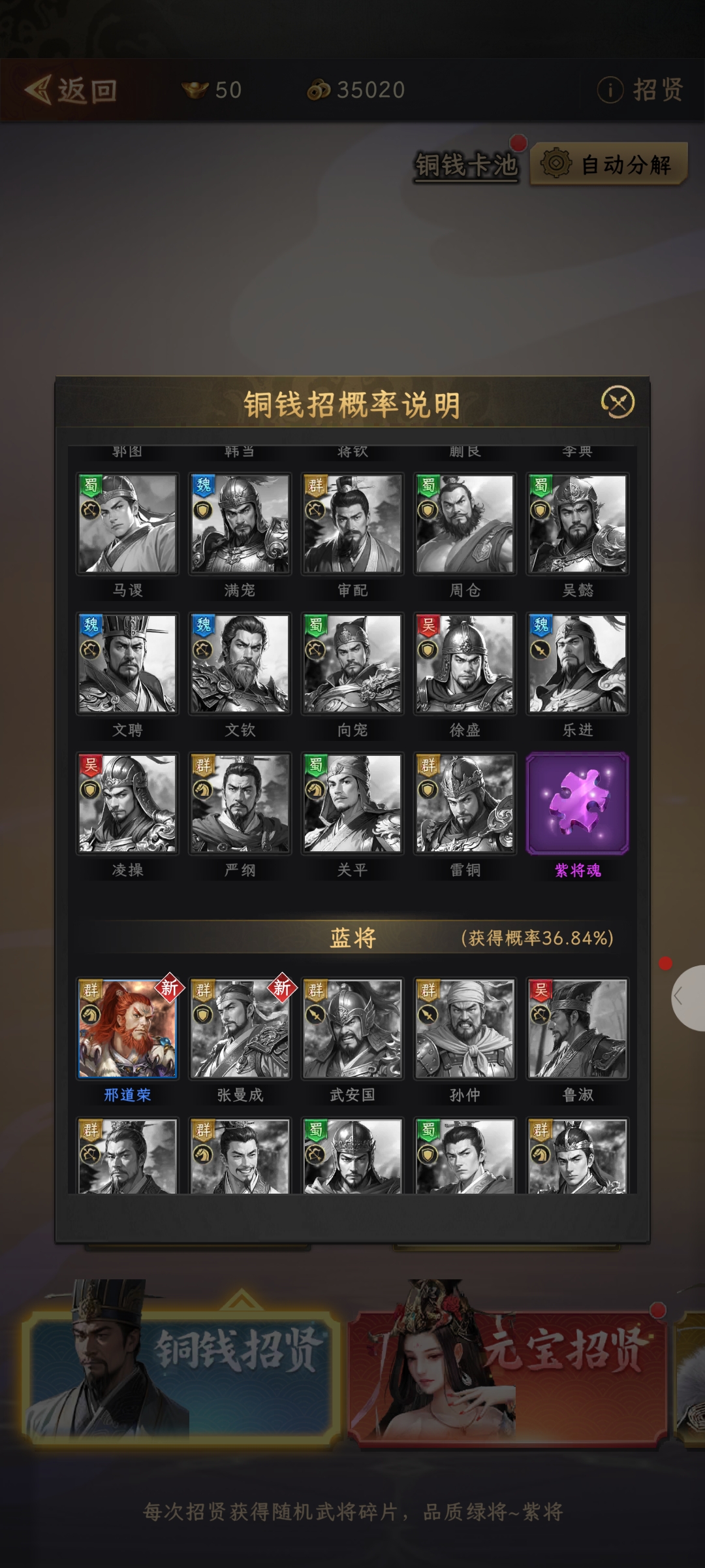 三国志战旗天下中招贤界面古意盎然,铜钱、元宝、金将卡池可供选择,玩家可招募廖化、邢道荣等武将,金将卡池更有吕蒙、夏侯渊等名将,概率公示清晰透明。武将培养系统丰富,可提升等级、觉醒突破,像邢道荣觉醒后能提升兵种移动力,廖化凭借出色属性成为战力担当。战斗场景如阳平关之战,玩家排兵布阵,指挥邢道荣、廖化等武将与敌军交锋,战旗玩法策略感拉满。在这款三国题材游戏里,策略与养成的魅力交织得淋漓尽致。招贤界面古色古香,铜钱、元宝、金将三种卡池供玩家招纳良将,廖化、邢道荣等武将各具特色,金将卡池里吕蒙、夏侯渊等名将更是战力担当,概率公示让抽卡更透明。武将培养系统深度十足,升级、觉醒、突破等玩法一应俱全。邢道荣觉醒后能提升兵种移动力,廖化凭借优秀的基础属性在战场崭露头角。