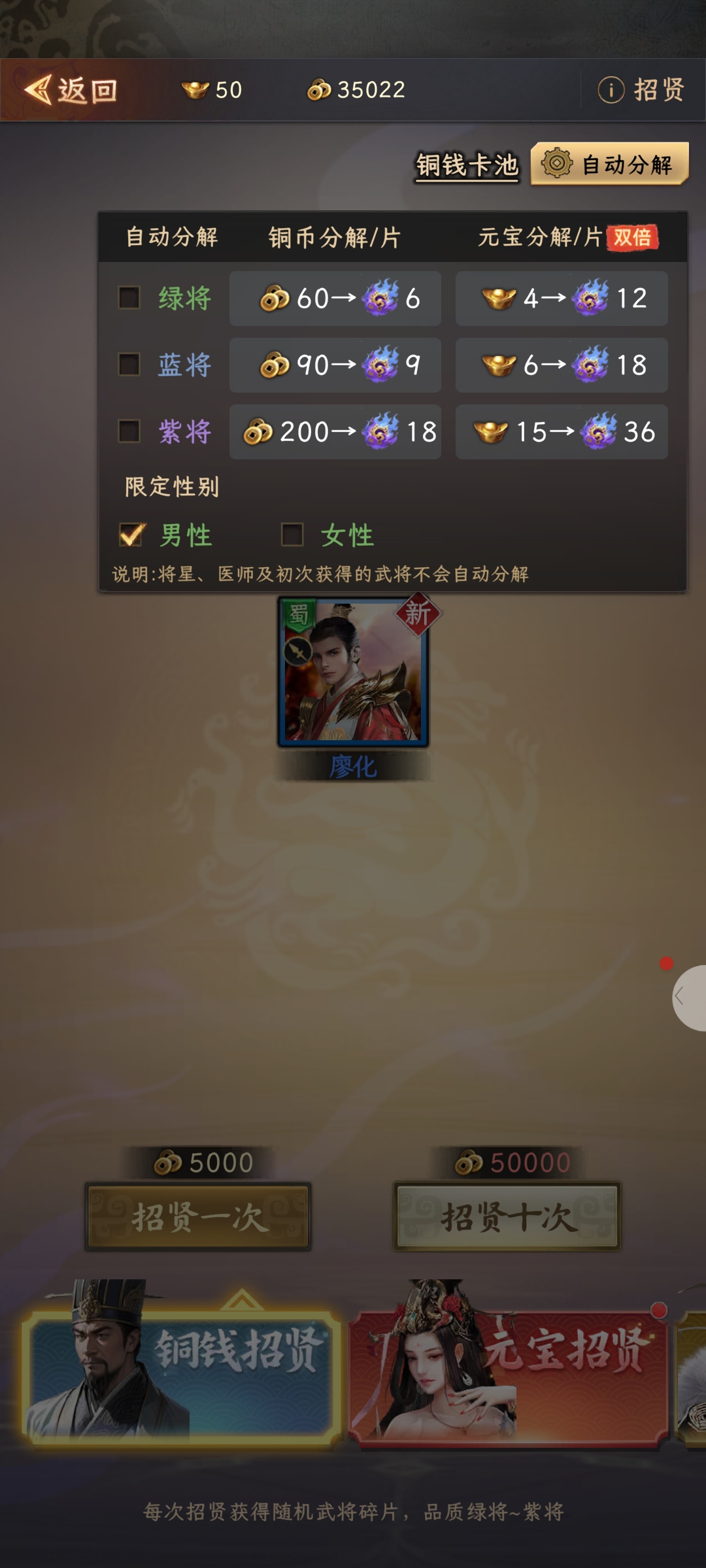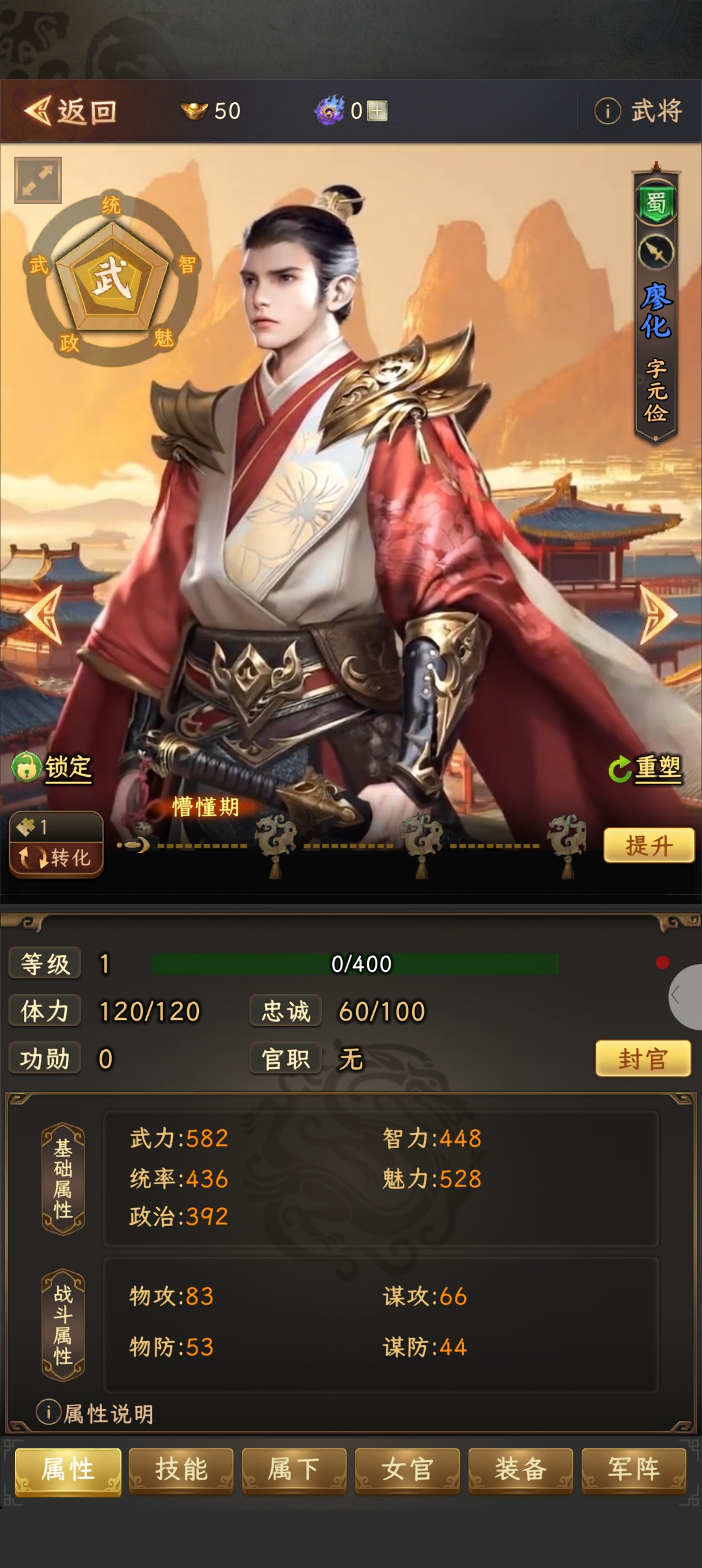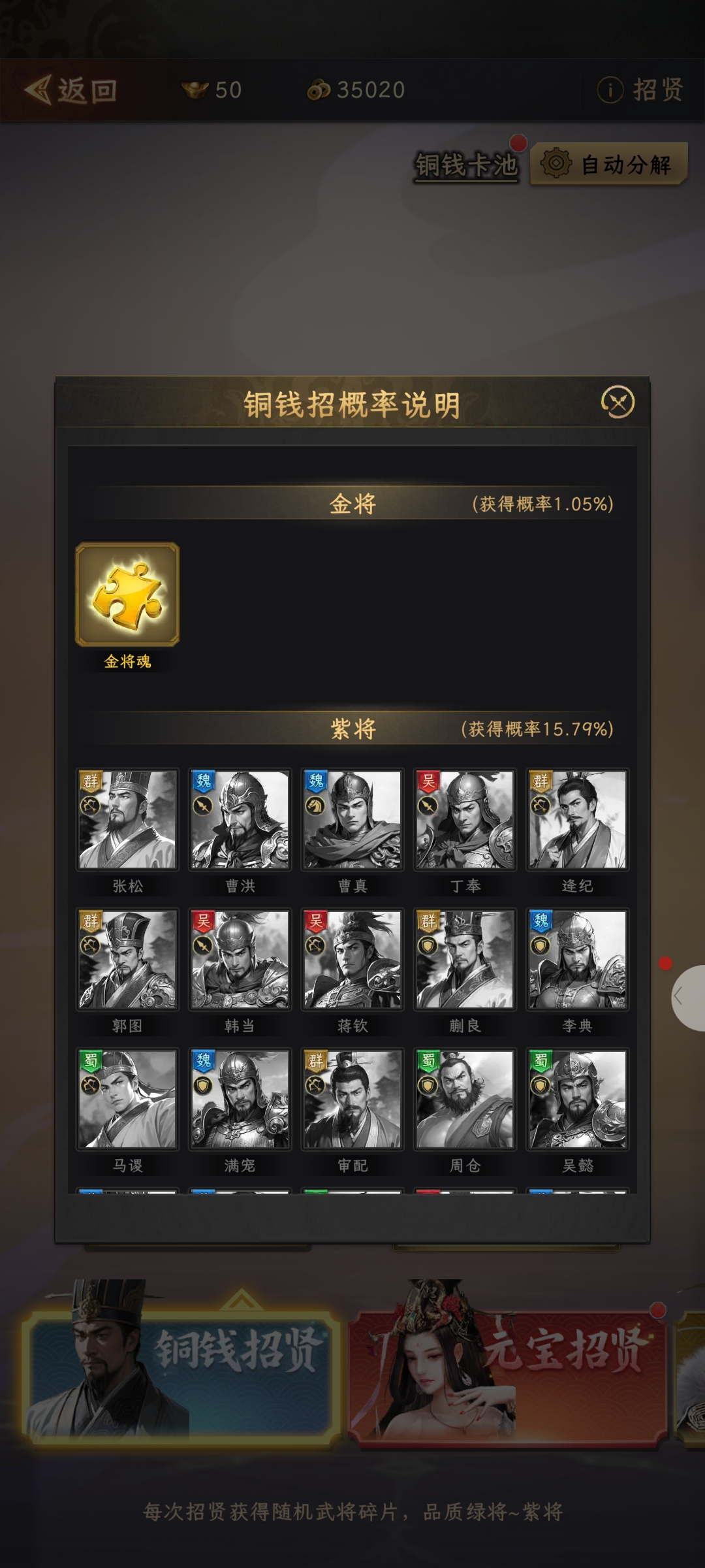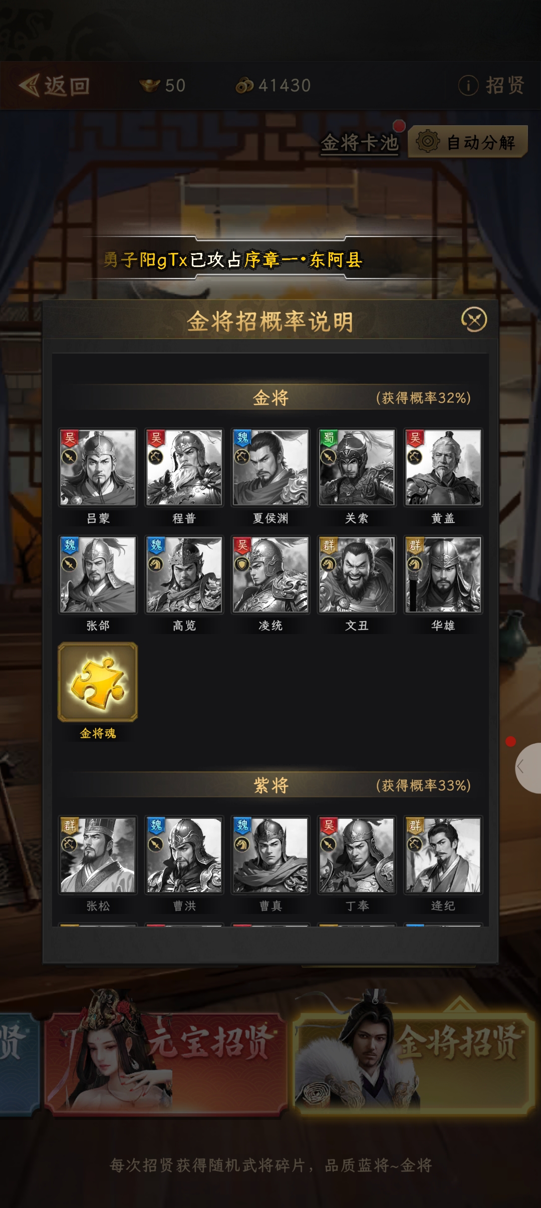 三国志战旗天下中招贤界面古意盎然,铜钱、元宝、金将卡池可供选择,玩家可招募廖化、邢道荣等武将,金将卡池更有吕蒙、夏侯渊等名将,概率公示清晰透明。武将培养系统丰富,可提升等级、觉醒突破,像邢道荣觉醒后能提升兵种移动力,廖化凭借出色属性成为战力担当。战斗场景如阳平关之战,玩家排兵布阵,指挥邢道荣、廖化等武将与敌军交锋,战旗玩法策略感拉满。在这款三国题材游戏里,策略与养成的魅力交织得淋漓尽致。招贤界面古色古香,铜钱、元宝、金将三种卡池供玩家招纳良将,廖化、邢道荣等武将各具特色,金将卡池里吕蒙、夏侯渊等名将更是战力担当,概率公示让抽卡更透明。武将培养系统深度十足,升级、觉醒、突破等玩法一应俱全。邢道荣觉醒后能提升兵种移动力,廖化凭借优秀的基础属性在战场崭露头角。